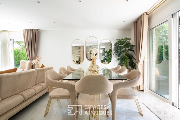 From the moment you enter, the atmosphere is striking: polished stone floors, powdery colours, a high-end feel and omnipresent light reveal an interior that has been treated with the utmost care. The vast living space, which runs through the property and is bathed in light, plays on transparency and reflections. It features a cosy lounge facing an integrated screen wall, a convivial dining room and a contemporary open-plan kitchen with minimalist lines and fully equipped. The whole space flows harmoniously into the garden, which is not overlooked, offering a natural and intimate extension on sunny days.