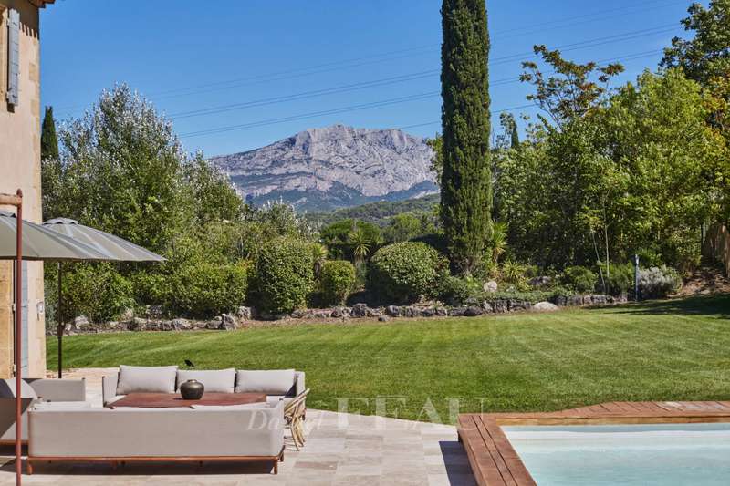This unique property set in a landscaped and wooded 4769 sqm plot is located 5 minutes from the centre of Aix en Provence and faces the iconic Sainte Victoire Mountain. Renovated in 2022 by an interior decorator, it includes a living/reception room with a fireplace, an equipped kitchen, a dining room, eight bedrooms, seven shower room, and a fitness room with a hammam. The gardens feature a superb swimming pool, several terraces, a pool house, and an area for al-fresco dining. With several parking spaces. In a convenient location near the autoroutes and bus lanes.