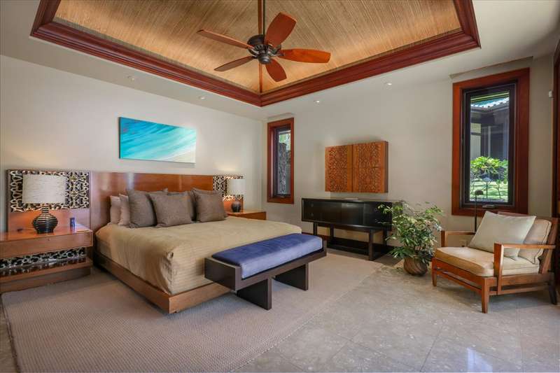 Kilohana sits on a 1.4-acre front-row site at the end of a private drive within the 49 Black Sand Beach neighborhood at Mauna Lani. Honoka’ope Bay, with its black sand beach and private community beach club, is less than a 90 second walk from the home. Overlooking the 7th hole of Mauna Lani’s south course, the property has over 275 feet of frontage on views of the ocean, waves crashing on the shoreline, Maui, and sunsets from four of the bedrooms and all living areas. The improvements are laid out as a small village retreat, with mature landscaping and stone pathways leading to the many private locations on the property, and include a solar field and putting green with a 45-yard pitch to the green. On the south side of the property, adjacent to the golf course buffer, sits the 1,750 square foot ocean view primary suite with a spacious two-station office, two full bathrooms, a large shower garden, and full laundry facilities. On the north side of the property are two detached 3 bedroom, 3 bath, 1,300 square foot guest hale, each with its own laundry facility and between the two hale, are an additional four outdoor shower gardens. The numerous pocket doors throughout beckon you to a 1,656 square foot lanai including a 600 square foot grand covered lanai with wet bar, dining area, sunken barbecue, with smoker and cooktop; almost 8,000 sf of indoor/outdoor living at its best! Large 3 car garage with private entrance, as well. The home was designed by Lucky Bennett and built by Clever Construction to exacting standards, which include mahogany pocket doors, windows, floors and trim, vaulted ceilings, a variety of custom stone and tile used throughout and a lengthy list of designer furnishings and art included in the sale. Meticulously designed and cared for by an owner who is in the real estate development business!