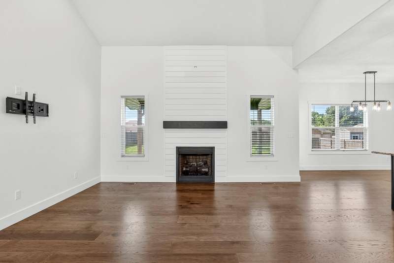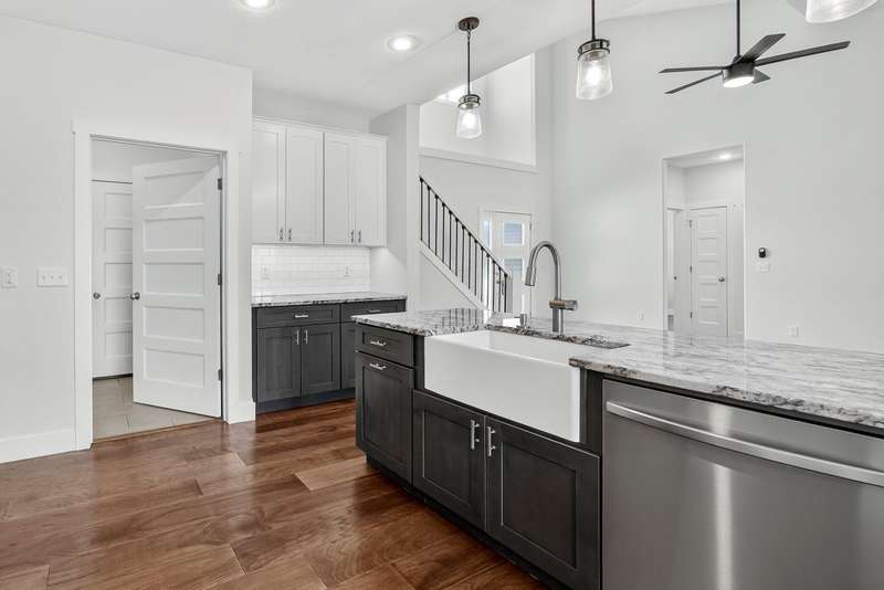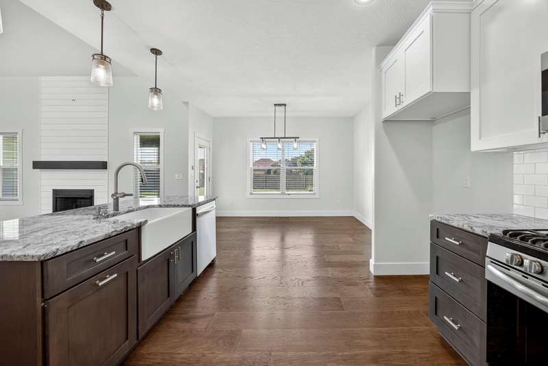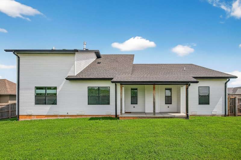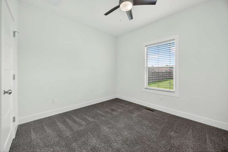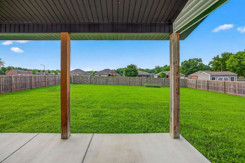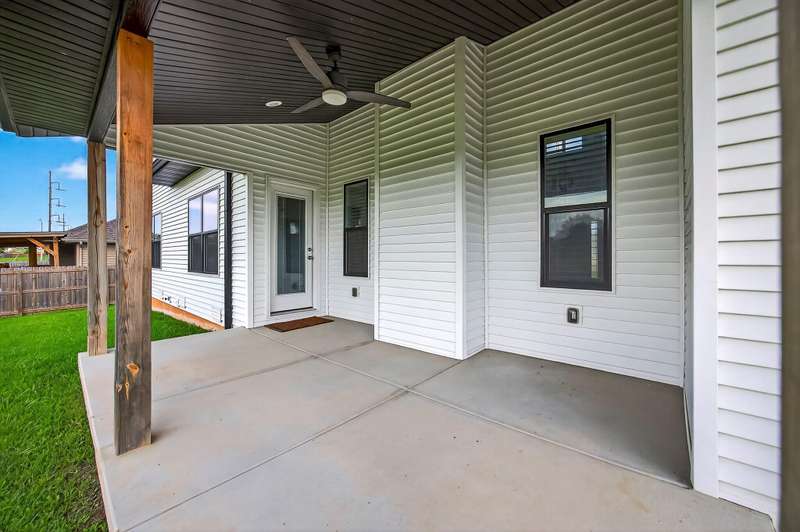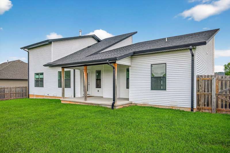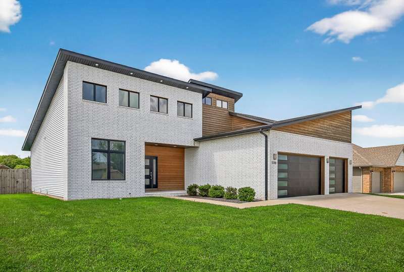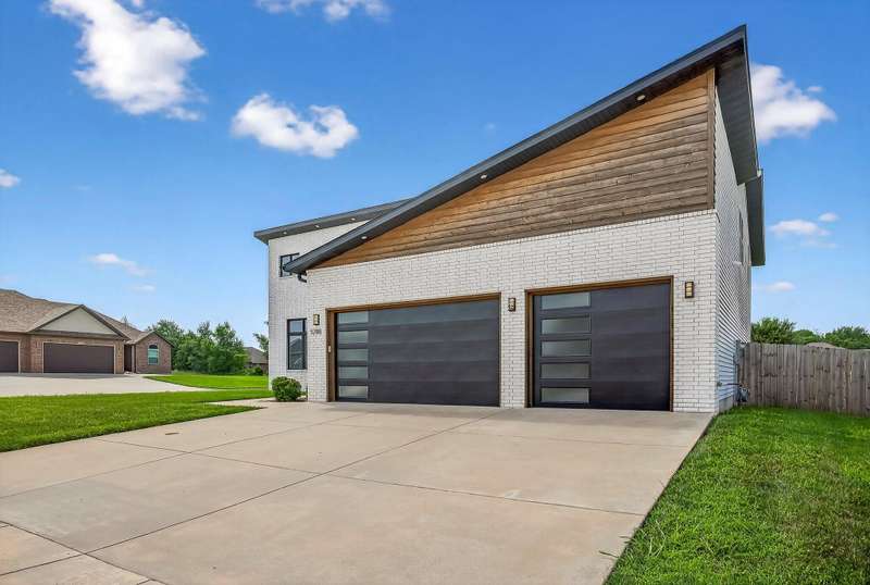 Discover this stunning modern home by Richland Homes, a true standout in the neighborhood. As you approach, the home's striking design immediately catches the eye, with a sleek combination of white brick and dark wood that creates an elegant contrast. The contemporary garage doors perfectly complement the overall aesthetic, while soffit lighting accentuates the inviting front porch adorned with warm wood siding.Inside, the spacious entryway welcomes you with soaring ceilings and natural light pouring in from the loft windows. The focal point of the room is the fireplace, featuring shiplap detailing, which seamlessly flows into the open-concept kitchen and dining area. The kitchen is a chef's dream, with exotic granite countertops offering ample space for both meal prep and casual dining. Under-cabinet lighting highlights the subway tile backsplash, and the farmhouse sink adds character to the space. A clever design feature includes a pantry just off the kitchen.The primary bedroom is tucked away for privacy and provides a generous layout, including a dual vanity with matching granite counters. The luxurious shower with tile flooring and separate tub offer the perfect retreat. Plus, a storm shelter is conveniently integrated into the master closet for added safety. Two additional bedrooms are located on the main floor, with one featuring a dramatic ceiling with wooden beams and plenty of natural light.Upstairs, you'll find a stylish office space with beautiful railings and lighting. A full bathroom and a large bedroom with craftsman-style doors complete the upper level.Step outside to the covered porch, which overlooks a privacy-fenced backyard. A unique feature of this home is the extended yard beyond the fence.