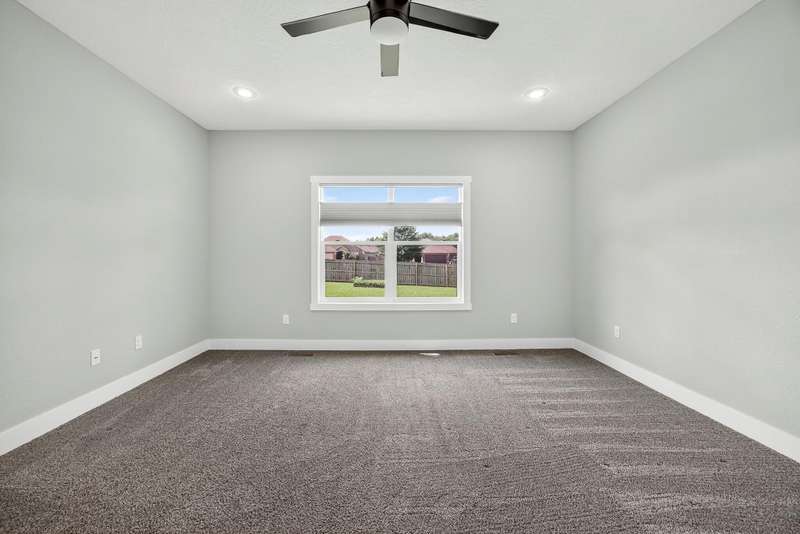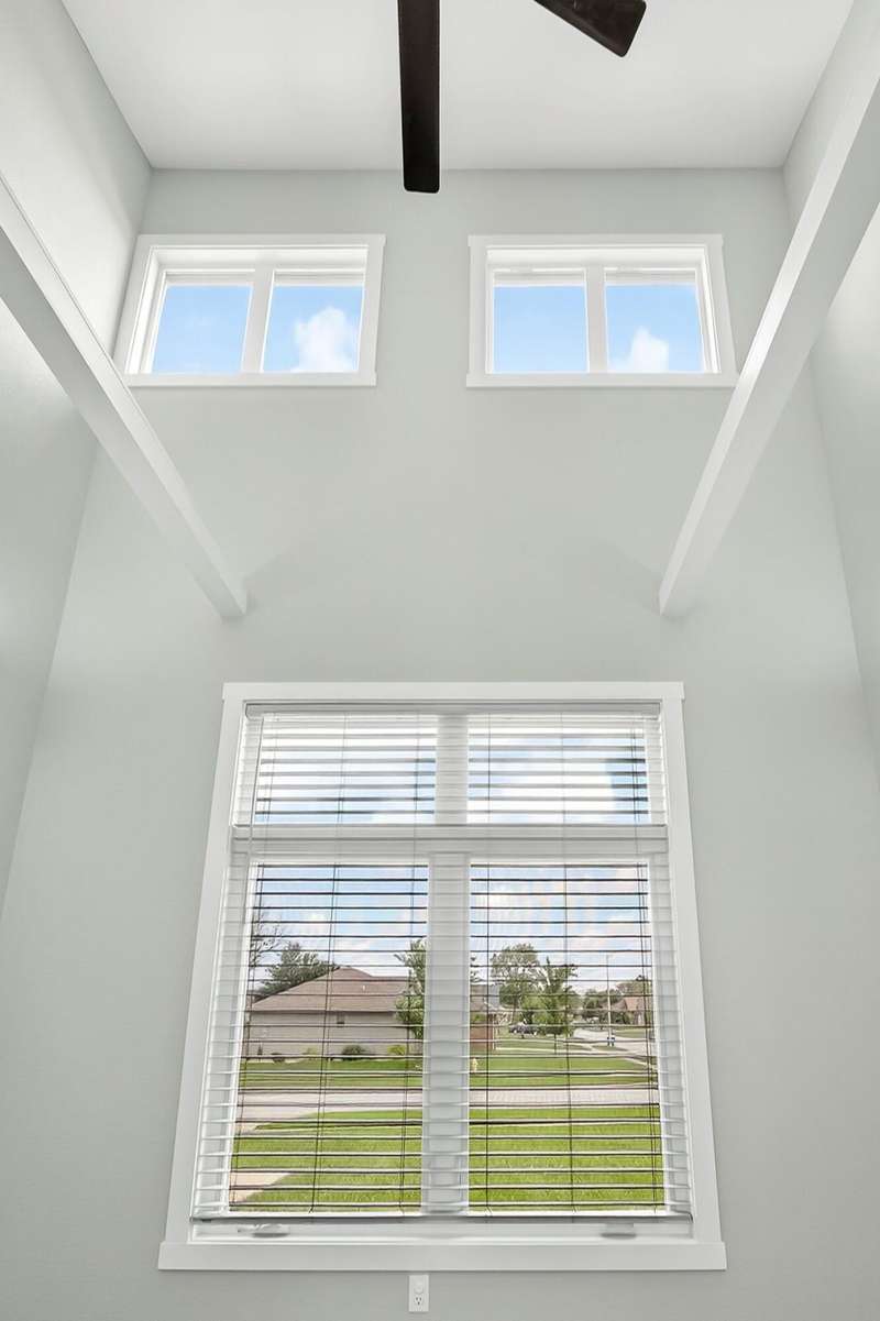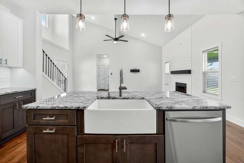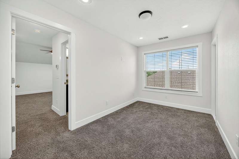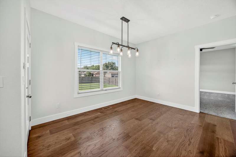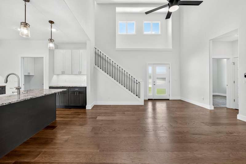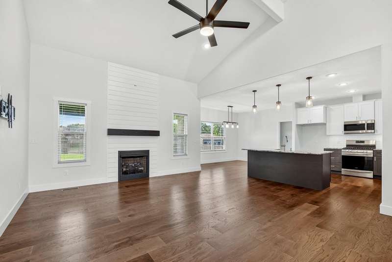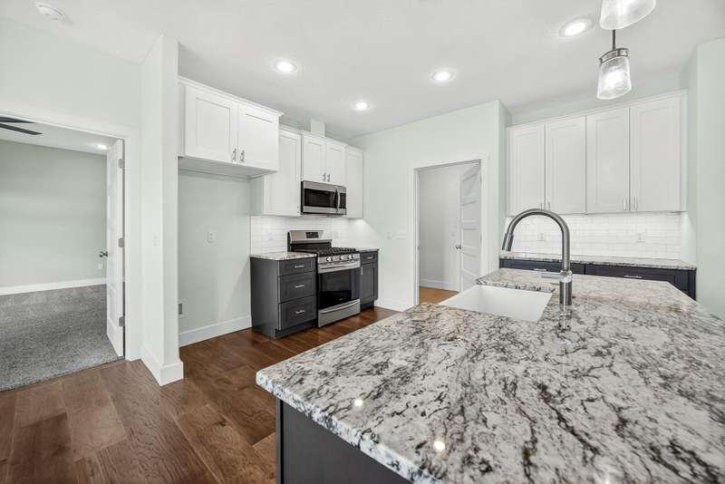 Discover this stunning modern home by Richland Homes, a true standout in the neighborhood. As you approach, the home's striking design immediately catches the eye, with a sleek combination of white brick and dark wood that creates an elegant contrast. The contemporary garage doors perfectly complement the overall aesthetic, while soffit lighting accentuates the inviting front porch adorned with warm wood siding.Inside, the spacious entryway welcomes you with soaring ceilings and natural light pouring in from the loft windows. The focal point of the room is the fireplace, featuring shiplap detailing, which seamlessly flows into the open-concept kitchen and dining area. The kitchen is a chef's dream, with exotic granite countertops offering ample space for both meal prep and casual dining. Under-cabinet lighting highlights the subway tile backsplash, and the farmhouse sink adds character to the space. A clever design feature includes a pantry just off the kitchen.The primary bedroom is tucked away for privacy and provides a generous layout, including a dual vanity with matching granite counters. The luxurious shower with tile flooring and separate tub offer the perfect retreat. Plus, a storm shelter is conveniently integrated into the master closet for added safety. Two additional bedrooms are located on the main floor, with one featuring a dramatic ceiling with wooden beams and plenty of natural light.Upstairs, you'll find a stylish office space with beautiful railings and lighting. A full bathroom and a large bedroom with craftsman-style doors complete the upper level.Step outside to the covered porch, which overlooks a privacy-fenced backyard. A unique feature of this home is the extended yard beyond the fence.