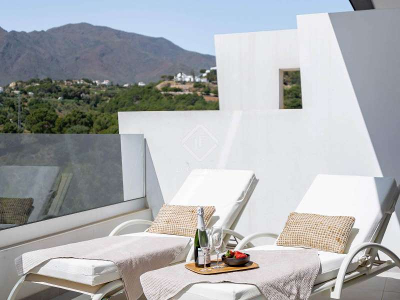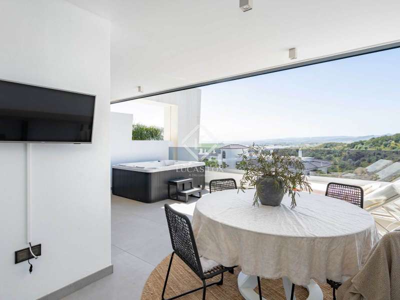 Discover this exquisitely designed 2-bedroom, 2-bathroom apartment showcasing awe-inspiring Mediterranean Sea views from its generous sun-drenched terrace. Perched in the prestigious gated community of Mirador de Estepona Hills, this home offers both elegance and tranquility as well as beautiful coastal scenery. The interior features a stylish open-plan layout connecting the living/dining area with a fully appointed kitchen, flooded with natural light through floor-to-ceiling windows. High-end finishes, sleek bathrooms, aerothermal heating/cooling, built-in wardrobes, and a private garage enhance your comfort and peace of mind. The gated community benefits from 24-hour security, a fully-equipped gym, sauna, padel tennis courts, children's playground, an infinity-style communal pool, jacuzzi and manicured gardens. Please contact us for further information.