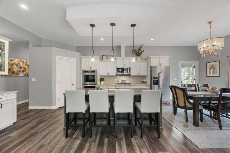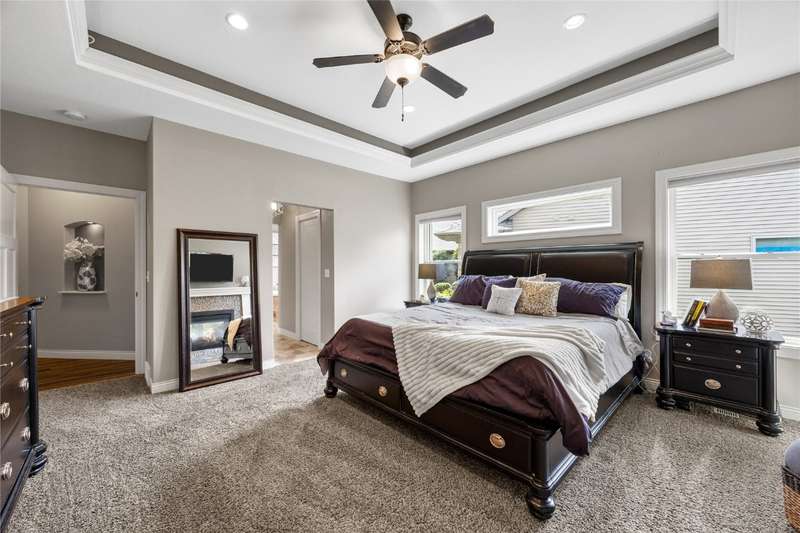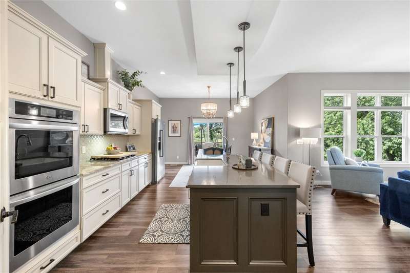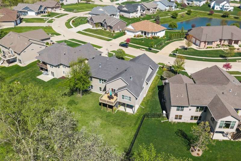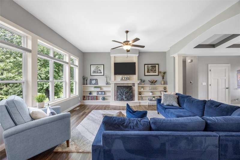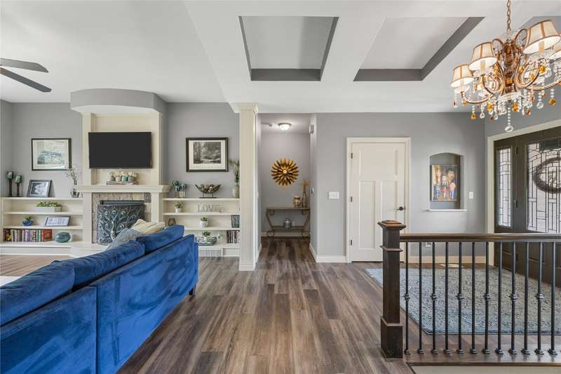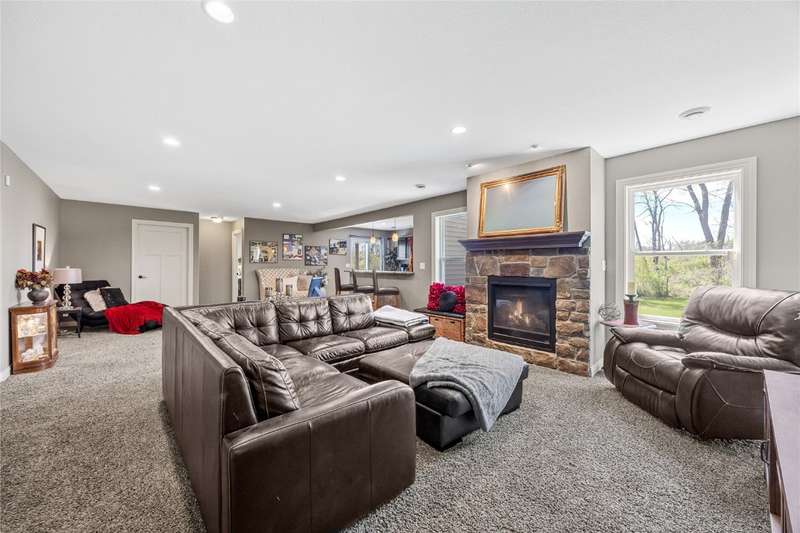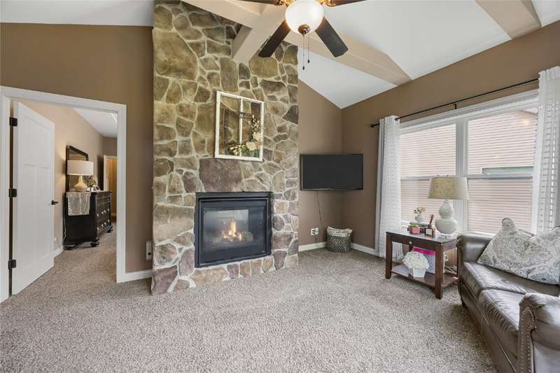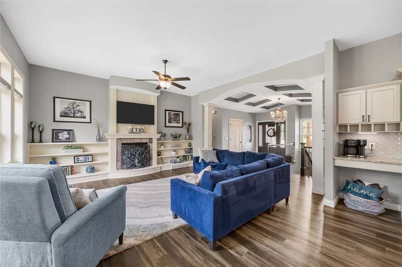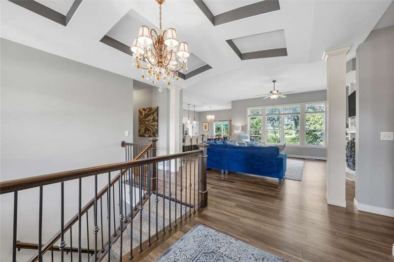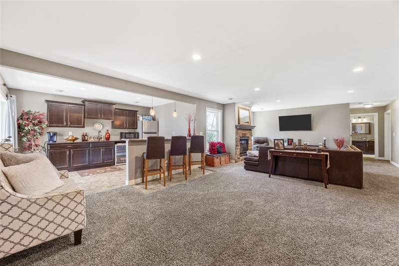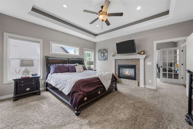 Welcome to this extraordinary 5-bedroom, 3.5-bathroom home boasting over 4,400 finished square feet of refined living space. Perfectly situated on a private lot backed by city-owned land, this property offers luxurious living in a serene neighborhood—complete with a stocked private pond and a scenic 0.25-mile paved walking trail, all maintained by the association. Step inside to soaring 10-foot ceilings on the main level and a grand foyer adorned with a custom barrel rolled-coffered ceiling. The spacious living room features custom built-ins and a striking stone fireplace surround with hearth—just one of four fireplaces throughout the home. The chef’s kitchen is a culinary dream with double ovens, a 5-burner gas cooktop, walk-in pantry, coffee/wine bar, and newer KitchenAid refrigerator. Gorgeous LVP flooring spans the main level, complementing the elegant formal dining room that opens to a 14x14 maintenance-free deck—perfect for entertaining. A well-appointed drop zone/laundry room includes a wash sink, pocket door, and custom-built lockers. Retreat to the luxurious primary suite with a lit tray ceiling, dual closets, and a private sitting room/office with a dual-sided fireplace—floor-to-ceiling stone on one side and a custom mantle with glass surround on the other. The spa-like en suite bath includes a corner jetted tub, dual vanities with vessel sinks, a custom-tiled shower with a rain can shower head, and high-end finishes throughout. Two additional oversized main floor bedrooms share a Jack & Jill bathroom with ample closet space. The finished walkout lower level is an entertainer’s paradise with a custom granite bar and back bar, expansive living area, private office/workout/playroom, and two generous storage rooms. Enjoy peaceful views, privacy, and luxury—all within minutes of local amenities. This is more than a home—it’s a lifestyle.