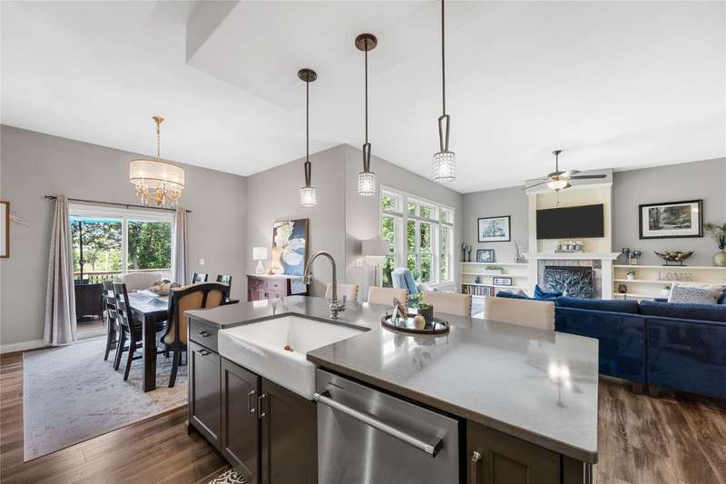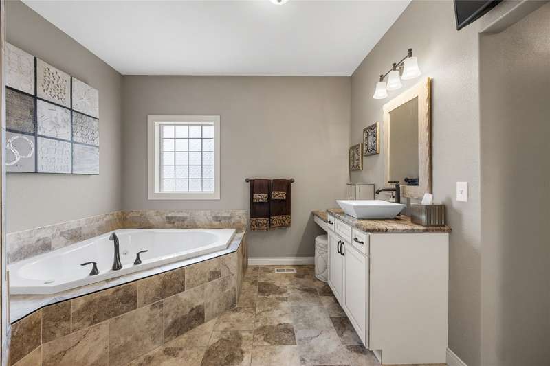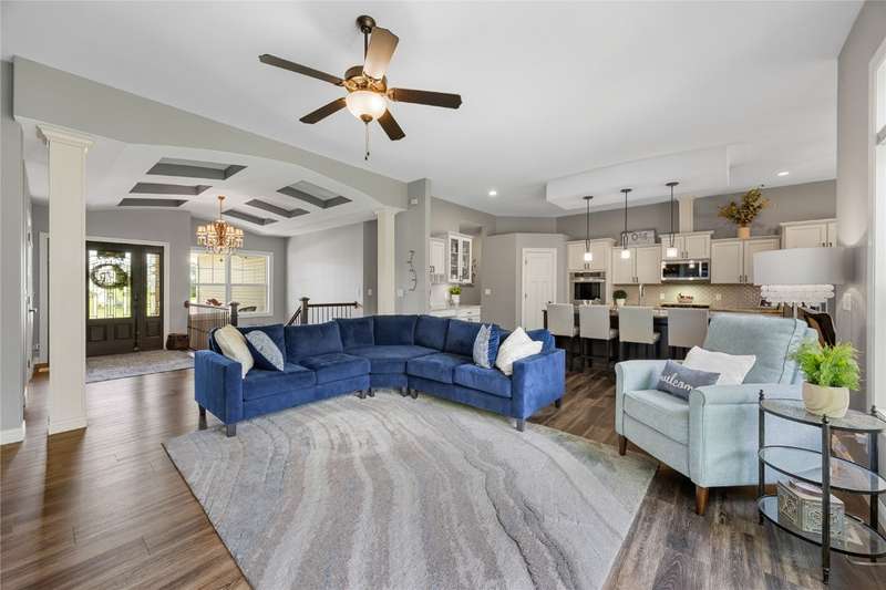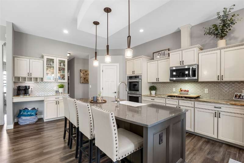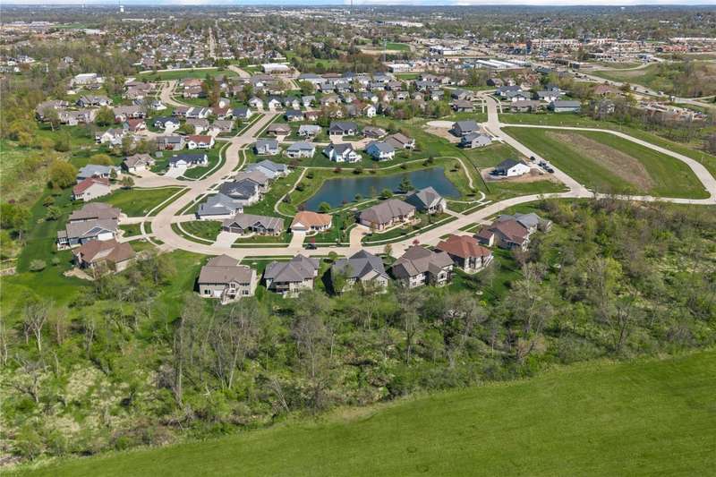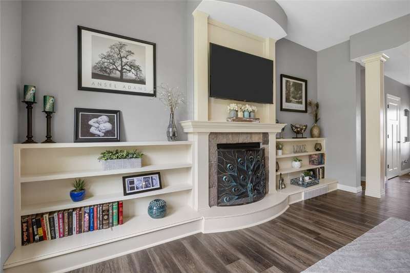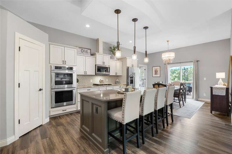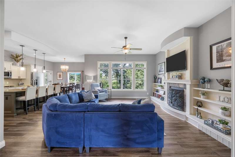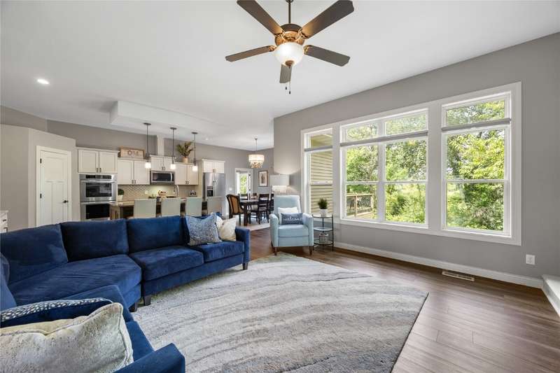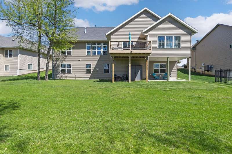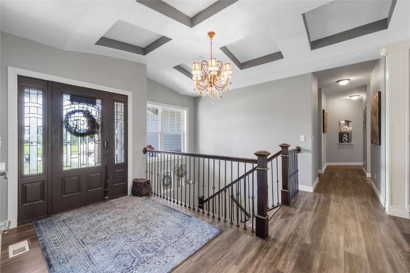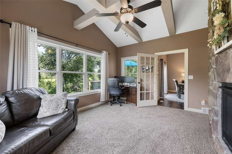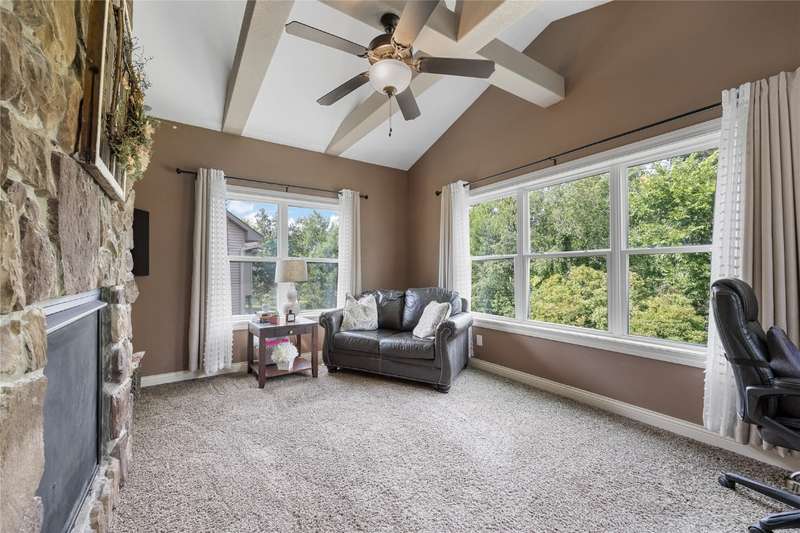 Welcome to this extraordinary 5-bedroom, 3.5-bathroom home boasting over 4,400 finished square feet of refined living space. Perfectly situated on a private lot backed by city-owned land, this property offers luxurious living in a serene neighborhood—complete with a stocked private pond and a scenic 0.25-mile paved walking trail, all maintained by the association. Step inside to soaring 10-foot ceilings on the main level and a grand foyer adorned with a custom barrel rolled-coffered ceiling. The spacious living room features custom built-ins and a striking stone fireplace surround with hearth—just one of four fireplaces throughout the home. The chef’s kitchen is a culinary dream with double ovens, a 5-burner gas cooktop, walk-in pantry, coffee/wine bar, and newer KitchenAid refrigerator. Gorgeous LVP flooring spans the main level, complementing the elegant formal dining room that opens to a 14x14 maintenance-free deck—perfect for entertaining. A well-appointed drop zone/laundry room includes a wash sink, pocket door, and custom-built lockers. Retreat to the luxurious primary suite with a lit tray ceiling, dual closets, and a private sitting room/office with a dual-sided fireplace—floor-to-ceiling stone on one side and a custom mantle with glass surround on the other. The spa-like en suite bath includes a corner jetted tub, dual vanities with vessel sinks, a custom-tiled shower with a rain can shower head, and high-end finishes throughout. Two additional oversized main floor bedrooms share a Jack & Jill bathroom with ample closet space. The finished walkout lower level is an entertainer’s paradise with a custom granite bar and back bar, expansive living area, private office/workout/playroom, and two generous storage rooms. Enjoy peaceful views, privacy, and luxury—all within minutes of local amenities. This is more than a home—it’s a lifestyle.