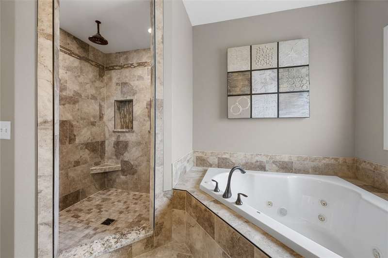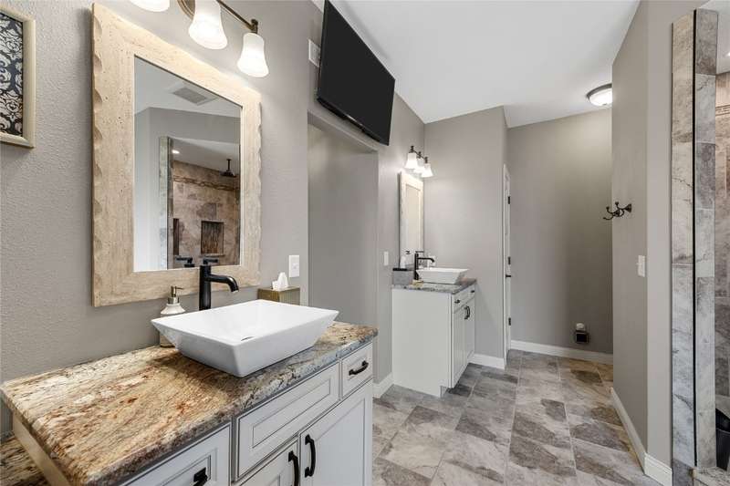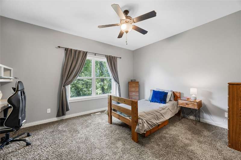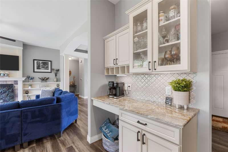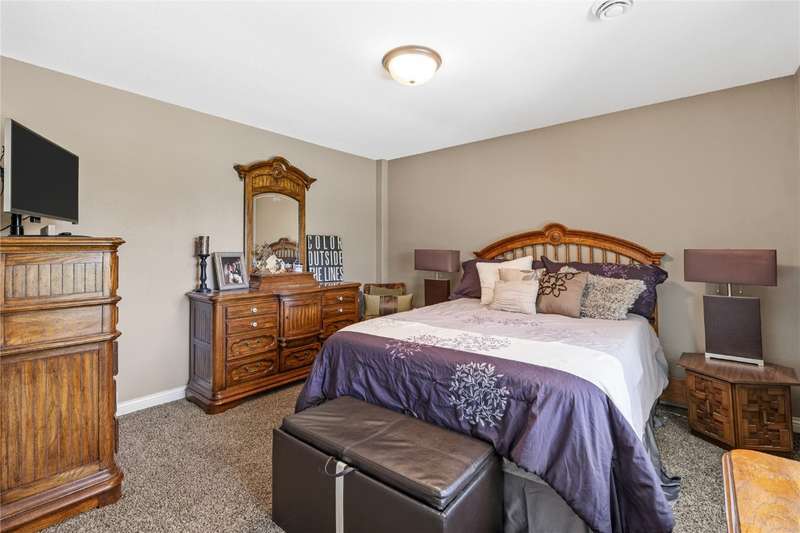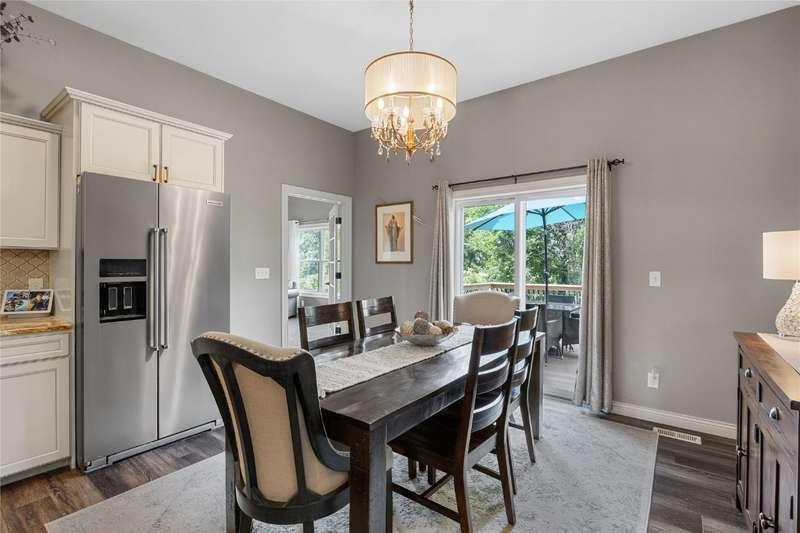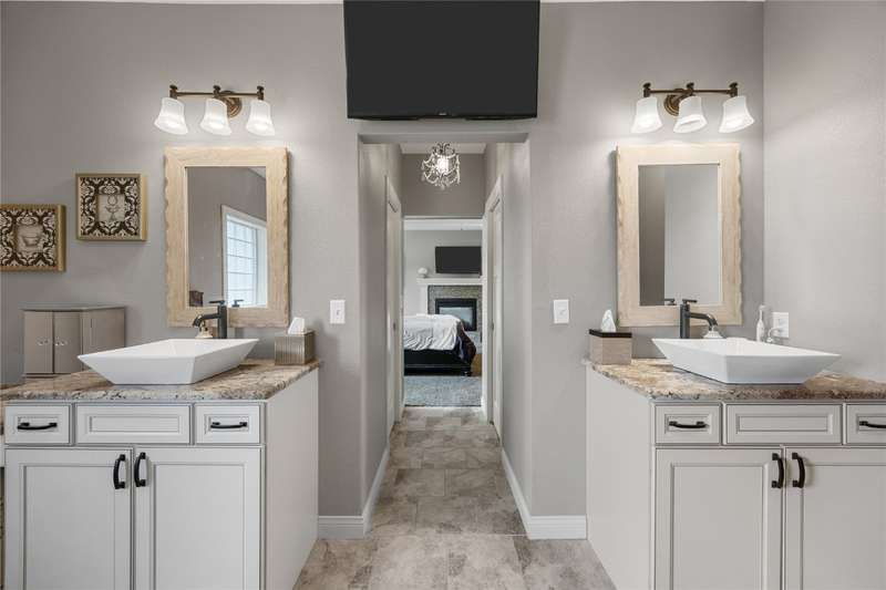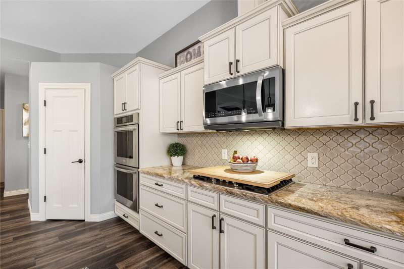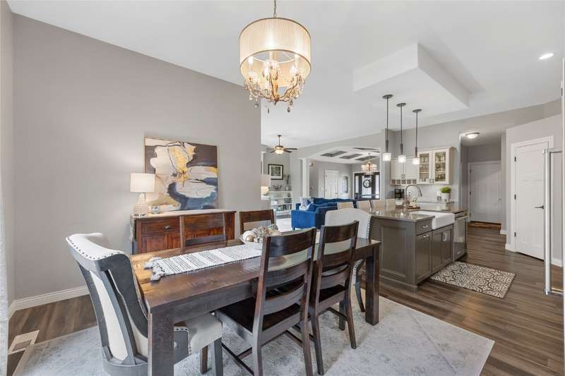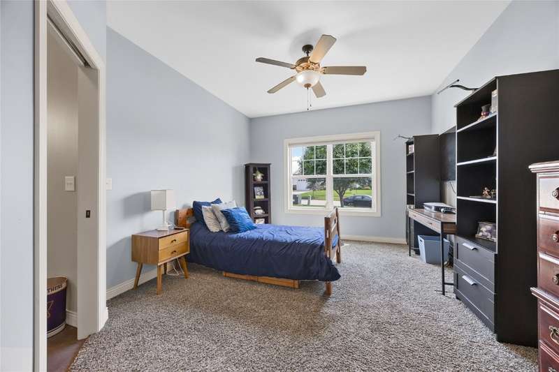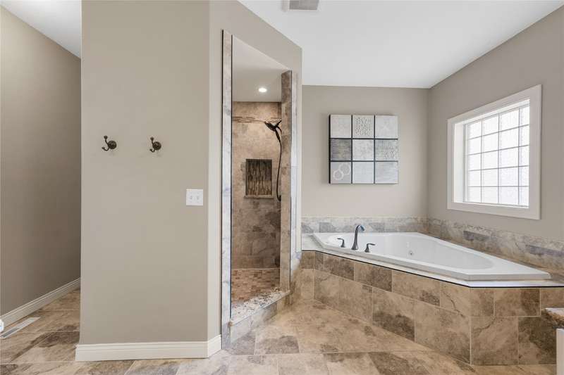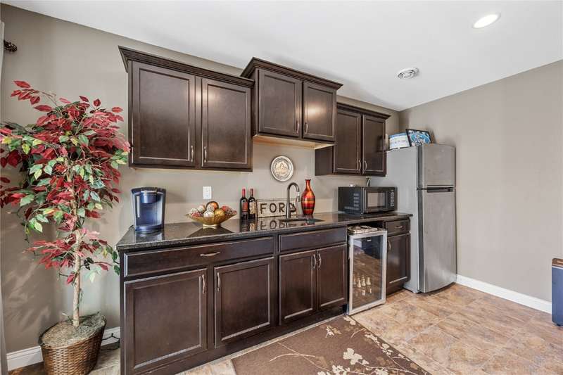 Welcome to this extraordinary 5-bedroom, 3.5-bathroom home boasting over 4,400 finished square feet of refined living space. Perfectly situated on a private lot backed by city-owned land, this property offers luxurious living in a serene neighborhood—complete with a stocked private pond and a scenic 0.25-mile paved walking trail, all maintained by the association. Step inside to soaring 10-foot ceilings on the main level and a grand foyer adorned with a custom barrel rolled-coffered ceiling. The spacious living room features custom built-ins and a striking stone fireplace surround with hearth—just one of four fireplaces throughout the home. The chef’s kitchen is a culinary dream with double ovens, a 5-burner gas cooktop, walk-in pantry, coffee/wine bar, and newer KitchenAid refrigerator. Gorgeous LVP flooring spans the main level, complementing the elegant formal dining room that opens to a 14x14 maintenance-free deck—perfect for entertaining. A well-appointed drop zone/laundry room includes a wash sink, pocket door, and custom-built lockers. Retreat to the luxurious primary suite with a lit tray ceiling, dual closets, and a private sitting room/office with a dual-sided fireplace—floor-to-ceiling stone on one side and a custom mantle with glass surround on the other. The spa-like en suite bath includes a corner jetted tub, dual vanities with vessel sinks, a custom-tiled shower with a rain can shower head, and high-end finishes throughout. Two additional oversized main floor bedrooms share a Jack & Jill bathroom with ample closet space. The finished walkout lower level is an entertainer’s paradise with a custom granite bar and back bar, expansive living area, private office/workout/playroom, and two generous storage rooms. Enjoy peaceful views, privacy, and luxury—all within minutes of local amenities. This is more than a home—it’s a lifestyle.