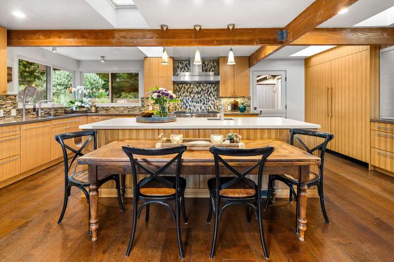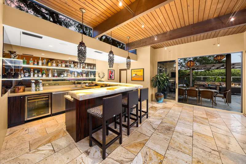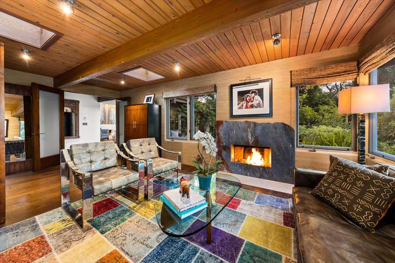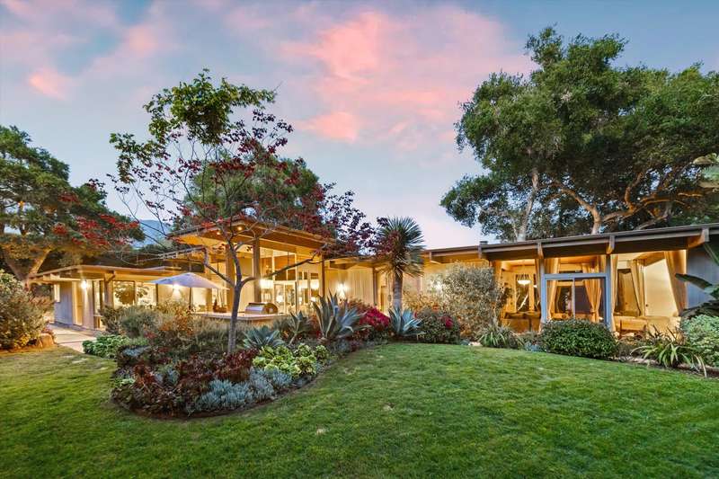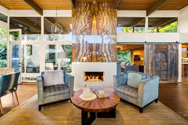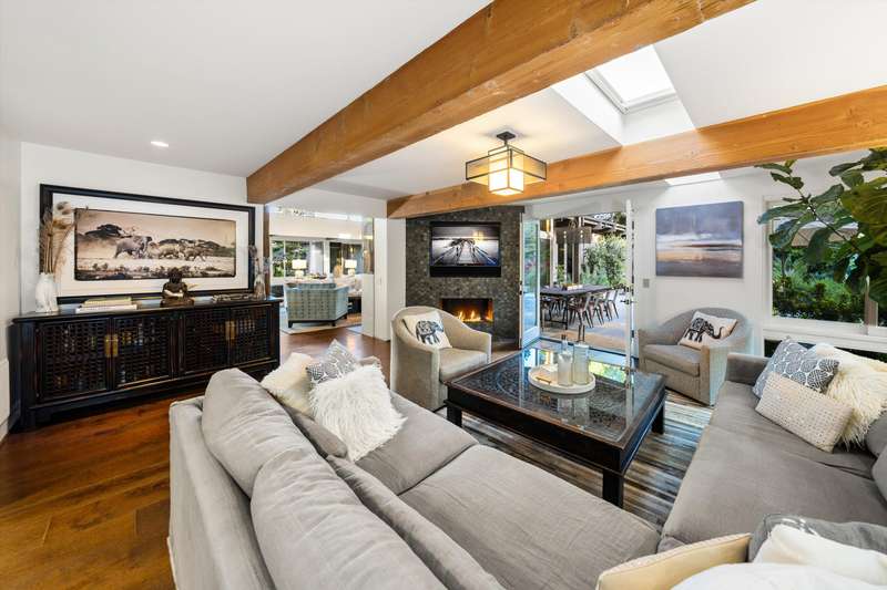 Tucked behind gates on a peaceful lane, this single-level Mid-Century estate is a tranquil sanctuary where nature and luxury converge. Lush tropical landscaping, curated pathways, and serene outdoor moments create a resort-like atmosphere. Inside, soaring ceilings and walls of glass frame garden views, while a chef's kitchen, dramatic agate fireplace, and seamless indoor-outdoor flow elevate everyday living.