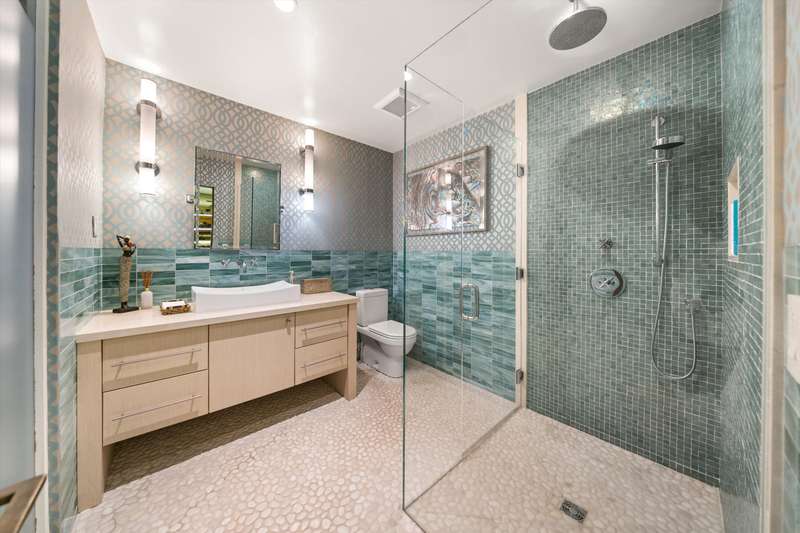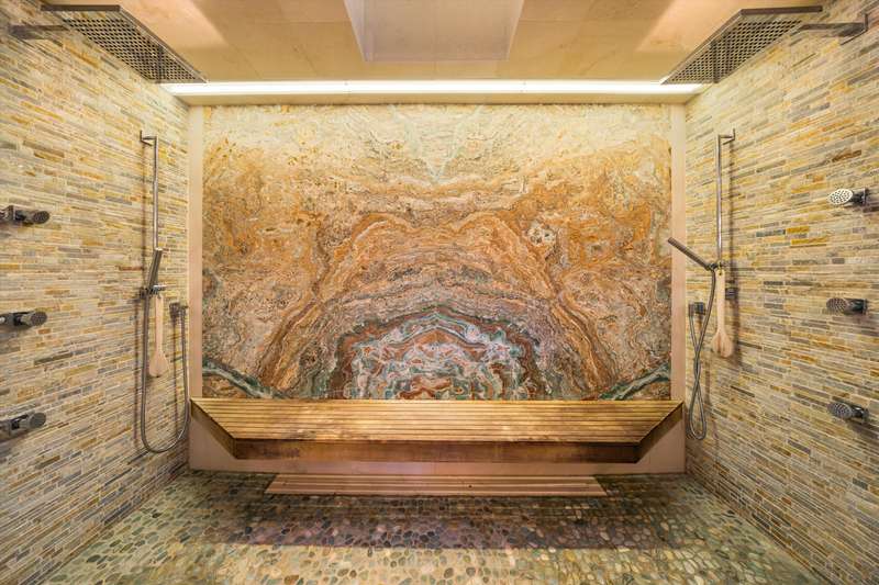 The spa-inspired primary suite features radiant heated floors, steam shower, ceiling-fill soaking tub, and private garden with hot tub and outdoor shower. Two additional en-suite bedrooms and two offices offer flexibility and comfort.