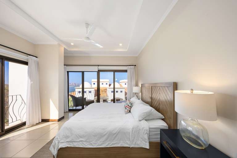 This ground-floor unit offers 2 spacious bedrooms and 2.5 bathrooms, with an open-concept layout that seamlessly blends indoor and outdoor living. Natural light floods the living area, which is beautifully furnished with a cozy blue sofa, accent chairs, and a flat-screen TV. Floor-to-ceiling sliding glass doors open onto a private balcony, perfect for enjoying your morning coffee or sunset cocktails while overlooking the Pacific Ocean, white-sand beaches, and elegant Mediterranean-style architecture below.