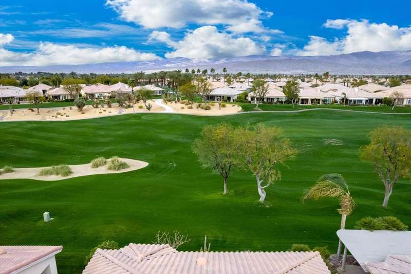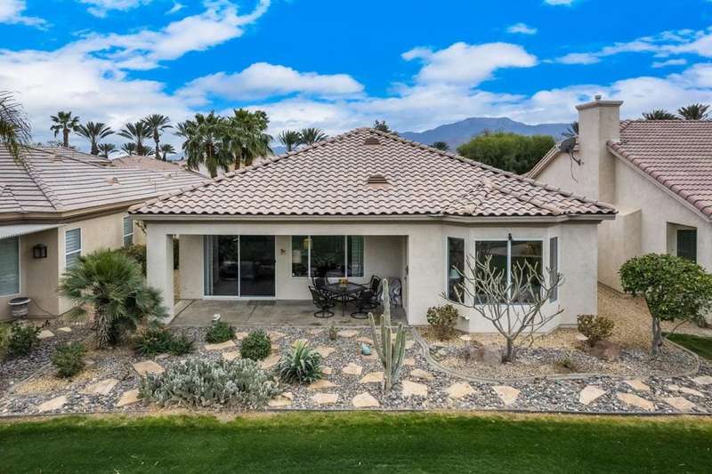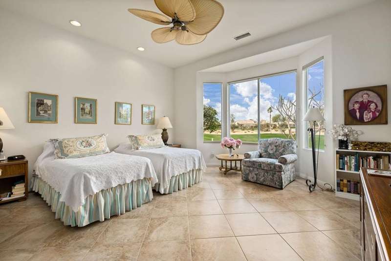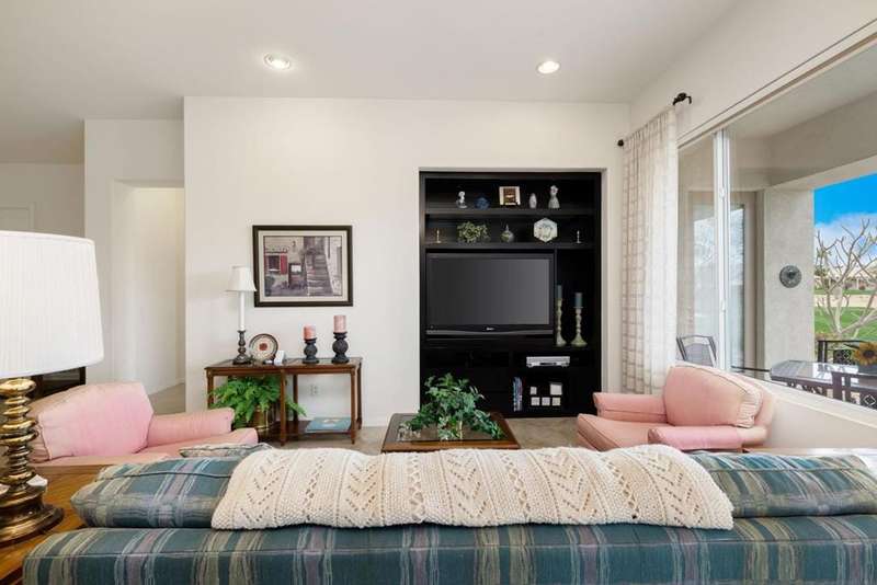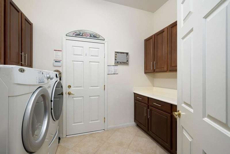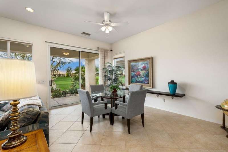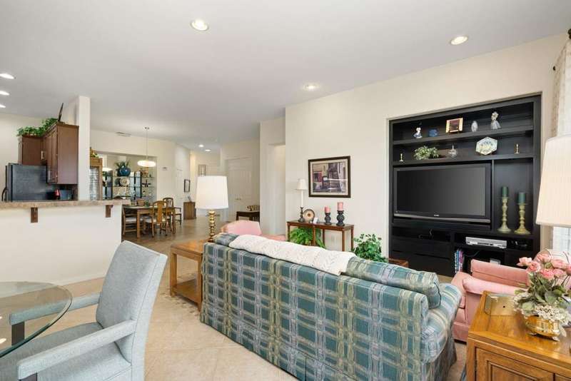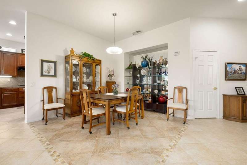 Step into an open floorplan featuring a dining area and a spacious living room with built-in shelves. The high ceilings and recessed lighting enhance the ambiance throughout the space. The kitchen is equipped with granite countertops, a gas stovetop, and ample cabinetry, overlooking both the living room and picturesque views of the golf course. This home offers two bedrooms, two bathrooms, and a den/office. The primary bedroom provides access to the back patio and features golf course views. The primary bathroom includes a walk-in closet, soaking tub, and separate sink areas. The laundry room is appointed with front-loading washer and dryer, utility sink, and abundant cabinetry for storage. The covered back patio presents scenic mountain and golf course views. Additional amenities include a two-car garage with generous storage capacity and a separate garage for a golf cart. Heritage Palms is an exclusive 55+ community offering a guard-gated entrance, clubhouse, dining, fitness center, tennis courts, social clubs, and more. Schedule your private showing today!