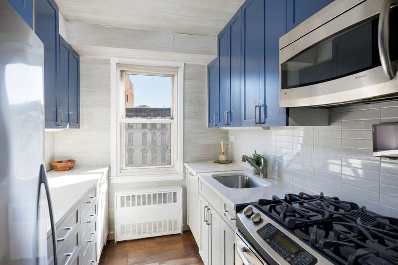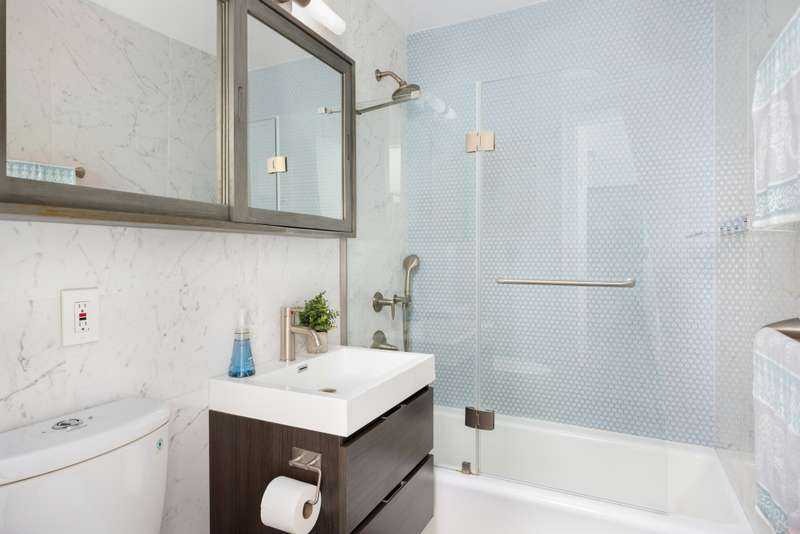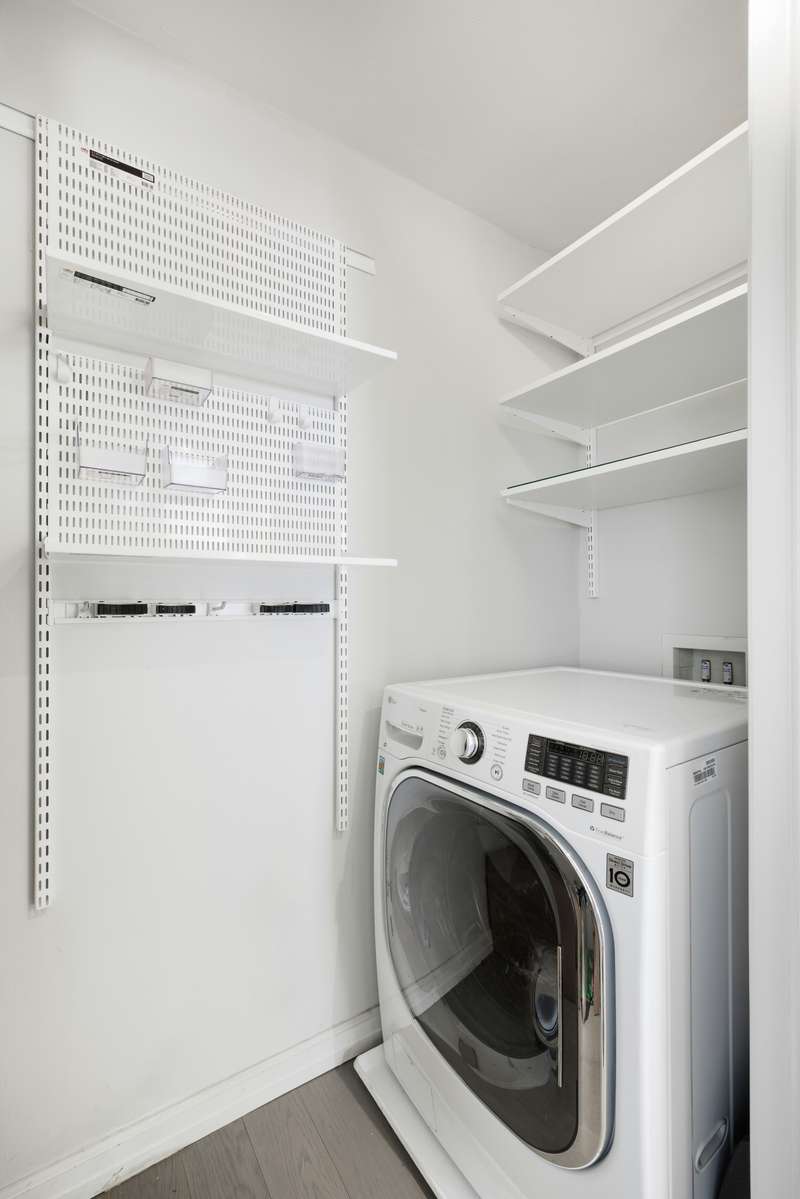 Barely lived in since a full do-over, the apartment features east-facing windows (a glimpse of uptown's Empire State Building), a sizable dining alcove, storage space galore and a washer/dryer. The details are all tasteful and high end: shades of calming blues and greys resonate throughout, complimenting the white oak engineered floors. The kitchen features heat and stain resistant quartzite countertops; a subway tile backsplash; new blue two-toned custom cabinet doors. There are new doors throughout the unit, all with satin finish handles; the bathroom has Carrara marble walls and matte finish grey porcelain floors which are slip resistant. The closets are ALL walk-in, with custom cabinetry from the Container Store and all light fixtures are fitted with dimmers.