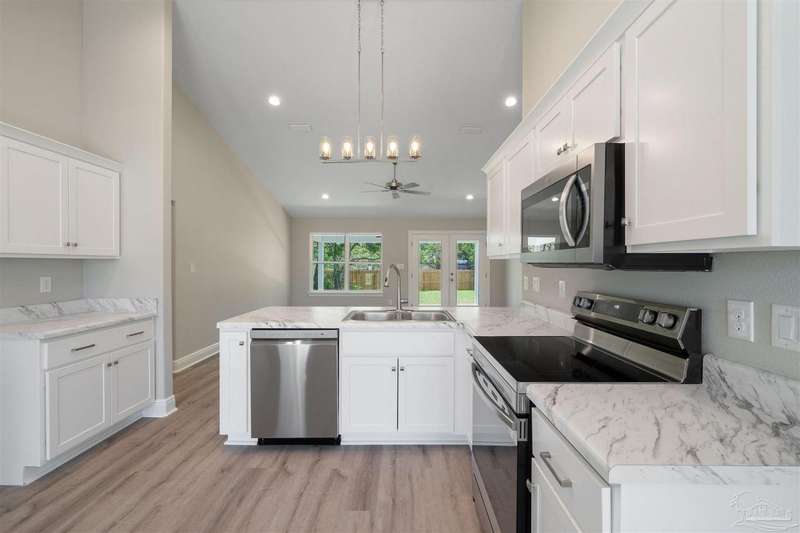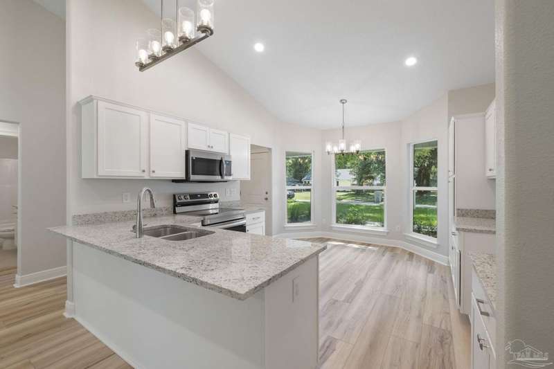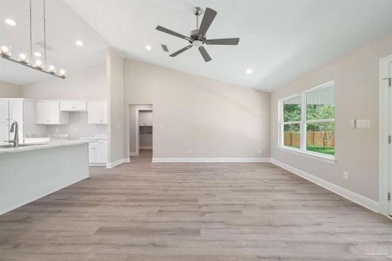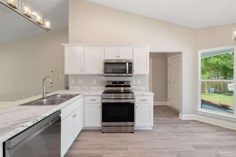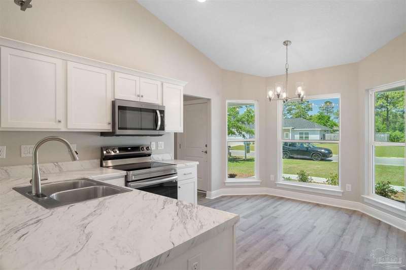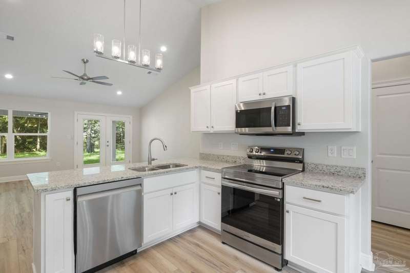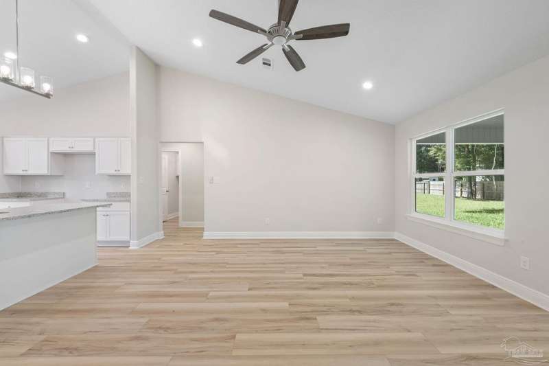 Move In Ready! This stunning new construction offers everything you've been searching for. With 3 bedrooms and 2 full bathrooms, this home is designed to accommodate your lifestyle. As you step inside, you'll immediately notice the abundance of natural light that fills the space. The spacious kitchen features stainless steel appliances, granite countertops, a large wrap around island, and an adjacent breakfast area. With plenty of counter space and storage, meal prep and gatherings will be a breeze. The open concept living space with a vaulted ceiling provides plenty of room to entertain guests or relax with family. LVP flooring throughout. Retreat to the luxurious master suite complete with a generous closet and a spa-like bathroom featuring a double vanity and tiled shower. The secondary bedrooms offer ample closet space, ensuring everyone has their own private retreat. Outside, you'll find a beautiful covered patio and sodded lot with a sprinkler system, making lawn maintenance simple. The finished attached 2-car garage provides convenient parking and additional storage space.