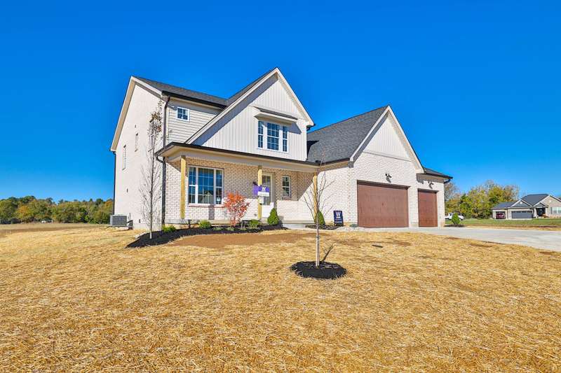 Enjoy sitting on your quiet front porch in this beautiful first floor primary home! Brick exterior, three car garage, and 9 ft ceilings on first floor. The large foyer leads to a grand two story great room featuring a custom wainscotting fireplace wall and linear electric fireplace. LVP throughout first floor. Large open kitchen, dining, and living area. the kitchen has quartz countertops, island, walk-in pantry, soft close cabinets, and tile backsplash. Primary bathroom has oversized tile shower with seat, double vanity with quartz tops and large walk-in closet. The three upstairs bedrooms have walk-in closets. First floor laundry has cabinets and counter with laundry tub arranged perfectly for a stacked washer/dryer. Mud room off garage with coat closet and custom bench. Agent has ownership and building company.