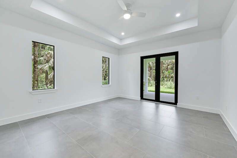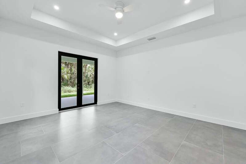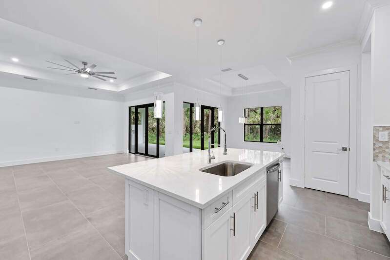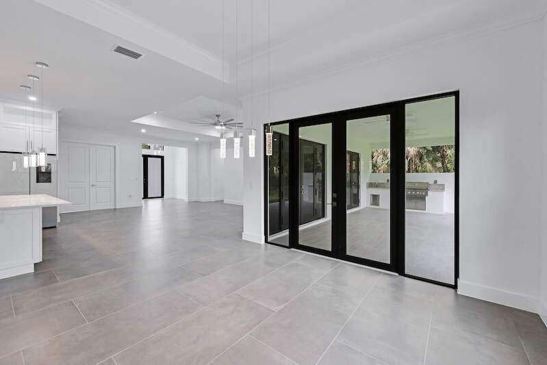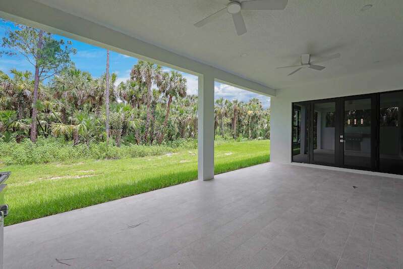 A stunning brick paver driveway welcomes you to this elegant home, complete with a spacious 3-car garage featuring a sleek epoxy finish. Step through the double impact glass doors into soaring high ceilings and a bright, open layout. The gourmet kitchen boasts two-tier cabinetry, stainless steel appliances with hood, quartz countertops, a large island, and a smart refrigerator with built-in screen. The luxurious master suite offers his-and-hers closets, dual vanities, a soaking tub, and an oversized walk-in shower with floor-to-ceiling tile. Entertain with ease on the expansive covered lanai, featuring a granite outdoor kitchen with built-in grill and still plenty of room for a pool! Situated on 100% uplands in an X flood zone, this property offers peace of mind.