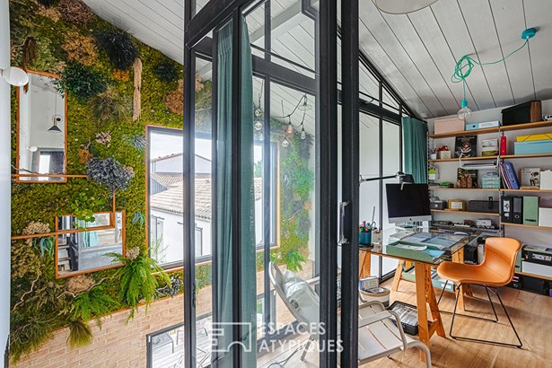 A garage converted into a second bedroom on one level is also present. Like a link between the two levels, a green wall brings a touch of nature to the atmosphere and is even more appreciated from the first bedroom upstairs, which looks like an artist's studio and opens transparently onto this refreshing greenery.