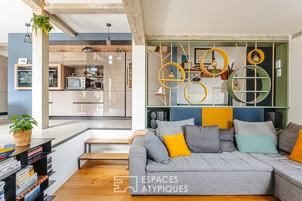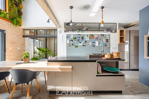 This archetype of the modern home is expressed here around quality materials, subtly chosen: polished concrete, metal, glass and wood. Every detail has been rigorously selected from renowned designers or recognized craftsmen, which makes this house a colorful and warm cocoon. The living room is composed of a central kitchen with high-end equipment that extends into a dining area. The codes of New York lofts are omnipresent, around the metal staircase and real wall bricks.