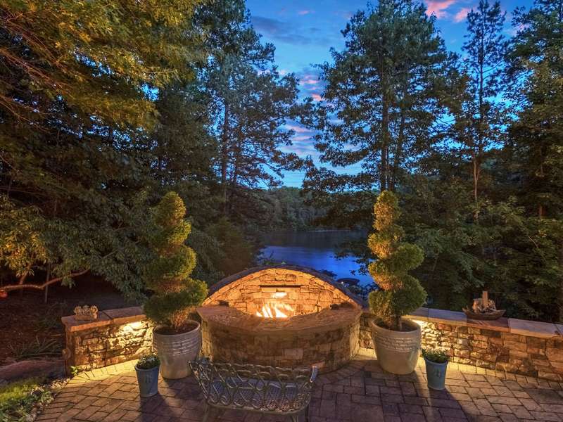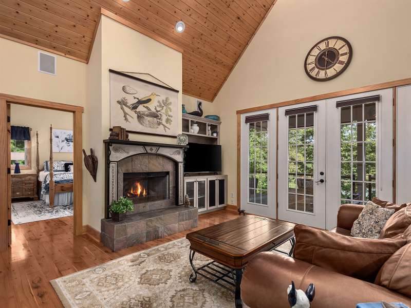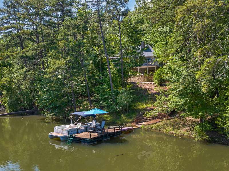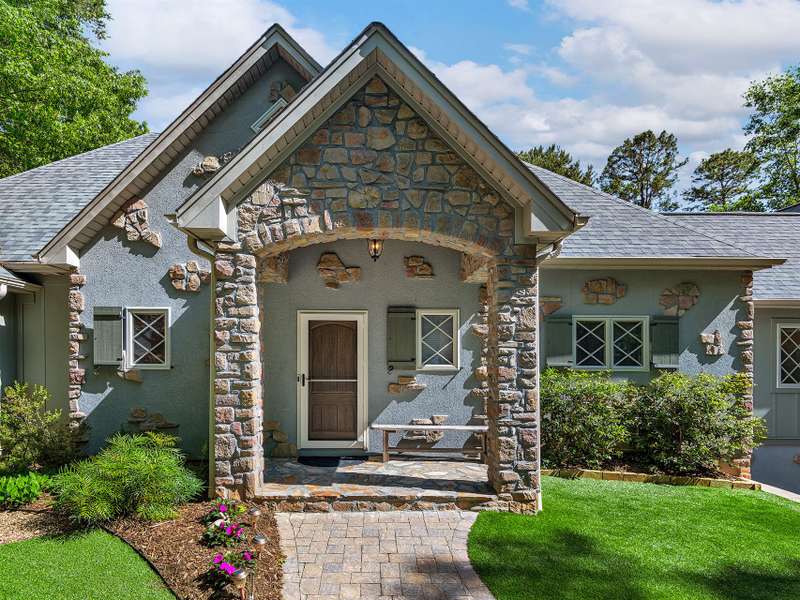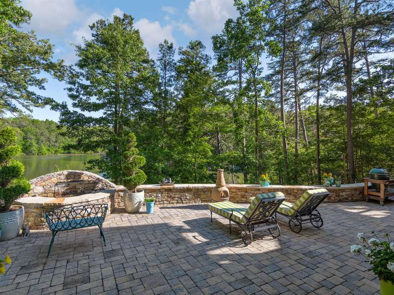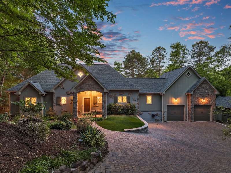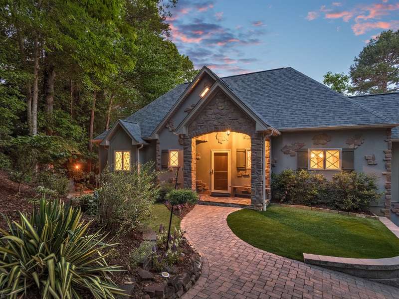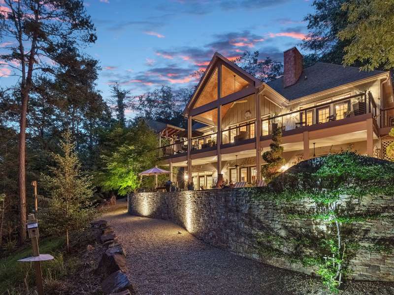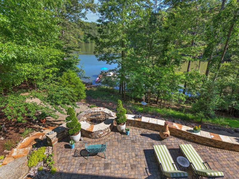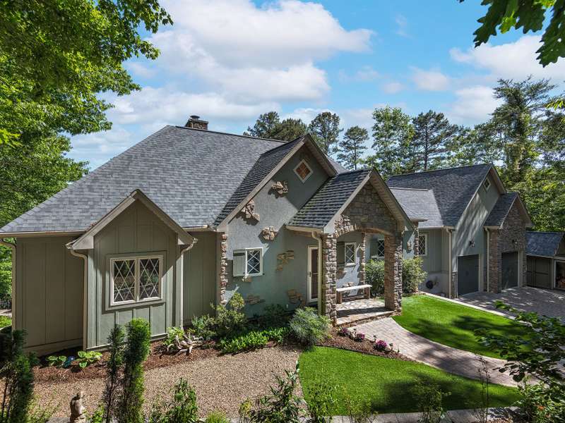 Nestled on the serene shores of Lake Adger, this exceptional stone-accented home offers an unparalleled blend of comfort, style, and natural beauty. Immediate upon entry, one is welcomed by an impressive great room featuring vaulted wood ceilings, a woodburning fireplace, and extensive views of the serene lake. The open-concept design connects the kitchen, dining, and great room adjoining the lakeside deck. Warm wood accents enhance the sophisticated rustic charm throughout. The main level also boasts a spacious lakeside primary ensuite, providing a private haven of relaxation. On the lower level, you'll find a versatile family room, two inviting guest suites, a dedicated office space, and an expansive lakeside patio that features a cascading water feature and firepit,perfect for entertaining or unwinding under the stars. Outdoor living is redefined with thoughtfully designed stone walls and walkways that embrace the lakeside charm. Welcome to your dream lakefront retreat!