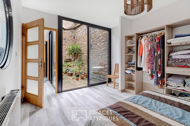 The entrance opens onto a spacious 68sqm living room with remarkable volumes. It consists of a clean-lined, fitted and equipped kitchen opening onto the living/dining room area. A bedroom with a glass roof completes this space. A beautiful wrought iron spiral staircase leads to the sleeping area, which consists of two comfortably sized bedrooms, each with a private bathroom. A rare thing in the area, a 12sqm outdoor patio completes this level.