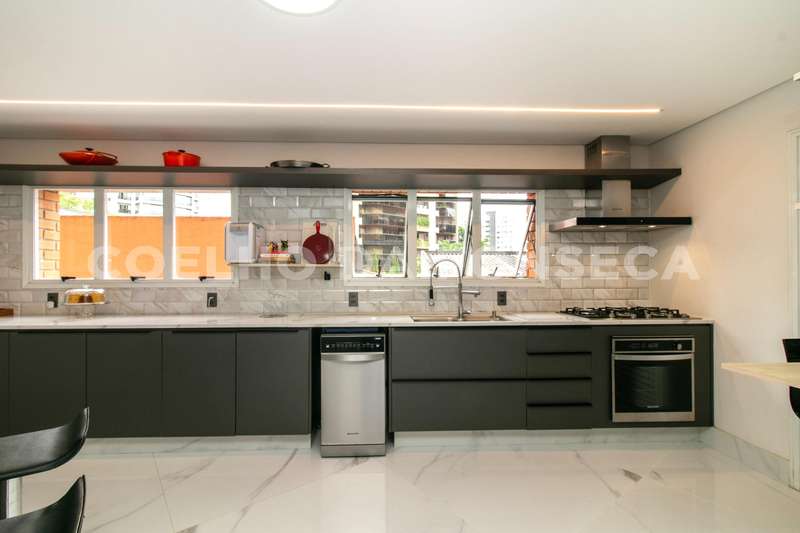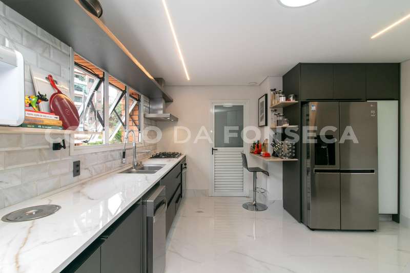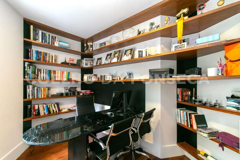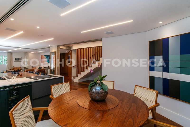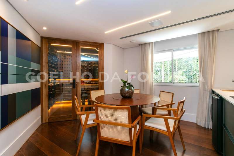 No primeiro andar, você será recebido por uma espaçosa sala para três ambientes, onde a iluminação é totalmente automatizada para proporcionar o ambiente perfeito para cada ocasião. Uma lareira adiciona charme e calor às noites mais frias, enquanto um escritório oferece um espaço tranquilo para trabalhar em casa. Um lavabo garante praticidade para os visitantes. A cozinha planejada é um convite à culinária, e uma adega especial com mesa para degustação proporciona momentos de relaxamento e apreciação onde há uma janela com persiana automatizada que oferece uma vista deslumbrante para o Parque Ibirapuera.