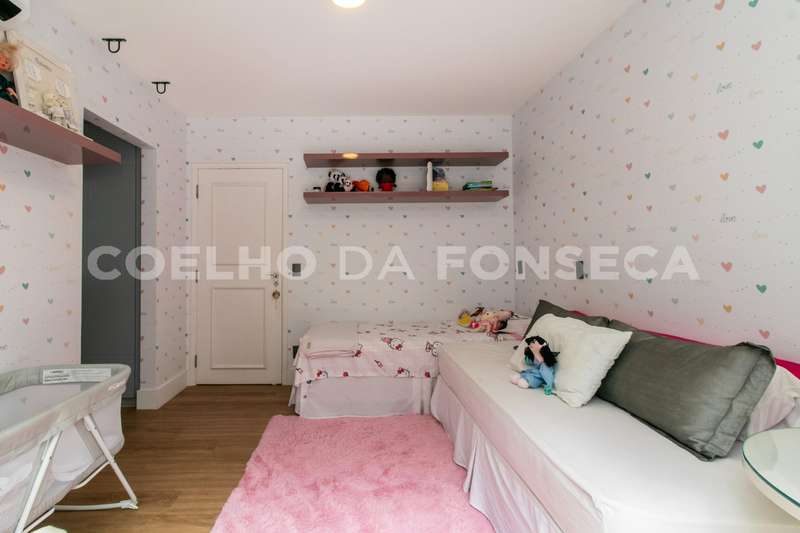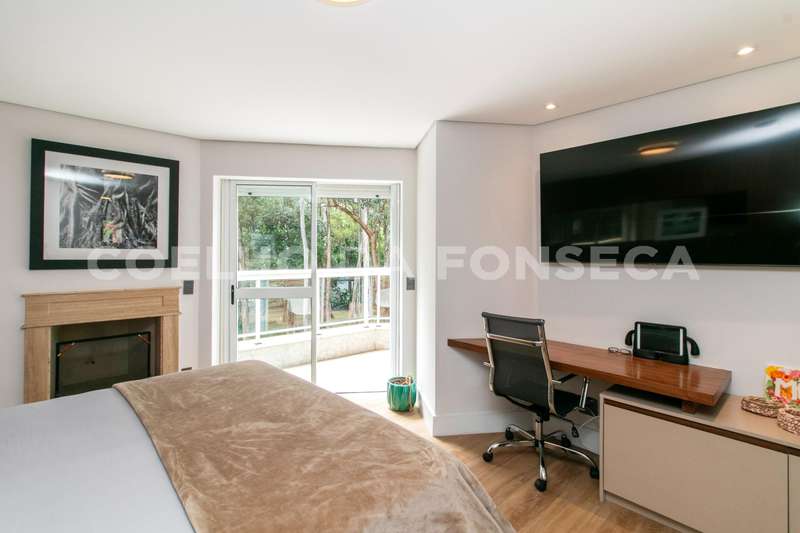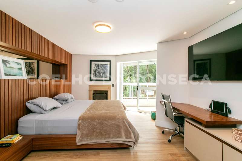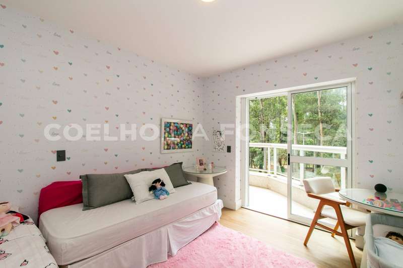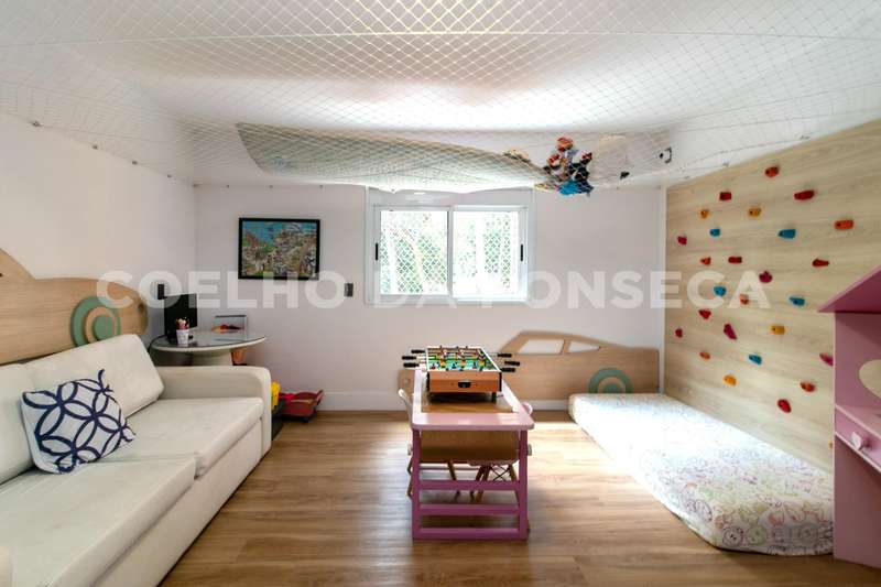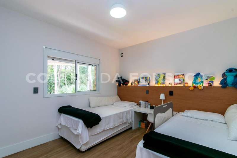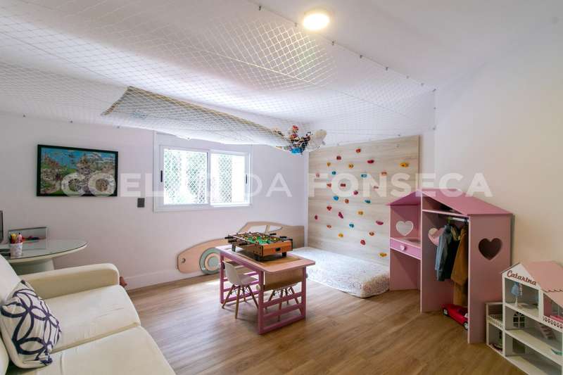 No andar superior, você encontrará cinco dormitórios, sendo quatro suítes. A suíte master é um verdadeiro refúgio, com um walk-in closet espaçoso e uma sala de banho equipada com banheira e pias senhor e senhora. Um dos dormitórios foi convertido em uma brinquedoteca, perfeito para as crianças explorarem sua criatividade.