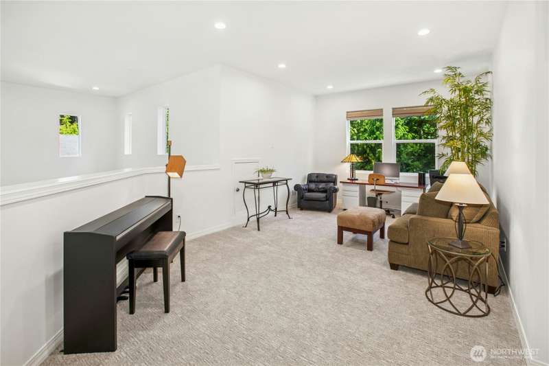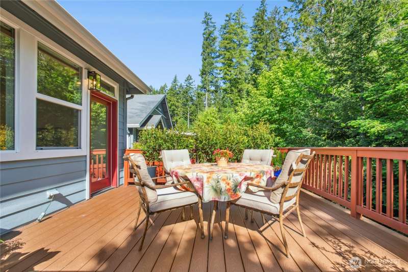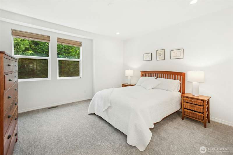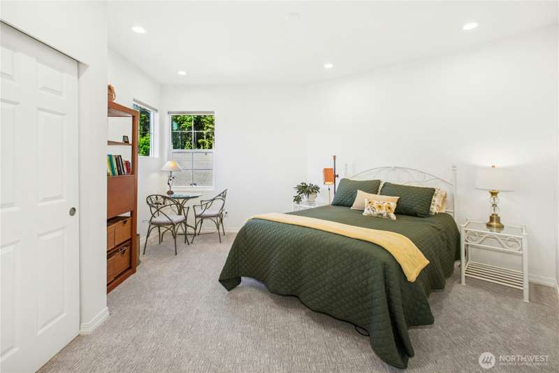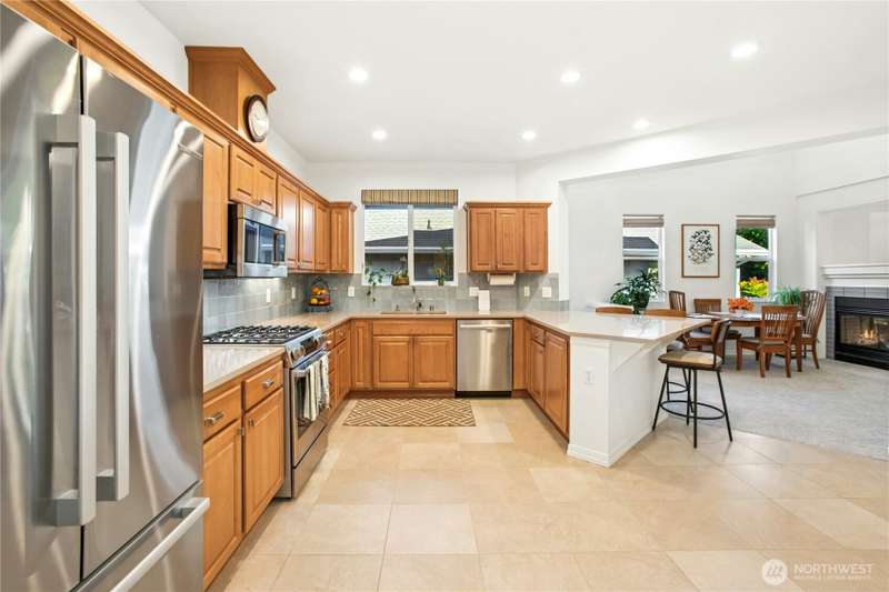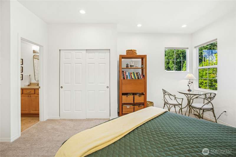 Pristine home fully updated and ready to move in! Premier on the main floor overlooking peaceful greenbelt with lux ensuite featuring dual vanities, quartz counters, ceramic flrs + giant WIC. Sunny 2nd large Suite upstairs. Oversized bonus room w/office space. Separate dining w/dramatic ceilings & clerestory windows for maximum light. Open kitchen with quartz counters, new appliances, eating bar & extra storage. The great room features a gas frpl and leads to the oversized Trex deck and patio. Fenced yard with small garden area. Roomy attached two-car garage w/parking in front. Beautifully landscaped. Resort-Style amenities including pool, tennis, pickleball, spa, miles of trails, clubhouse + activities.