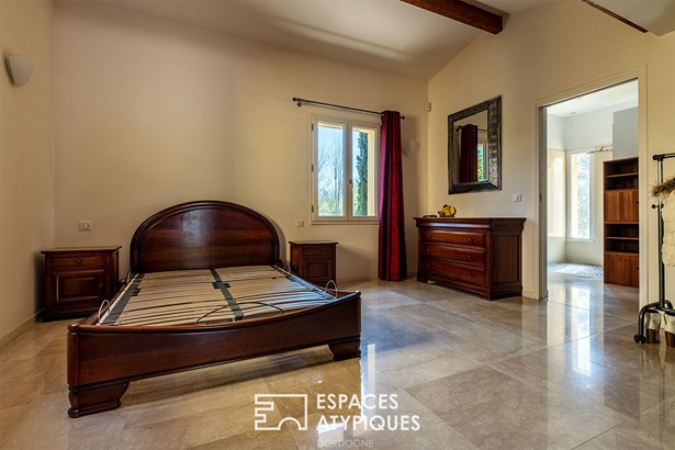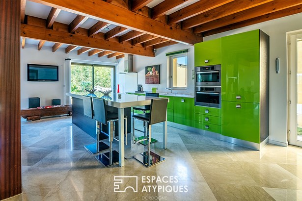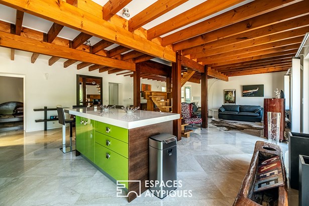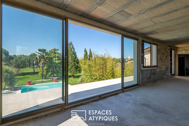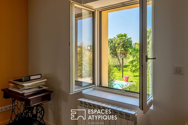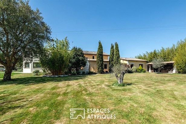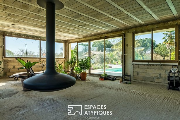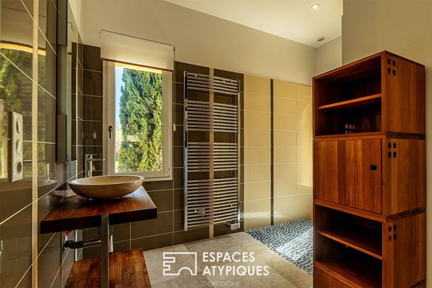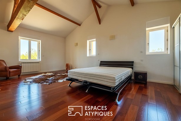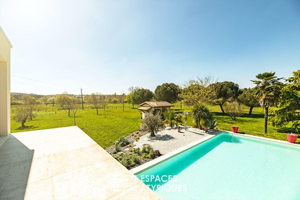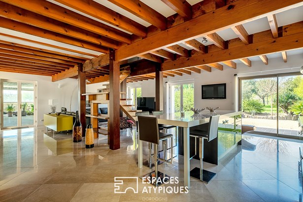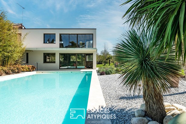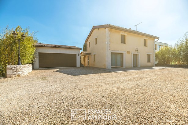 Less than an hour from Bordeaux and surrounded by a comfortable plot of 6400m2, this neo-contemporary style property invites you to revel in the tranquility of the place.
