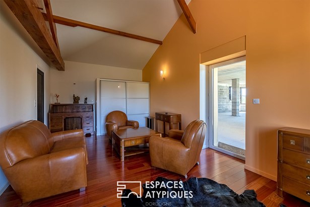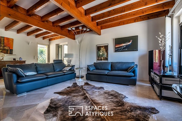 There reigns here an atmosphere that leads us to reverie. The interior is no less spectacular. From the entrance, the living room seizes by its volume, the meticulous and precise choice of materials.