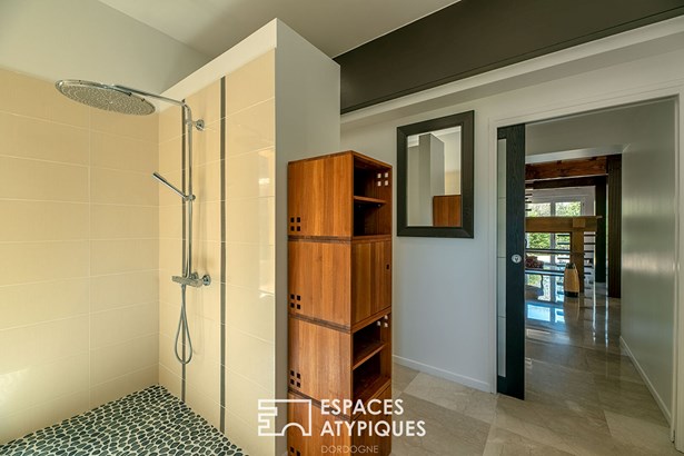A parental suite, adjoining the living room, benefits intimately from the calm of the back of the house. An original and unusual staircase in a minimalist style leads to two bedrooms with their solid parquet floors and their bathroom.