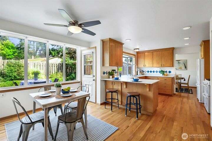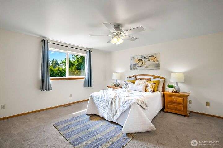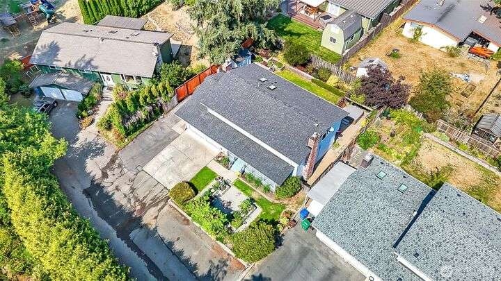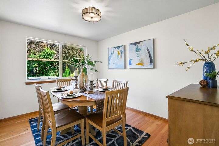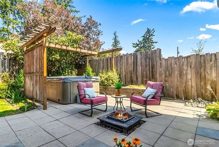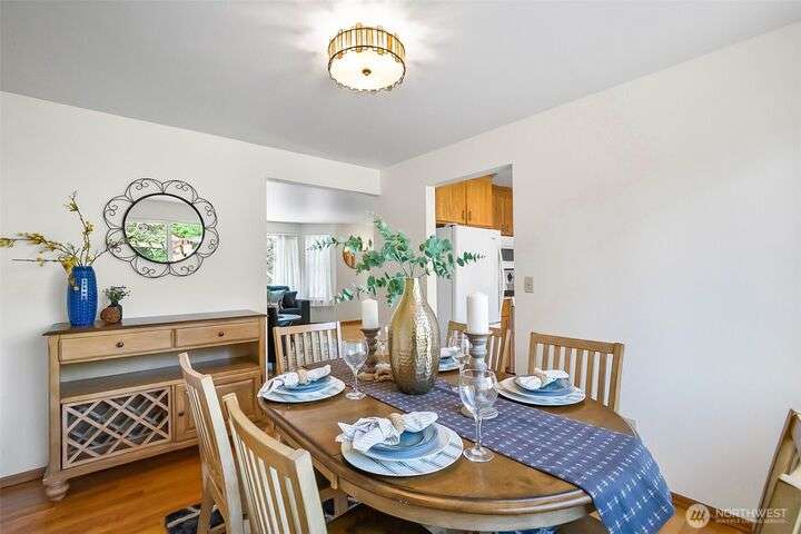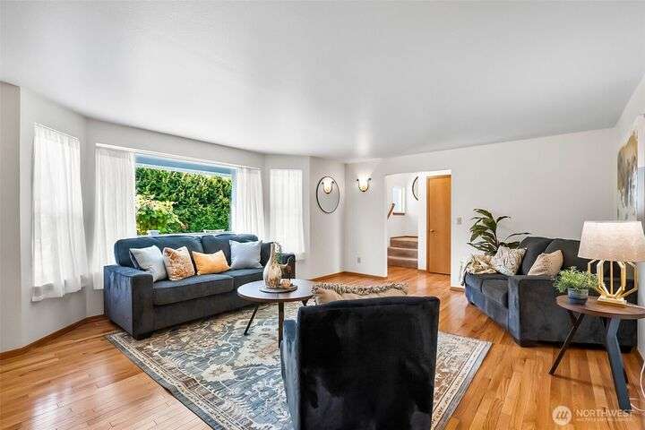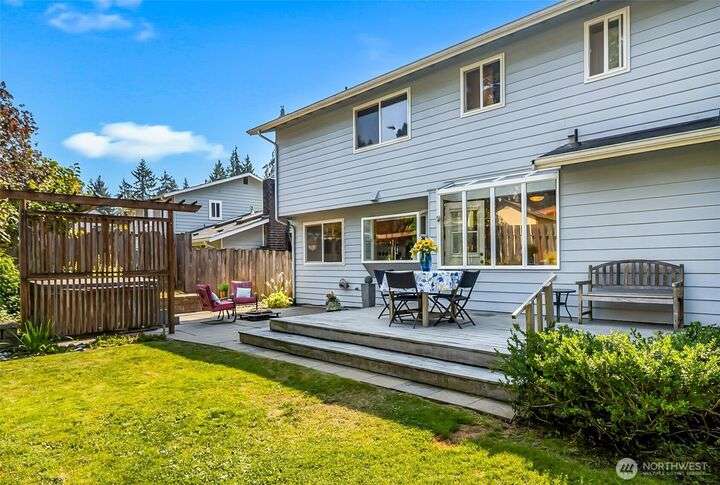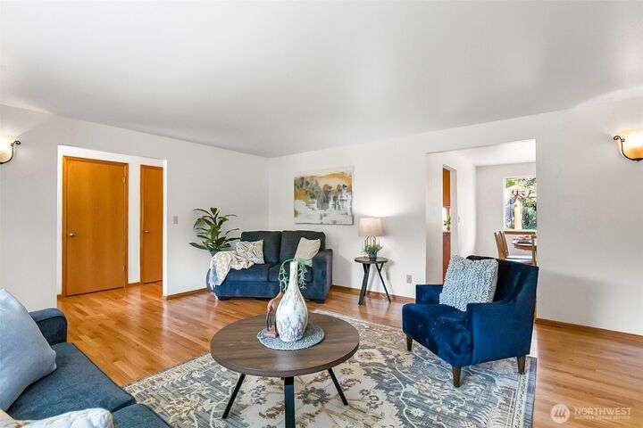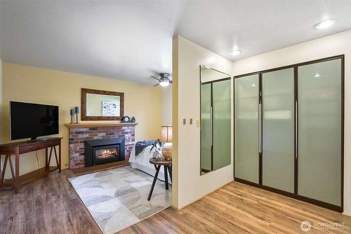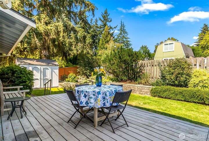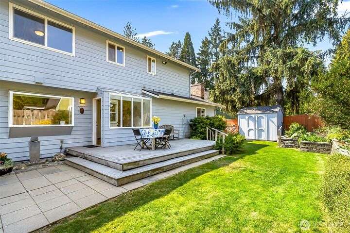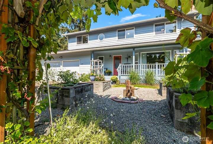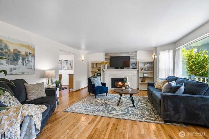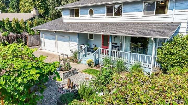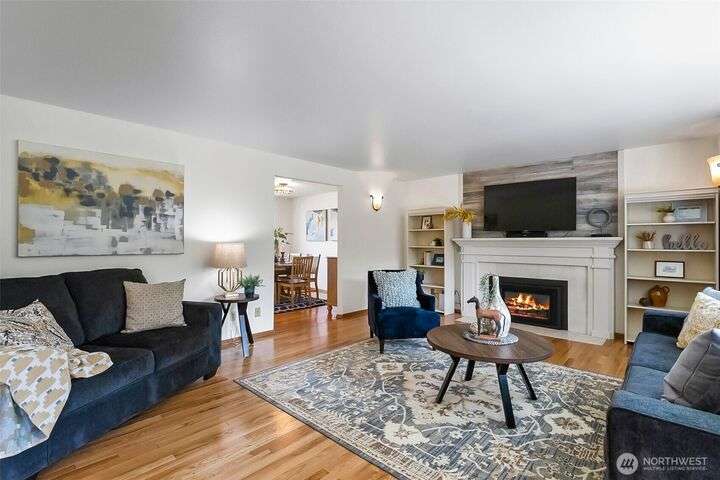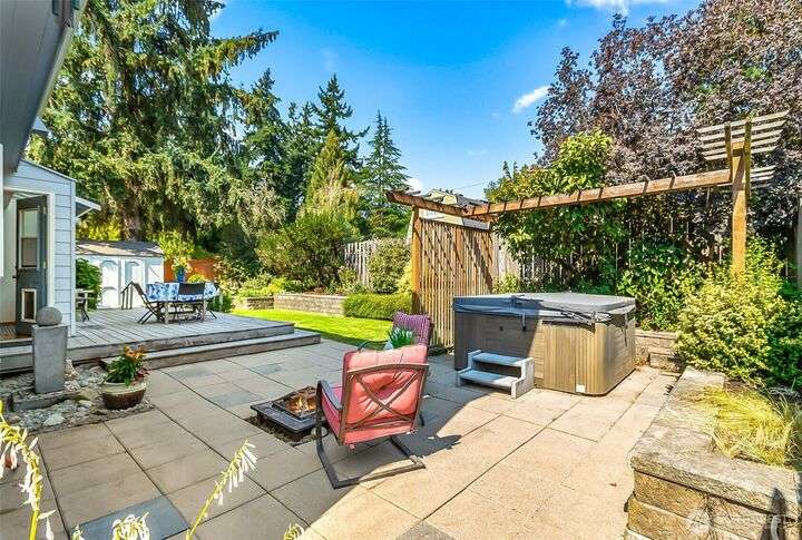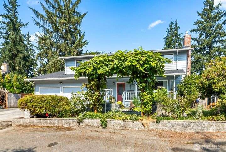 Beautifully maintained 2-story Shoreline home on quiet street with charming front porch, lush garden, fountain & grape-covered trellis. Main level features hardwood floors, gas frplc in LR, formal DR, spacious Kitchen w/dining nook. Family room has been converted into a main floor MIL-style bedroom & bathroom with its own fireplace. Upstairs offers Primary Suite w/walk-in closet & private bathroom, 3 add'l bedrooms, an office/craft rm w/custom cabinetry, laundry room, and full hall bath. Fully fenced backyard w/expansive deck, patio w/firepit & hot tub. 2-Car Garage, RV Parking, Driveway & Front Parking. Steps away from Cromwell Park & Trails. EZ access to I-5, Restaurants, Schools, Shopping. This home and location truly has it all!