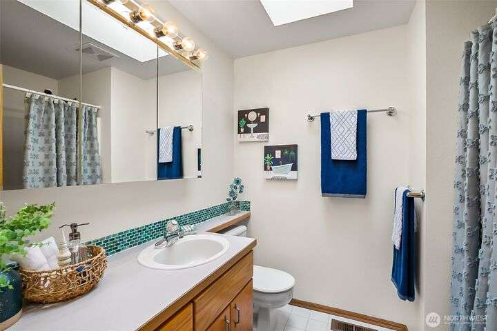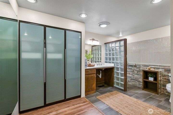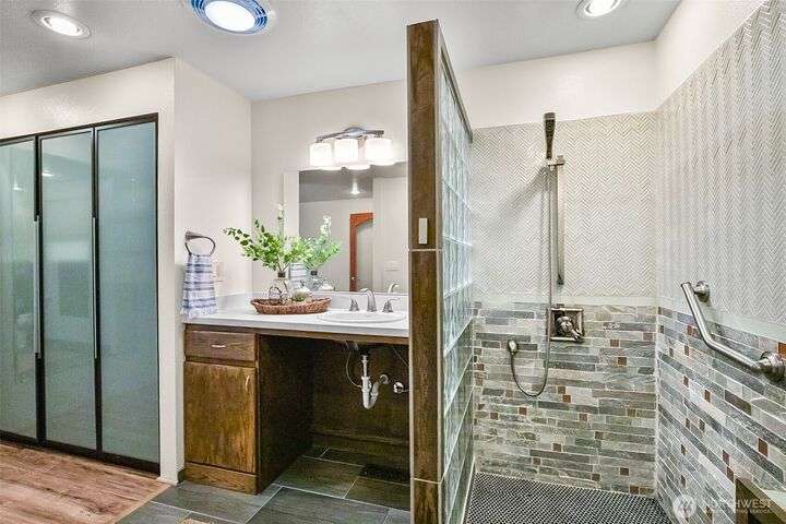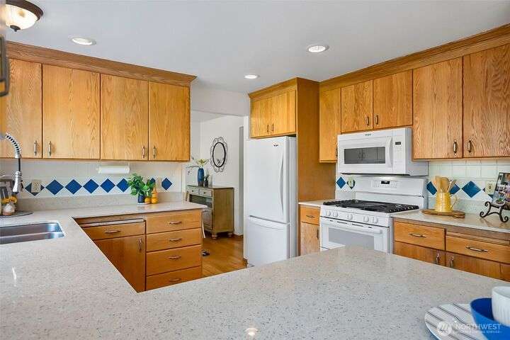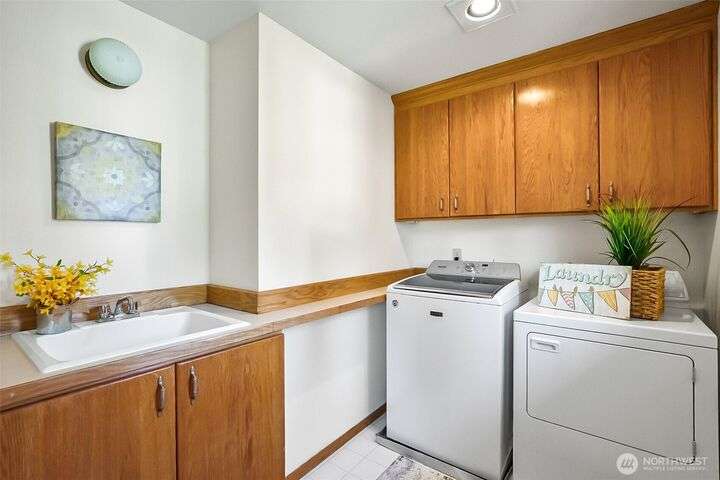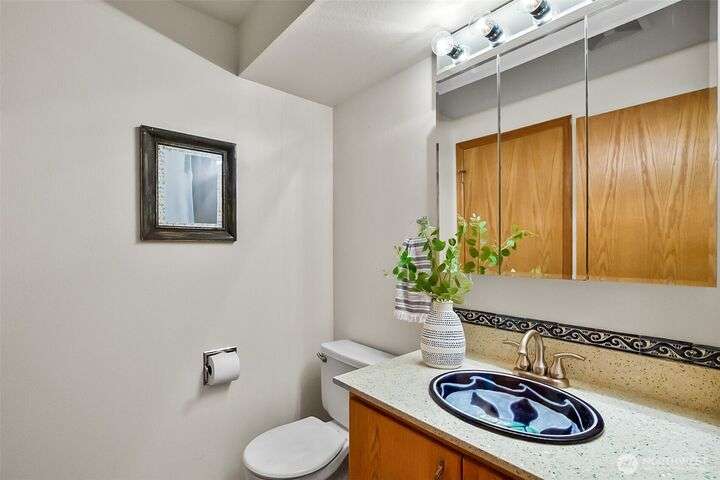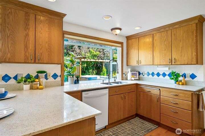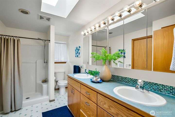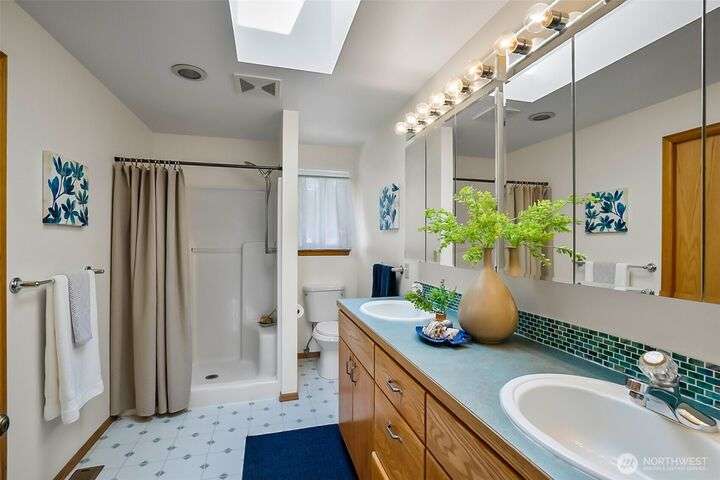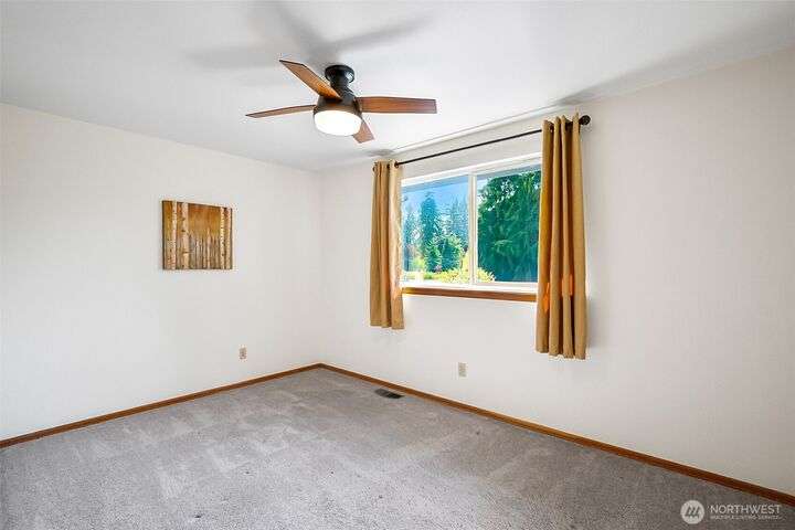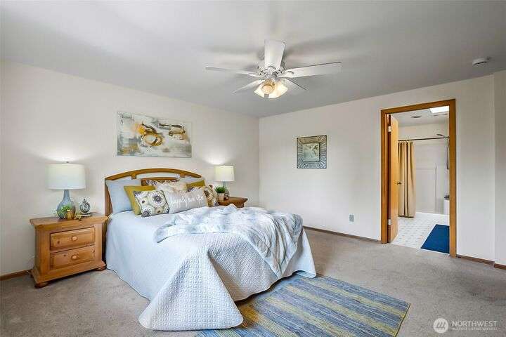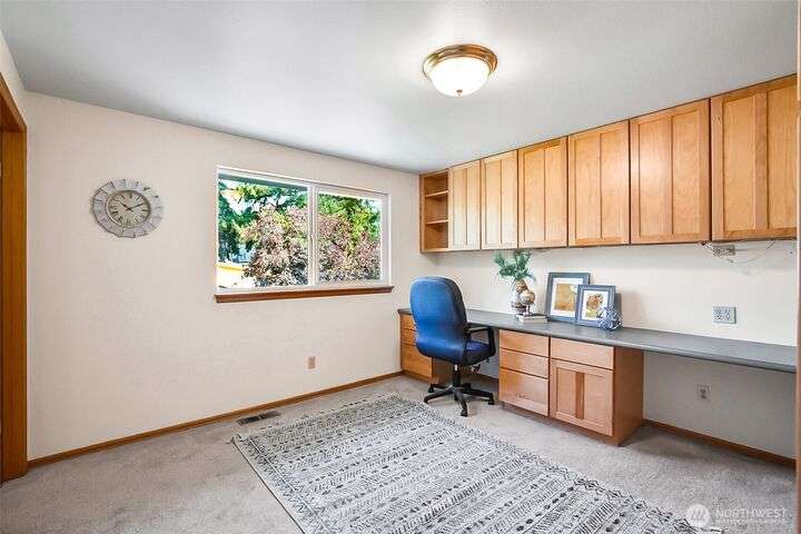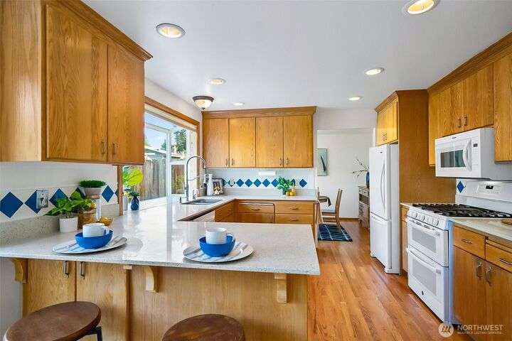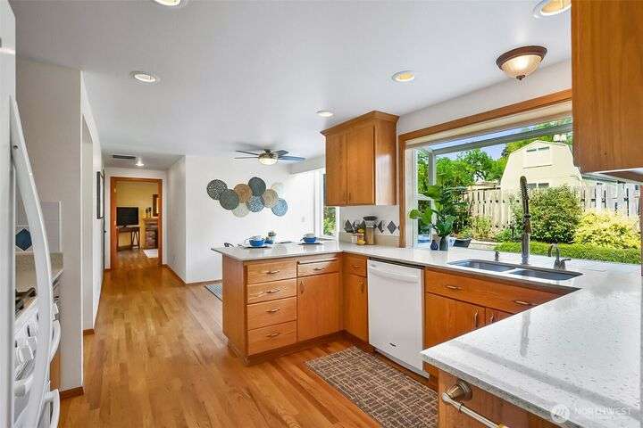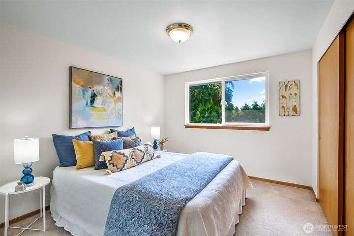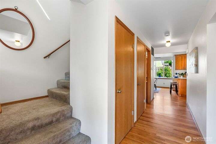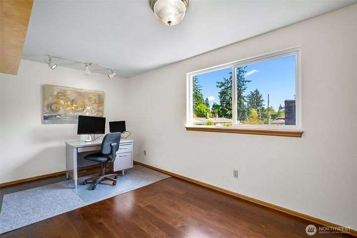 Beautifully maintained 2-story Shoreline home on quiet street with charming front porch, lush garden, fountain & grape-covered trellis. Main level features hardwood floors, gas frplc in LR, formal DR, spacious Kitchen w/dining nook. Family room has been converted into a main floor MIL-style bedroom & bathroom with its own fireplace. Upstairs offers Primary Suite w/walk-in closet & private bathroom, 3 add'l bedrooms, an office/craft rm w/custom cabinetry, laundry room, and full hall bath. Fully fenced backyard w/expansive deck, patio w/firepit & hot tub. 2-Car Garage, RV Parking, Driveway & Front Parking. Steps away from Cromwell Park & Trails. EZ access to I-5, Restaurants, Schools, Shopping. This home and location truly has it all!