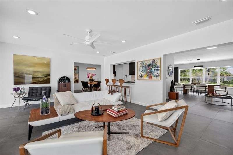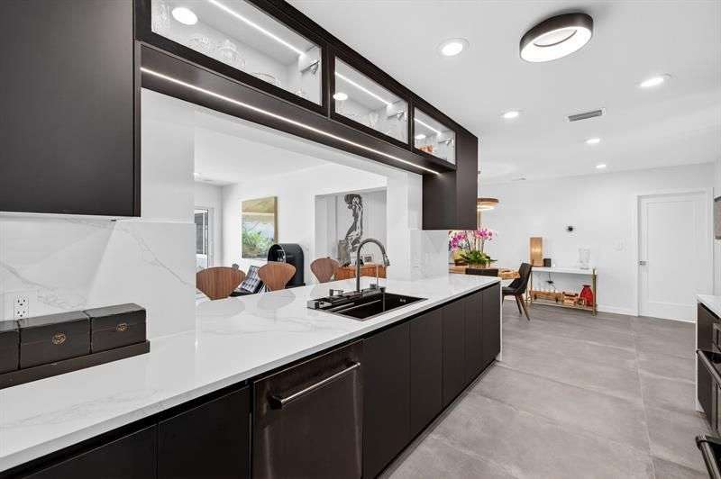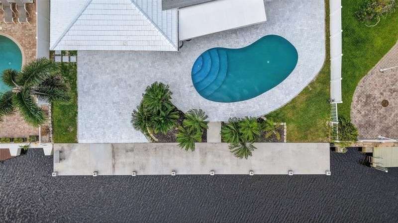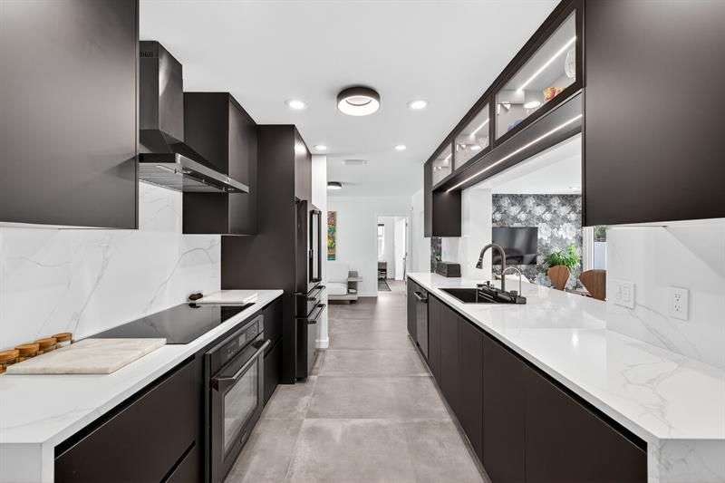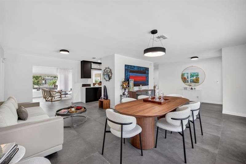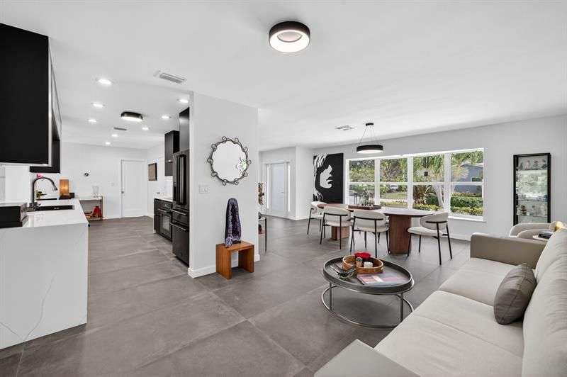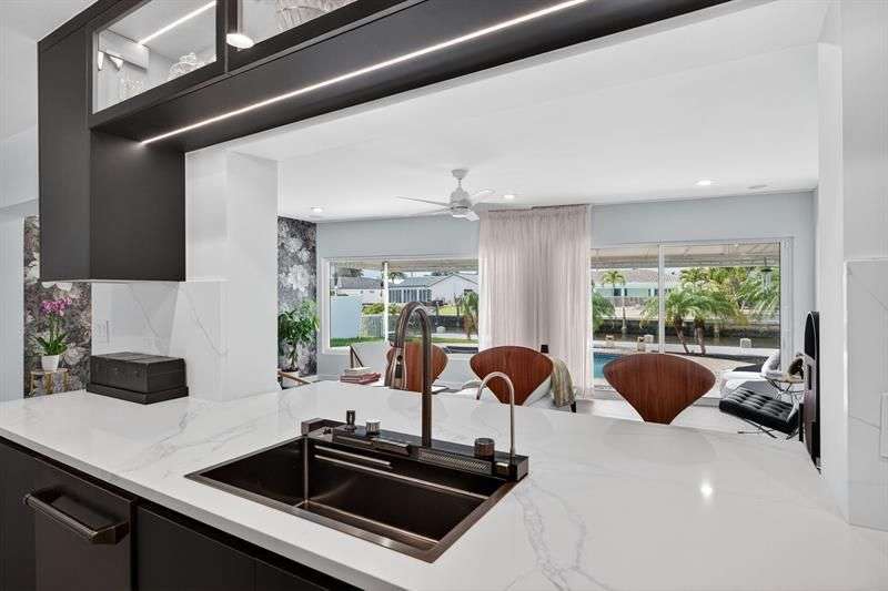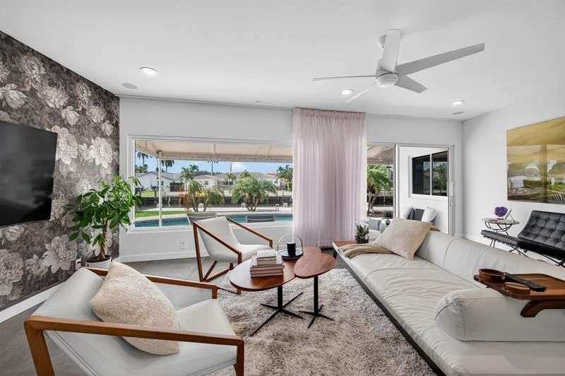 Nestled in The Landings, this fully renovated waterfront home has been meticulously crafted. From the striking chef’s kitchen with custom cabinetry, waterfall quartz counter, & top-tier ZLINE appliances, to the expansive open-living concept that seamlessly flows from one area to the next with an oversized slate grey porcelain tile. The primary bedroom features an en-suite bath, walk-in closet, & generous sitting area offering direct pool/water views through the impact sliding glass doors. 3 additional bedrooms & guest bath are positioned on the opposite wing of the home perfect for family/guests. The outdoor living experience is equally exceptional w/ brand-new pool, marble pool deck, concrete seawall & 75ft dock catering to the boating enthusiasts – offering ocean access w/1 fixed bridge.