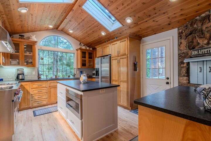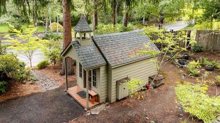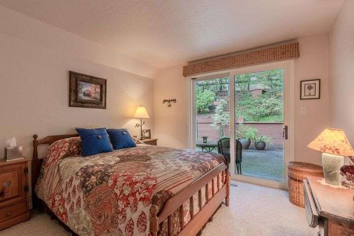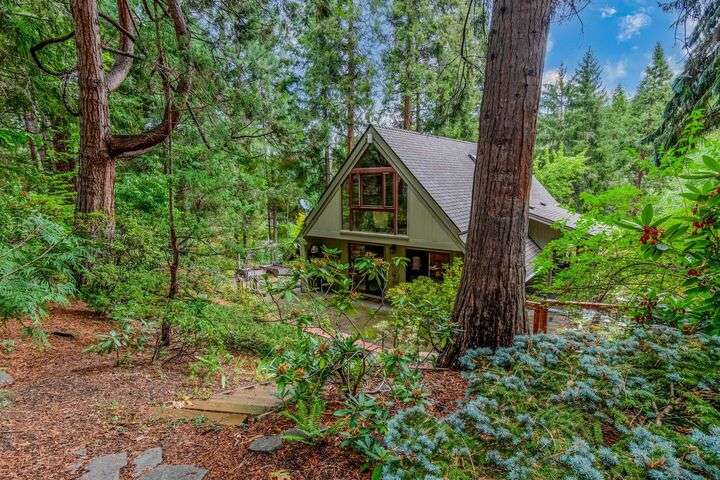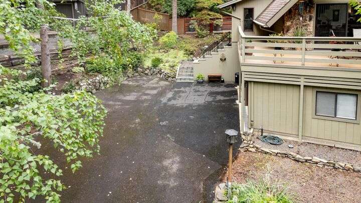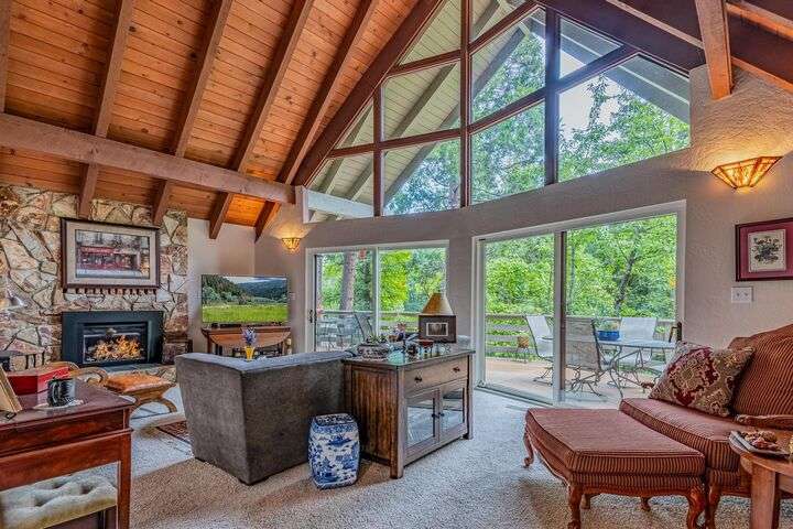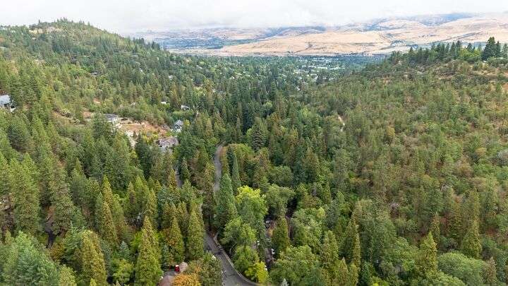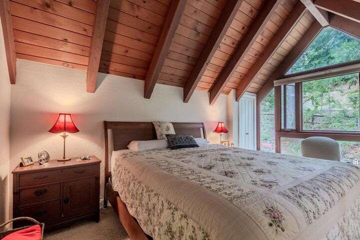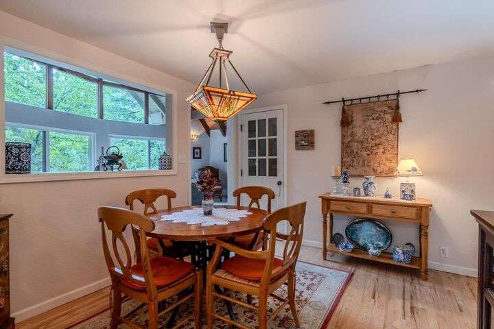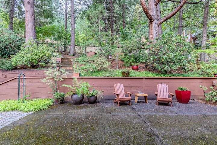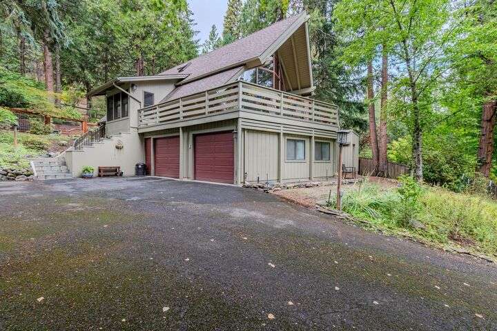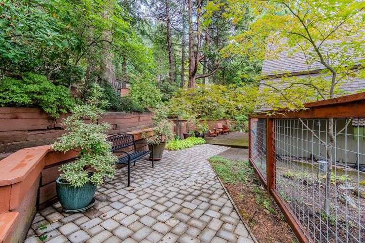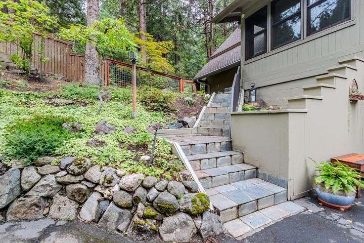 This storybook home blends timeless charm w/thoughtful updates in a private setting across from Lithia Park. Tucked back from Granite street on landscaped .36-acre TID-irrigated lot among cedars & dogwoods, it offers both tranquility & convenience. Light-filled living room w/floor-to-ceiling windows opens to a roomy deck, the perfect spot for enjoying the melodious sounds of Ash Creek winding through the park. The remodeled gourmet kitchen features custom cabinetry, leathered granite, tile backsplash, island w/microwave drawer, gas Wolf range & gas pizza oven. Two main-level bdrms open to a fenced yard with patio & enchanting gardens, while the upstairs master suite delights w/walls of windows & built-ins. The lower level provides laundry, 2-car garage, workshop, darkroom & bonus rooms. Detached flexible-use studio ideal for meditation, home office, hobbies. Moments from OR Shakespeare Fest, dining, skiing & trails, pickleball, Japanese gardens, this is a truly special & lovely home!