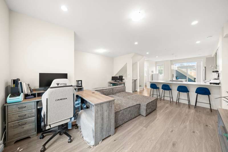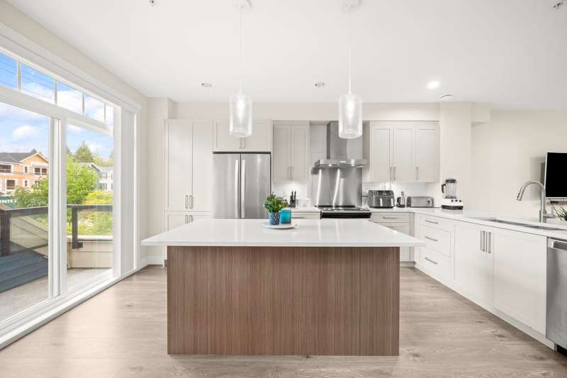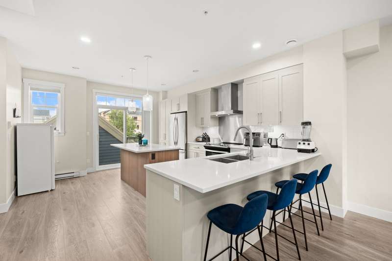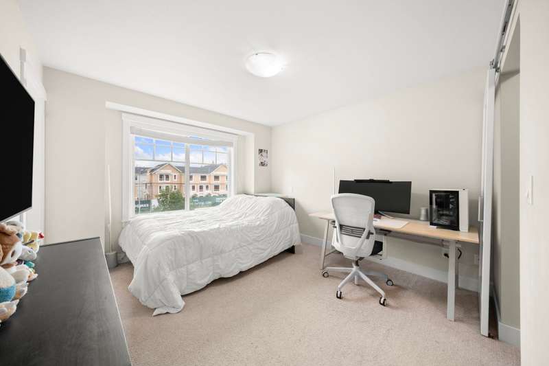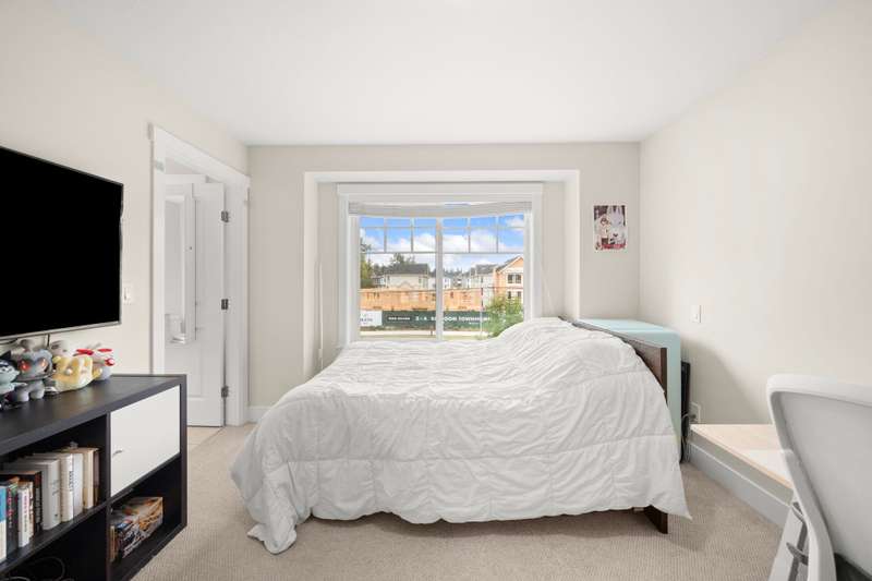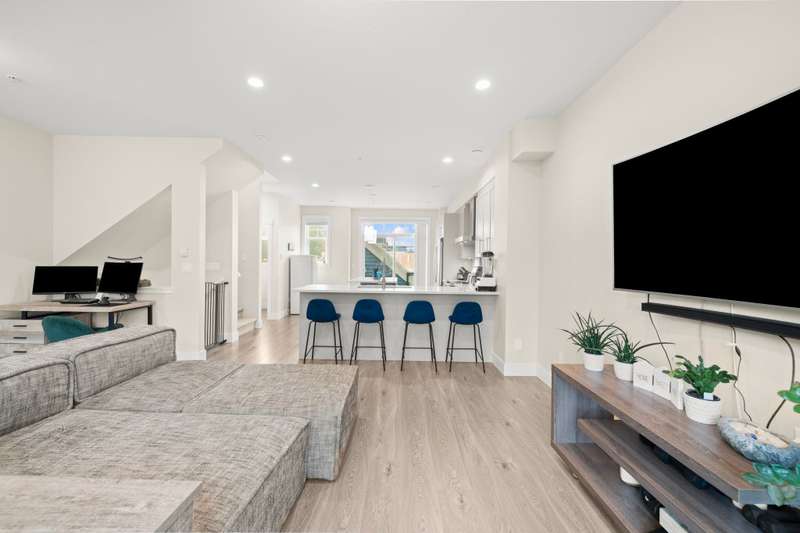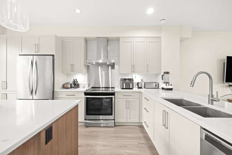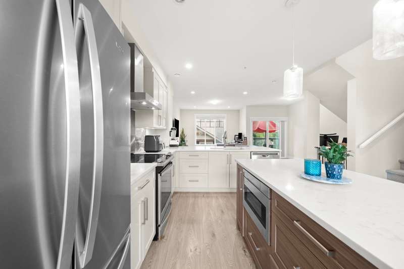 Perfect for both upsizing and downsizing, this rare end-unit townhome truly feels like a house! Backing onto a greenbelt, it offers 4 bedrooms, 3.5 baths, and 1,800 sq.ft. of bright, functional space. The main floor features an open-concept layout with 9' ceilings, spacious living/dining areas, 2 decks, and an L-shaped kitchen with shaker cabinets, quartz counters, stainless steel appliances, and pantry. Upstairs includes 3 bedrooms, highlighted by a serene primary with spa-inspired ensuite and walk-in closet. The lower level offers a versatile 4th bedroom/office, full bath, and walkout to a fenced yard. With double garage and extra spot on the driveway plus visitor stalls and steps to schools, parks, trails, shops, and restaurants, this home has it all.
