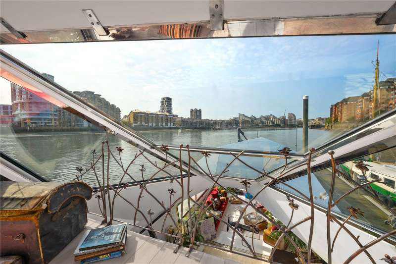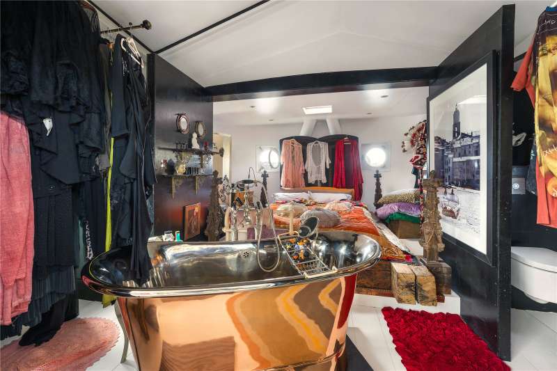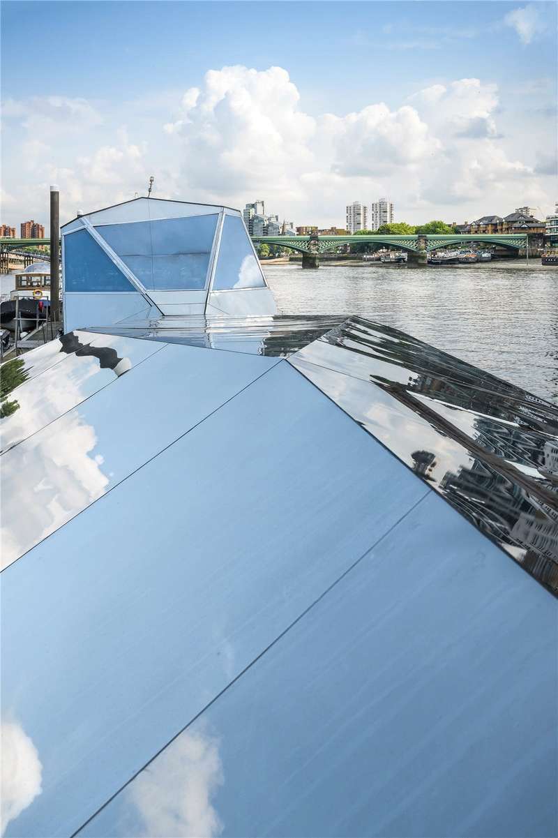 A pioneering 25 metre freehold houseboat; sculpted by artist Cyril de Commargue with its striking polyhedron mirrored exterior as his “Fluxland” project on a reimagined 1950's Dutch grain barge and now delivering sumptuous, light filled and bohemian interiors of 1,688 square feet / 156.9 square metres with ceilings up to 3.69 metres.