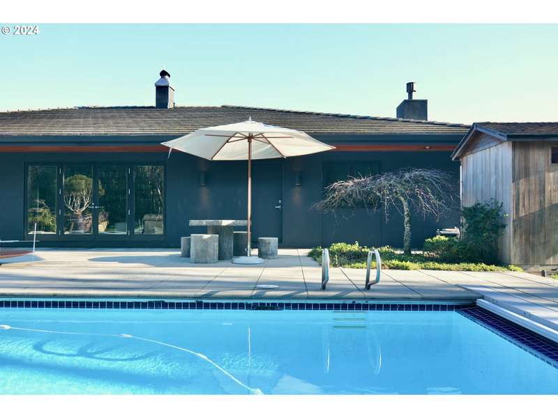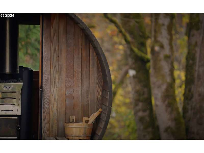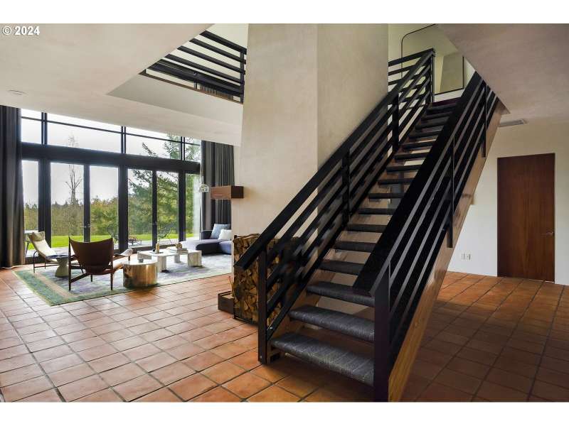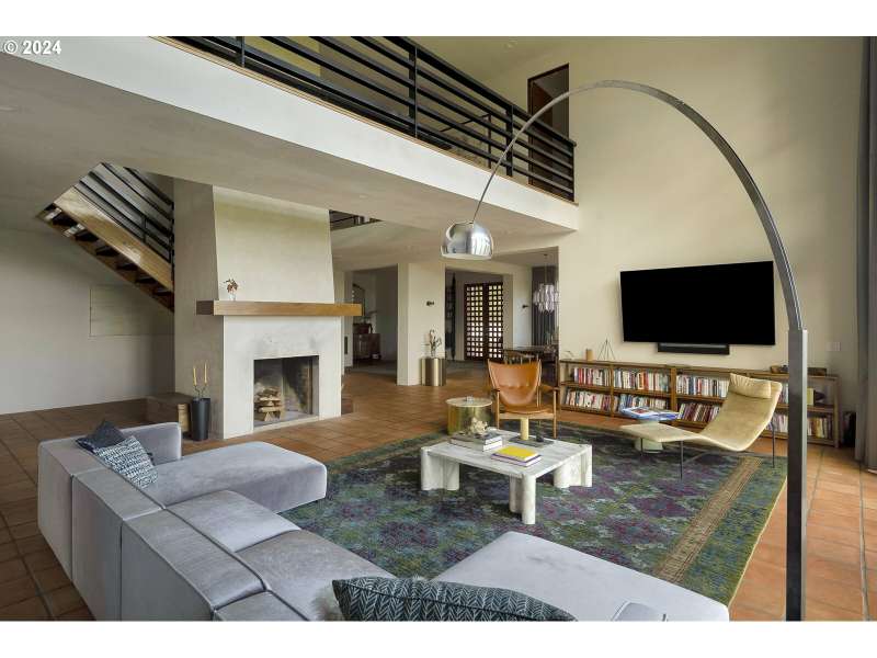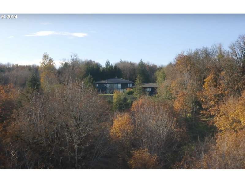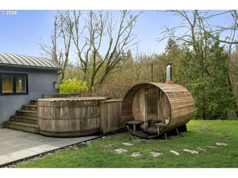 OPEN HOUSE SCHEDULED FOR 10/25 12-2 IS CANCELLED, WILL BE RESCHEDULED. This remarkable contemporary home welcomes at the top of a rise. Nestled on 11 acres of shared conservancy land with inspiring views of Mt Hood. The property is set on .6 acres and bordered by nearly 40 acres of protected forest land. With a gated private drive and exceptional privacy, this property offers a sense of seclusion, while still being conveniently located close to the city. Built in 2001, this Mission-inspired home boasts strong geometric lines, a stucco exterior, and expansive eaves, combining timeless design with modern updates, whole home water filtration and AC. The 4-bedroom, 3.5-bath layout spans two levels, seamlessly connecting indoor and outdoor spaces. The entry features double multi-paned doors and ample storage. An open floor plan with radiant heated Mexican tile flooring throughout flows through the main level, where the living room's double-height windows frame Mt. Hood. Anchored by a wood-burning fireplace, the space is bathed in natural light. The kitchen includes a Sub-Zero refrigerator, double ovens, a 6-burner cooktop, granite countertops, and a cozy breakfast nook. A versatile main-floor office with a gas fireplace, built-ins, and exterior access can function as a den, music room, or guest suite, adjacent to a full bath. Upstairs, the primary suite boasts a private covered balcony, Mt. Hood views, a gas fireplace, and a luxurious ensuite with a jetted tub, double shower, forest views and large walk-in closet. Three additional bedrooms, a full bath, a large den and a laundry room complete the upper level. The outdoor amenities are unmatched: a heated pool, 3 saunas (wood-burning, infrared + electric ) cold plunge, and hot tub—all surrounded by mature trees for privacy. The 8-car garage, with a mini split for heating and cooling, offers gym space and abundant storage. [Home Energy Score = 4. HES Report at https://rpt.greenbuildingregistry.com/hes/OR10234334]