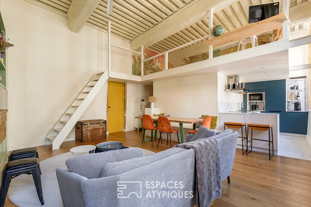 The spacious and welcoming living room is organized around a semi-open kitchen, perfectly equipped and designed to integrate seamlessly into the overall space. A custom-made bookcase, a clever bench seat, and numerous built-in storage spaces highlight the attention to detail. Overlooking the space, an elegant mezzanine enriches the space and offers a flexible space to suit your needs: a reading corner, office, or spare bedroom, it adds a truly extra dimension to the living room.