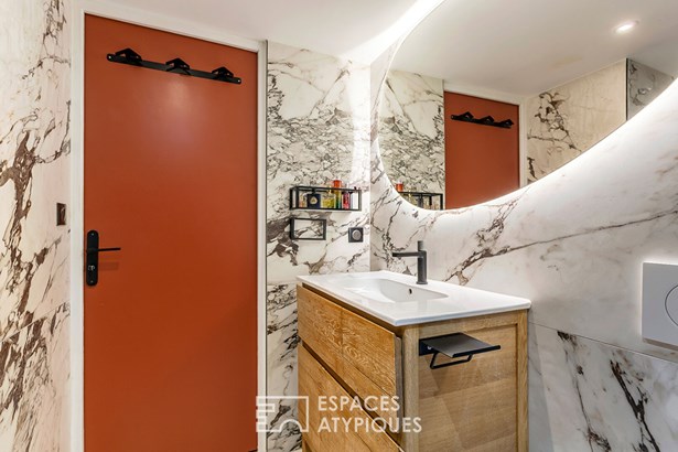 On the night side, the vast bedroom of over 16 sqm unfolds on the courtyard side. Bathed in light thanks to its large windows, it houses a generous dressing room and offers a peaceful and refined atmosphere.