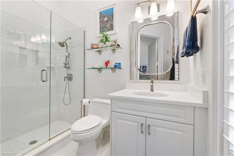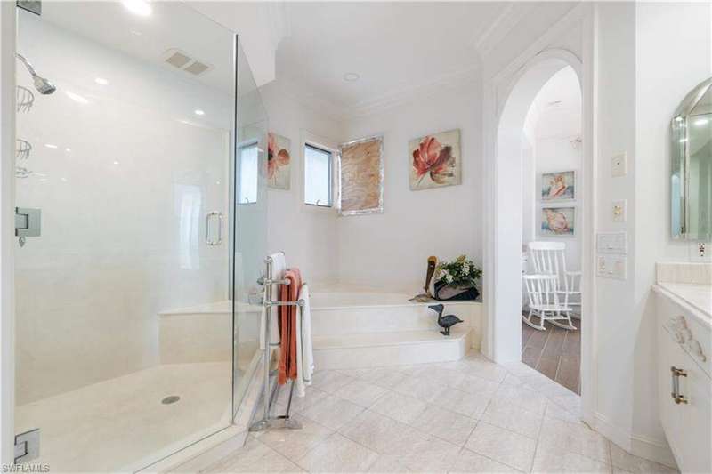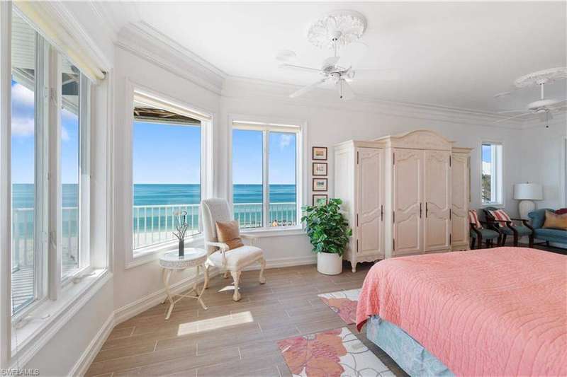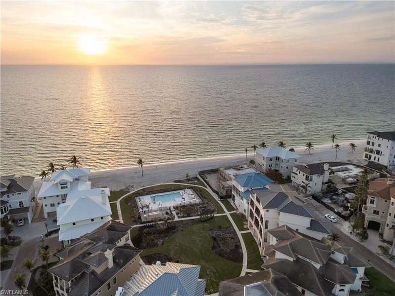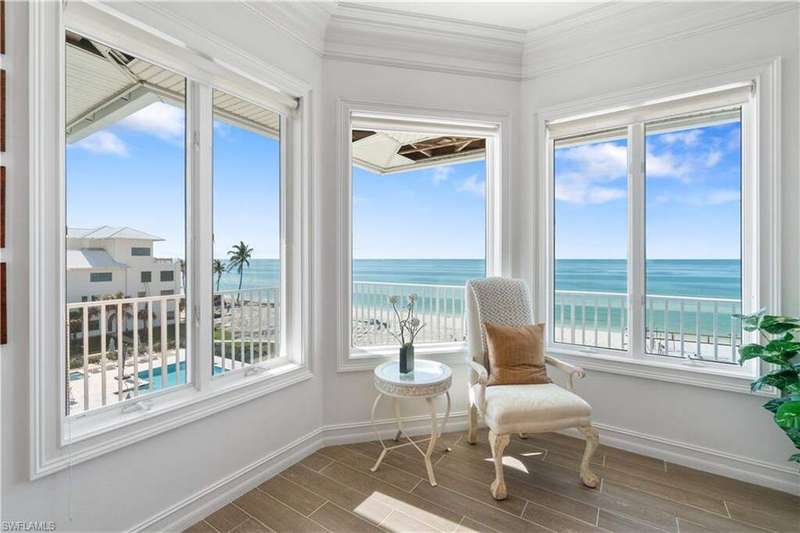 Stunning estate with breathtaking Gulf views in the highly coveted Beach Gardens of North Naples' Barefoot Beach Community. This remarkable residence offers unparalleled views of pristine sugar sands and the turquoise waters of the Gulf, with private beach access right at your doorstep. This second position home offers coveted Southwestern rear exposure, providing gorgeous natural light throughout the day and stunning sunset views in the evening. This 4 bedroom + a den, 3.5 bathroom coastal retreat boasts hurricane impact windows and sliders, electric hurricane shutters, a private elevator, soaring ceilings, tile flooring, and versatile ground-level flex space. The gourmet chef's kitchen showcases beautiful coffered ceilings, white cabinetry, granite countertops, an eat-in area, and a breakfast bar for casual dining. The open-concept layout allows for a seamless flow, with a spacious living room and a formal dining area with a domed ceiling and a charming fireplace. Step outside to the second-floor wraparound screened lanai offering a direct west and southwest view, where sweeping views of the Gulf and unforgettable sunsets await. The luxurious primary suite serves as a private retreat, featuring access to its own lanai, dual walk-in closets, a wet bar with a beverage cooler, and a spa-like bathroom with dual vanities, a frameless glass shower, and a separate jetted tub. The Beach Gardens community has undergone a stunning transformation, featuring lush landscaping and a resort-style pool. Optional membership to the exclusive "Club at Barefoot" provides access to tennis, two restaurants, beachside food and beverage service, and more. Conveniently located near fine dining, RSW Airport, Mercato, and Waterside Shops, and just 15 miles from the renowned Fifth Avenue in Naples, this home is a true gem in the heart of Barefoot Beach.