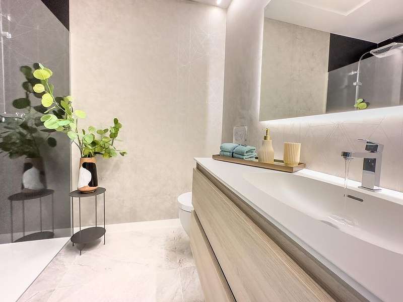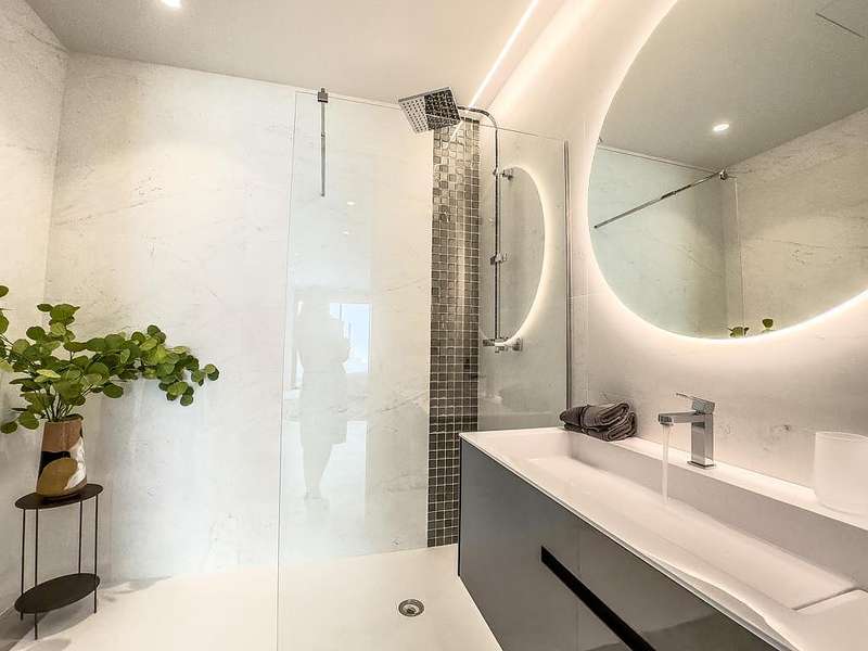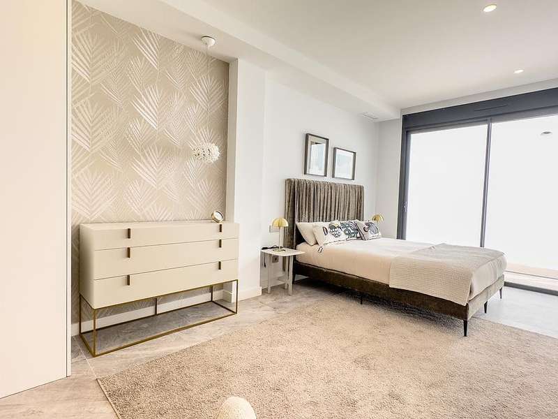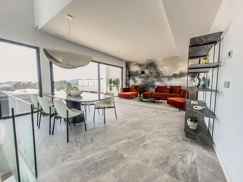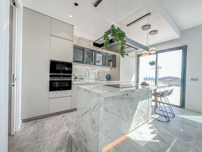The villas are in a modern design project, thoughtfully laid out on two levels interconnected by a lift for added convenience. Offering spacious living, the villas for sale in Finestrat Alicante feature 4 bedrooms and 5 bathrooms, ensuring ample accommodation for residents and guests alike. The open-plan kitchen seamlessly flows into the dining area and living room, creating a welcoming and sociable space. Large windows allow natural light and fresh air to permeate the interiors, enhancing the sense of brightness and comfort.