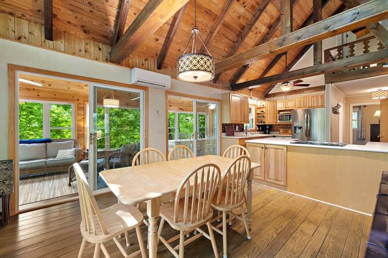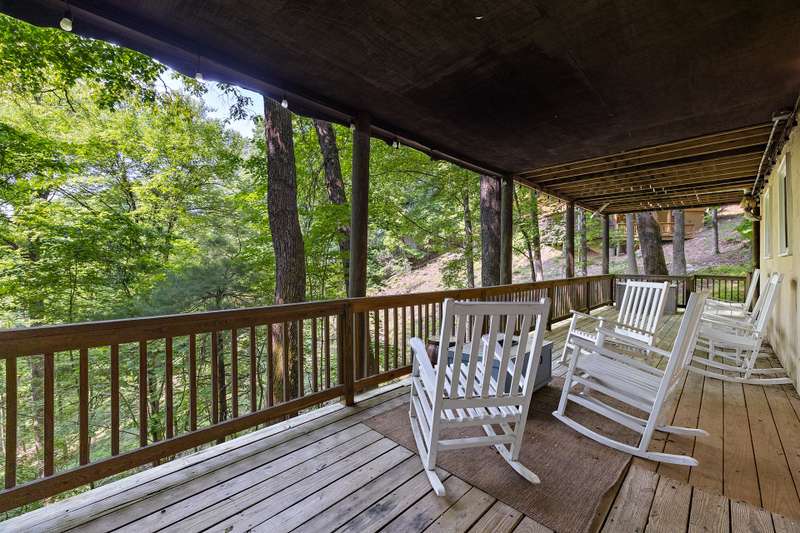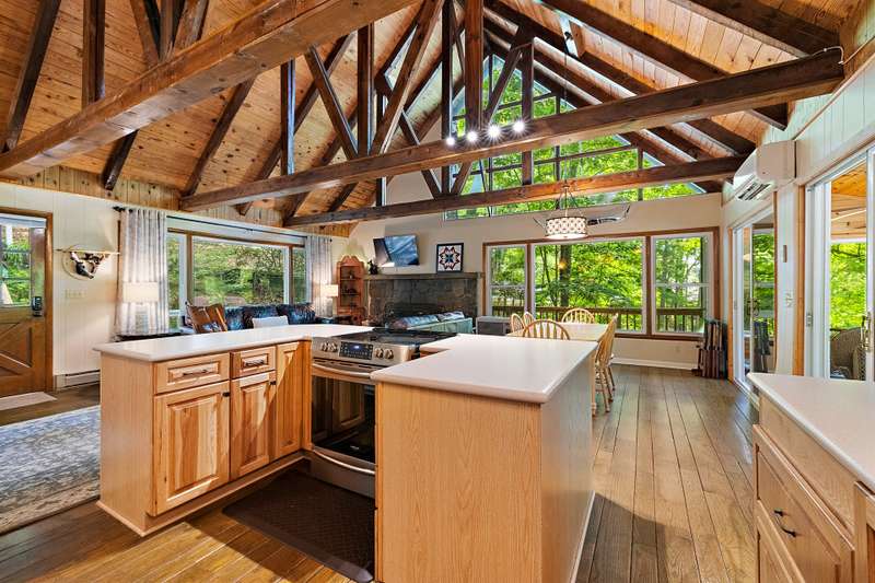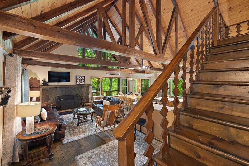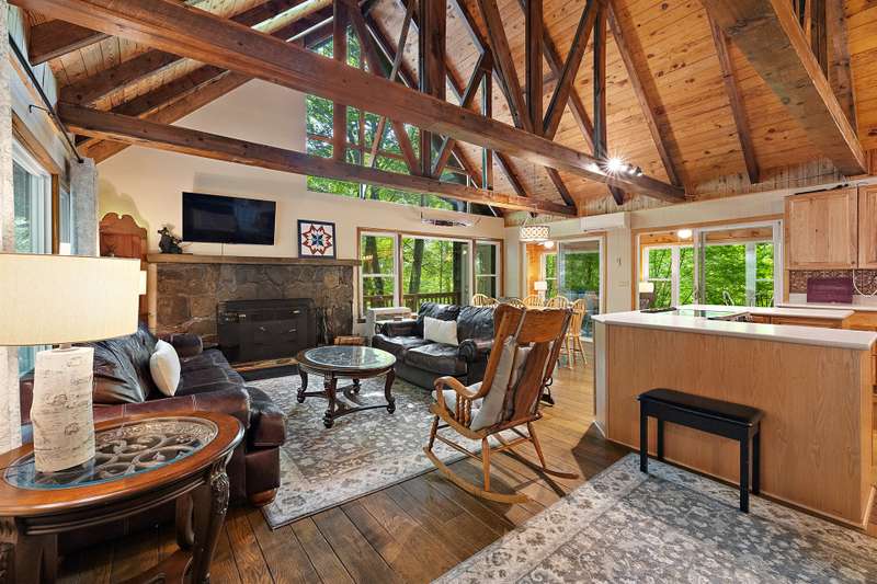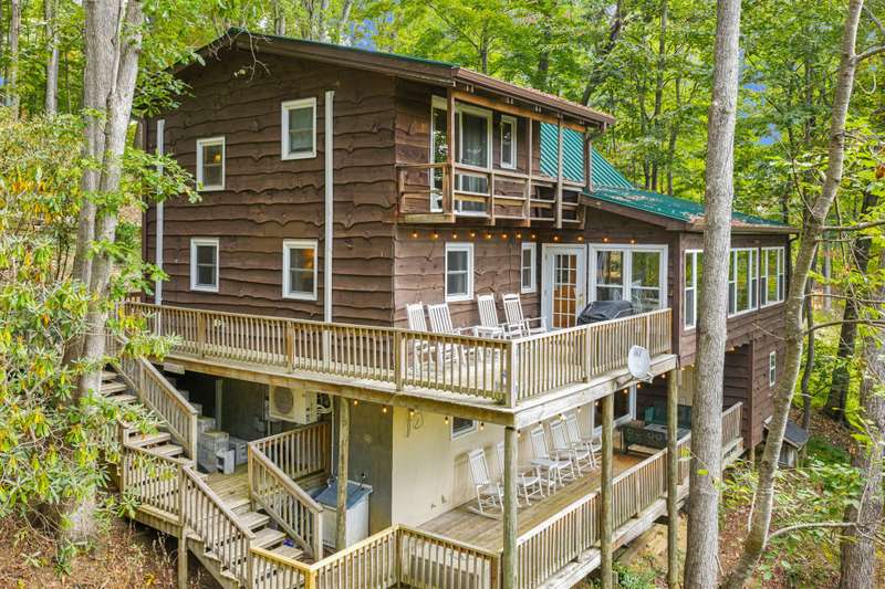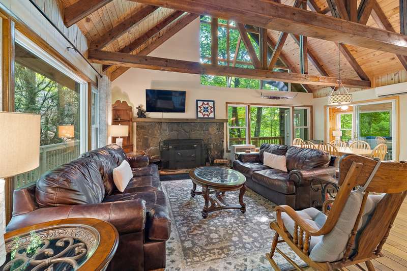 Discover the enchanting allure of this mountain retreat, perfectly nestled within the serene landscapes of Fleetwood Falls, directly across from the tranquil New River. This captivating property, a flourishing rental for outdoor enthusiasts, invites you to embrace the beauty of nature. As you step inside this 3-bedroom, 3-bathroom lodge, you're greeted by soaring vaulted ceilings and exposed wood beams that create an atmosphere of warmth and connection. The timbered great room, with its striking stone fireplace and inviting wide-plank flooring, beckons you to gather with loved ones. Expansive wall-to-wall windows frame stunning views that change with the seasons, enveloping you in the serenity of your surroundings. Significant upgrades enhance this haven, from new drywall and modern kitchen cabinets to efficient mini-splits on every level. A new water heater and a protective BCI metal roof, featuring a transferable lifetime warranty, ensure peace of mind. The basement features stylish LVP flooring, while a fenced area for pets and extended parking add convenience. Each level is designed for seamless indoor/outdoor living, perfect for entertaining and enjoying the natural beauty that surrounds you. Explore community hiking trails that lead to enchanting creek falls or find tranquility by the stocked lake, where you can engage in fishing and spend lazy afternoons at the pavilions. Centrally located between the vibrant towns of Boone and Jefferson, this home offers effortless access to adventures along Railroad Grade Rd, from tubing and kayaking to cycling, dining, and skiing. This remarkable lodge stands ready to be your successful rental, cherished second home, or spacious primary residence. Embrace the extraordinary and make this mountain retreat your own.