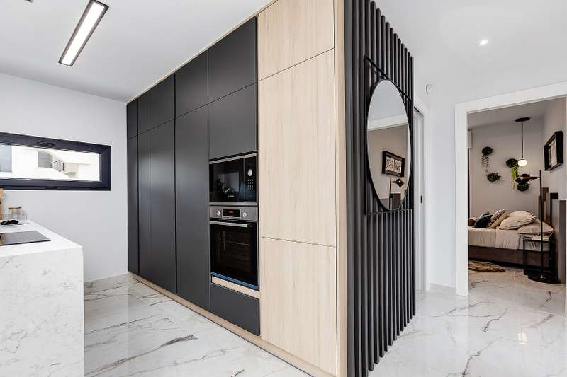 The apartments for sale in Torrevieja Alicante features an open-plan living room with a fully equipped kitchen. Homes are delivered furnished with high-quality appliances, air conditioning, electric blinds, and an energy-efficient aerothermal system for hot water. Bathrooms include underfloor heating, while terraces or gardens extend the living space outdoors. Every property comes with a private parking space for added convenience.