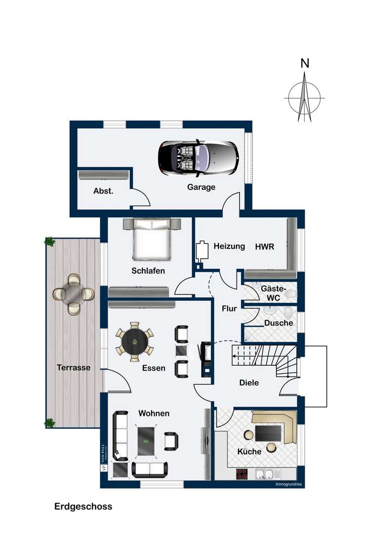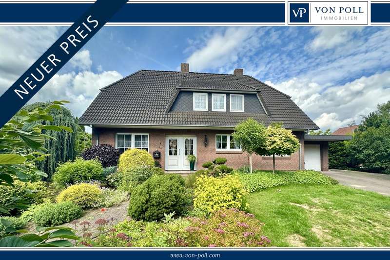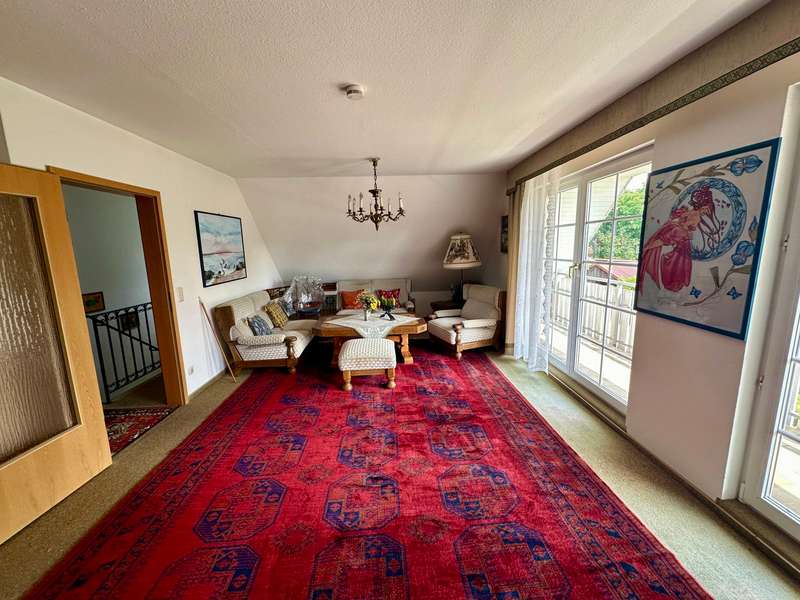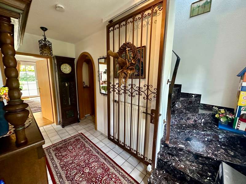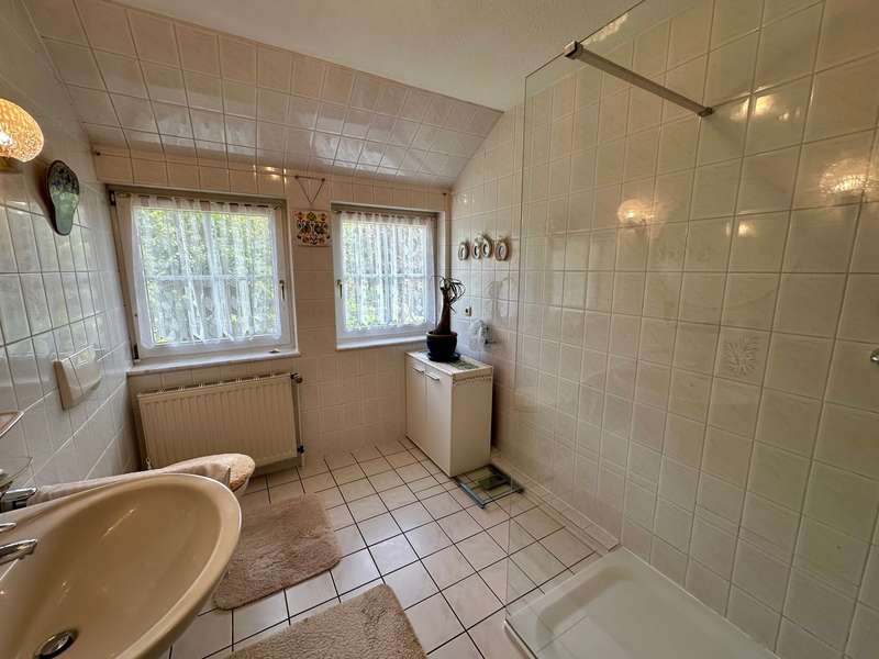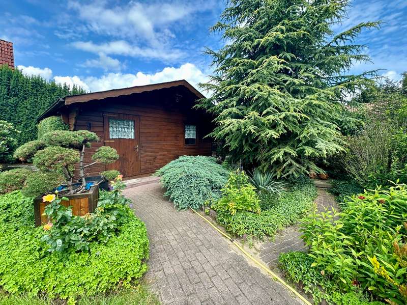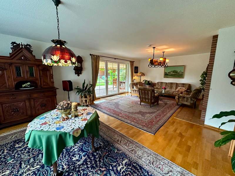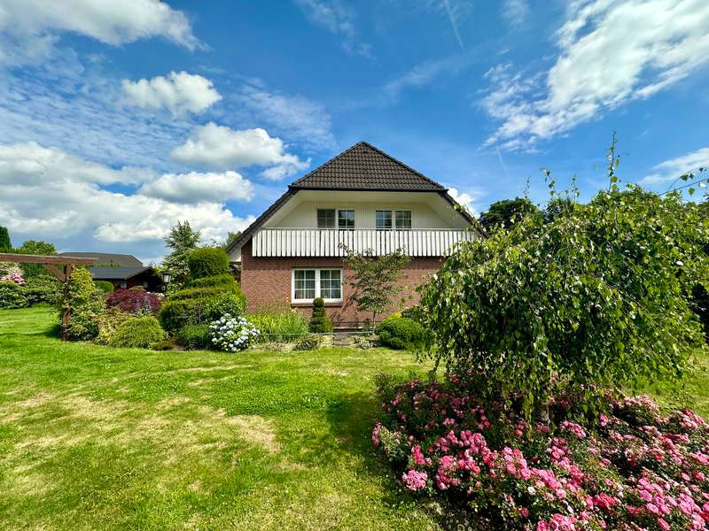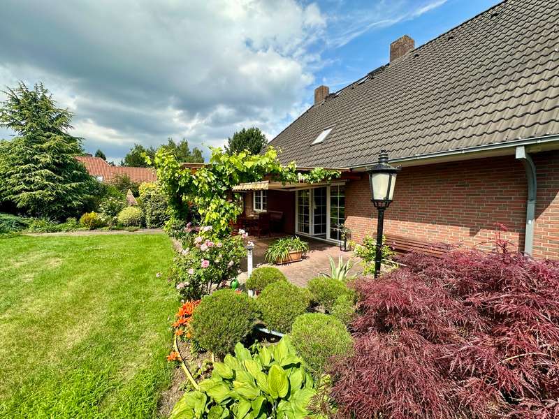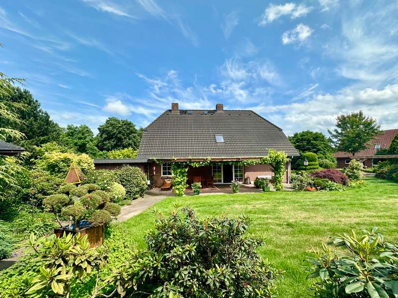 This spacious detached house with granny apartment is situated on an impressive plot of approx. 1,266 m² and offers a living space of approx. 194 m². Here you can expect not only comfortable and stylish living, but also a true garden paradise. The house impresses with its artfully landscaped garden, which is planted with rhododendrons, azaleas, globe maples, yew hedges and numerous fine conifers, shrubs and roses. The first floor is barrier-free and comprises an approx. 60 m² living room with fireplace and an adjoining, approx. 70 m² covered terrace. There is also a bedroom, a barrier-free shower room, a guest WC and an eat-in kitchen. A utility room, which also serves as a utility room, is also located on the first floor and provides access to the adjoining garage. The upper floor can be used as a granny apartment and is currently used as a sleeping area, office and guest area with an approx. 60 m² living room/bedroom with loggia and a barrier-free shower room. One room is intended as a kitchen and is prepared with the corresponding house connections. There is also a Finnish sauna and steam sauna from Rensch Saunabau on the upper floor. Summary: Detached house with granny flat Plot size: approx. 1266 m² Living space: approx. 194 m² Barrier-free first floor with large living room, fireplace, covered terrace, bedroom, shower room, guest WC and eat-in kitchen Upper floor can be used as a granny apartment, with living room/bedroom, loggia, shower room and prepared kitchen Finnish sauna and steam sauna on the upper floor Landscaped garden with a variety of plants Take advantage of this unique opportunity and arrange a viewing today. See this unique offer for yourself and be inspired by the extraordinary atmosphere of this house.