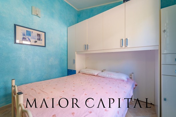 Access is via an external staircase leading to the first floor, where there is a large covered veranda with sliding glass doors, which can be used all year round as an additional living room. From here, you enter the interior, which is organised into a single, welcoming space that houses the living room with an open-plan kitchen and the sleeping area with two large, adaptable double bedrooms that can be converted into twin rooms or rooms with bunk beds, perfect for families or guests. The floor is completed by a bathroom with a window and shower.