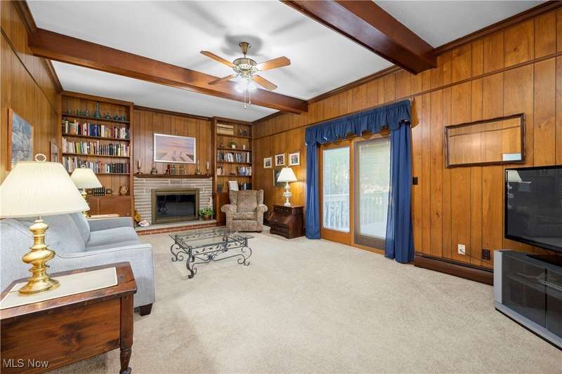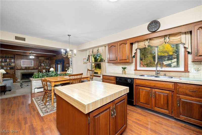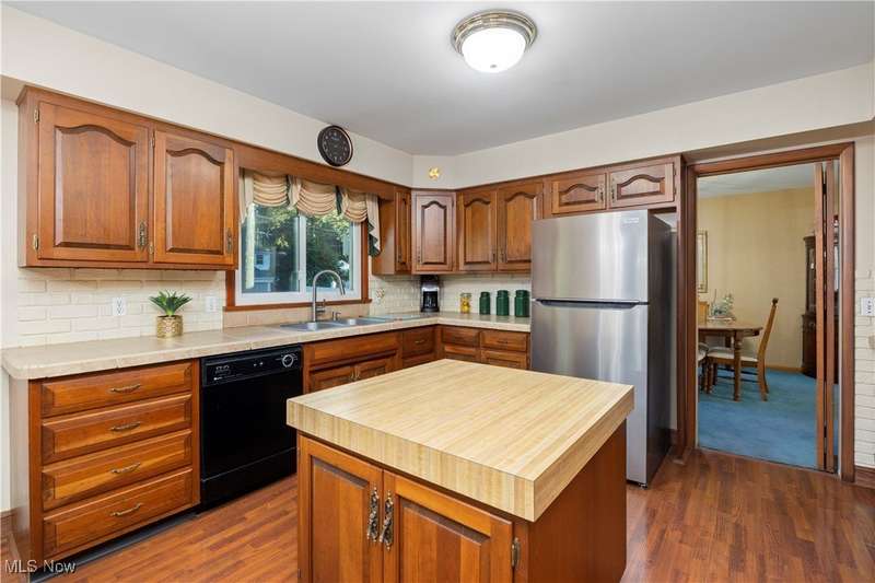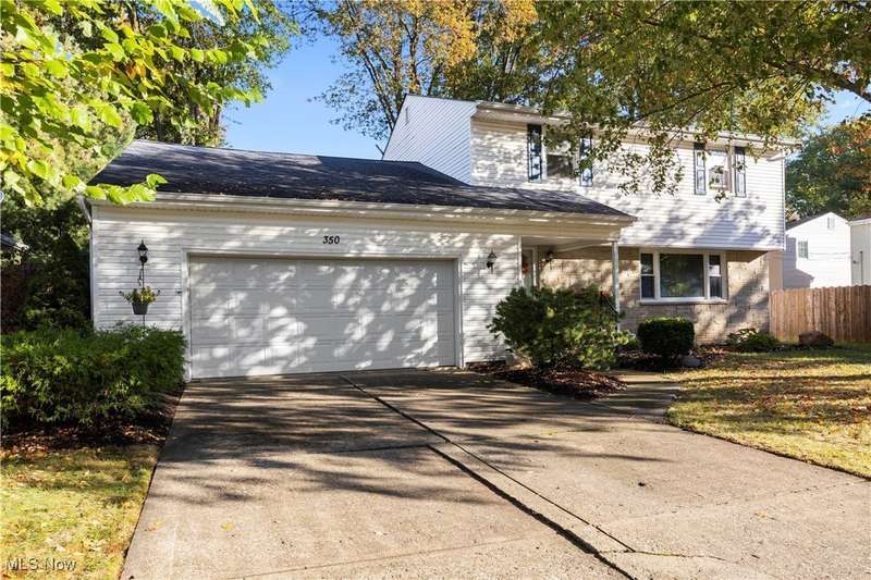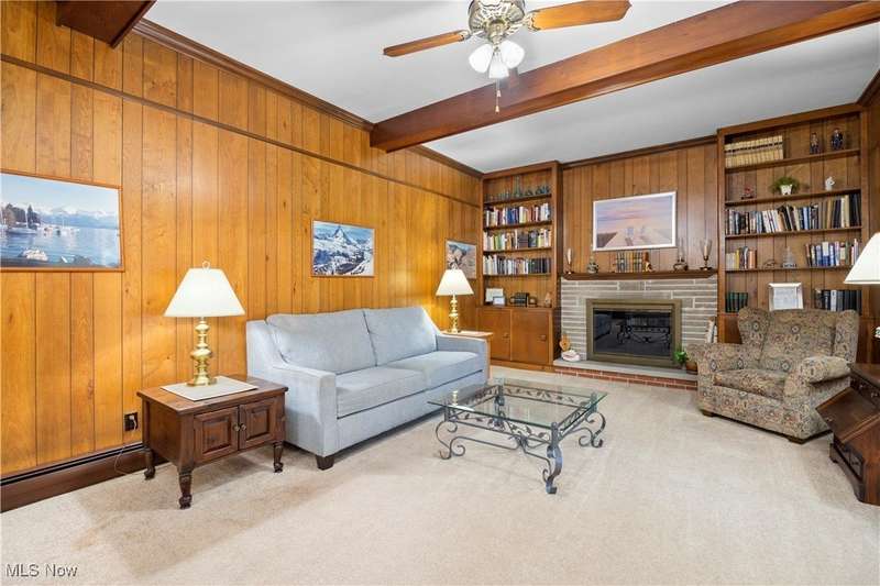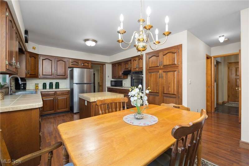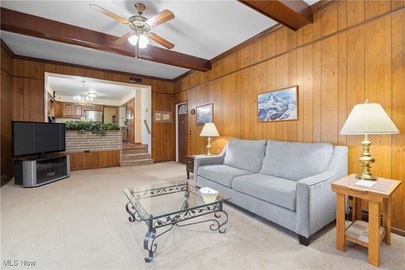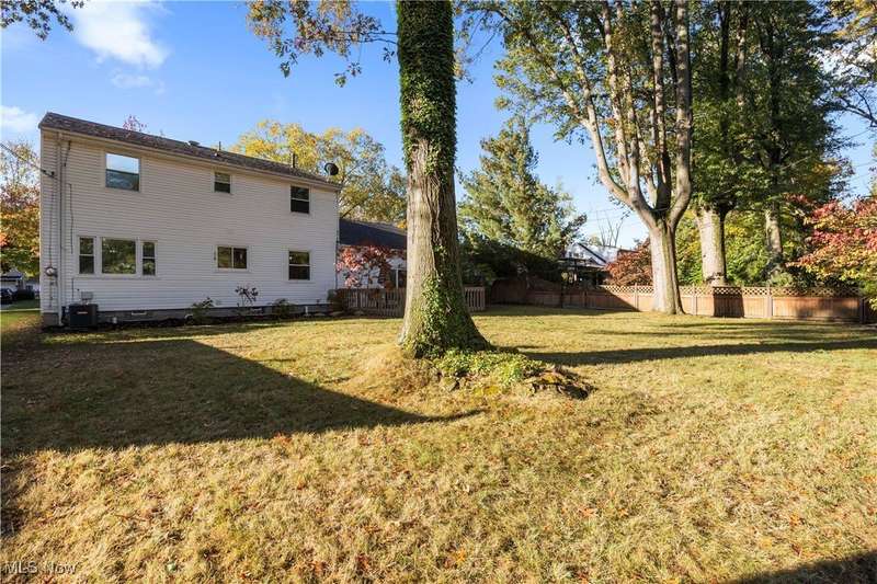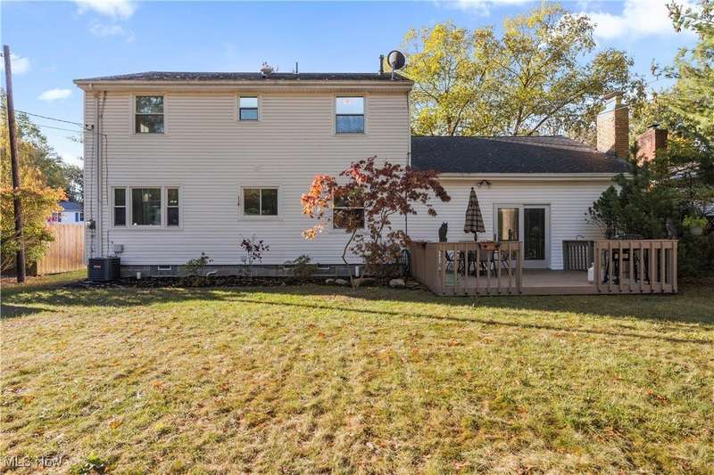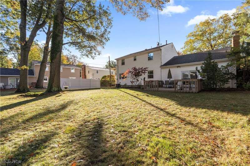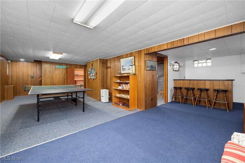 A lovely home. You'll enjoy the location nestled just around the corner from schools, parks/rec, walking trails and more! Welcoming exterior with pretty sandstone accents, and a covered front porch. Enter a spotless interior that gleams with long term pride of ownership! Foyer entry accented with a natural wood banister on the staircase and a unique front door with sidelite. Spacious living room and dining rooms! The kitchen is loaded with charm and practicality. It boasts a double wall oven, unique pantry with added storage and a center island with butcher block top! Enjoy cozying up in the family room complete with a beautiful stone fireplace and built in shelving! The wood paneling and beamed ceiling add rustic appeal and coziness. FOUR upstairs bedrooms upstairs and two full baths. The Primary bedroom has a private full bathroom. Vinyl siding and replacement windows. Beautiful backyard setting on a 70x140 homesite tucked under mature trees and a spacious deck for outdoor relaxation. There is a partially finished basement with carpeted bonus room and a retro bar/lounge area! Lots of built in storage in the laundry space. This is a home that radiates with positive energy and comfort!