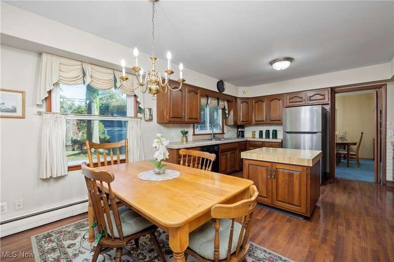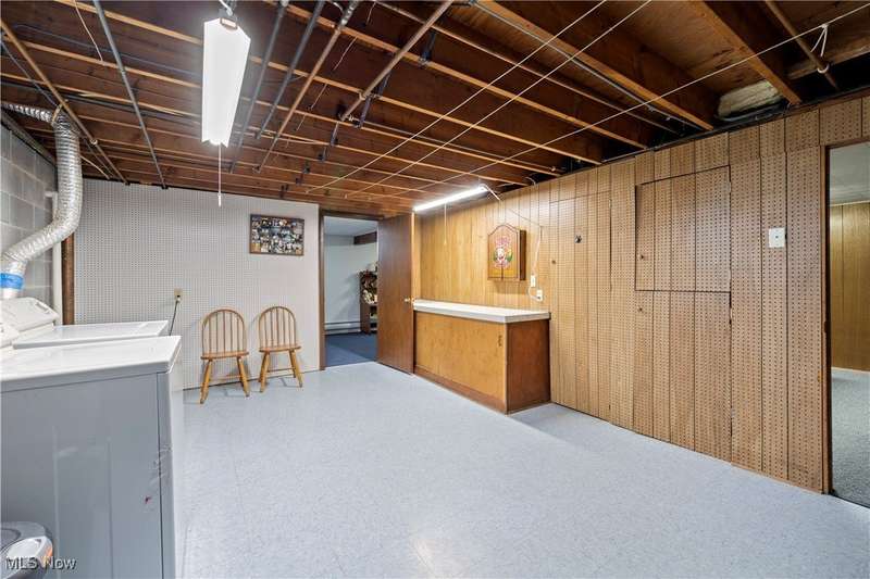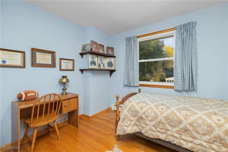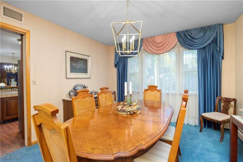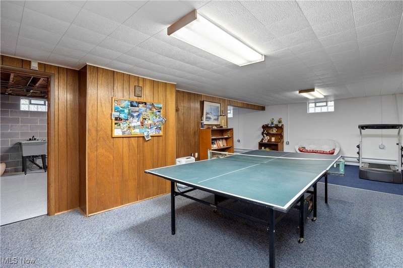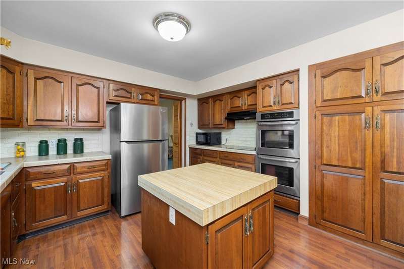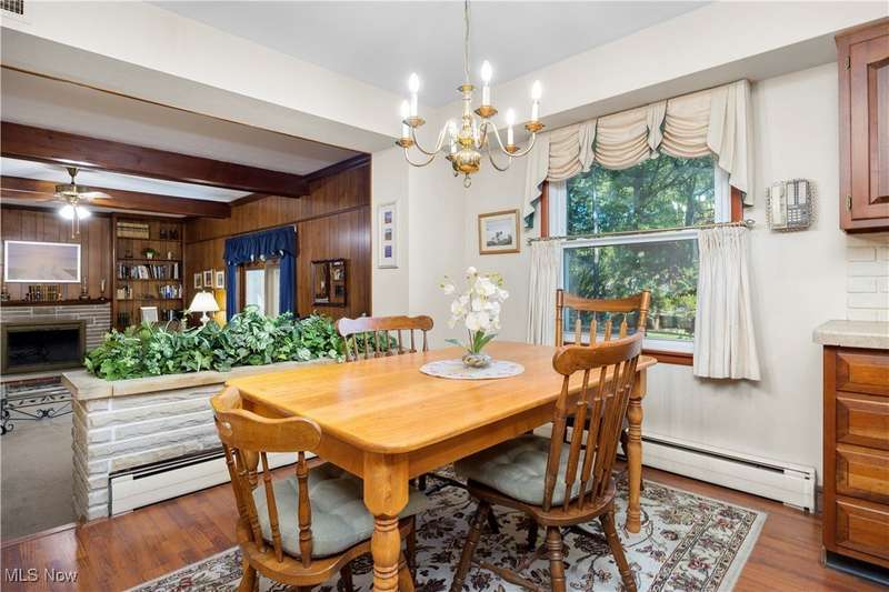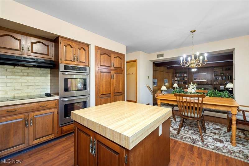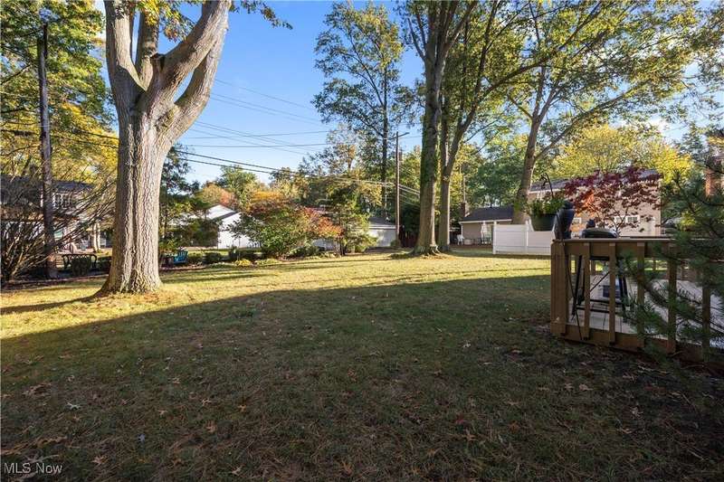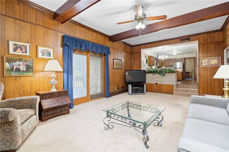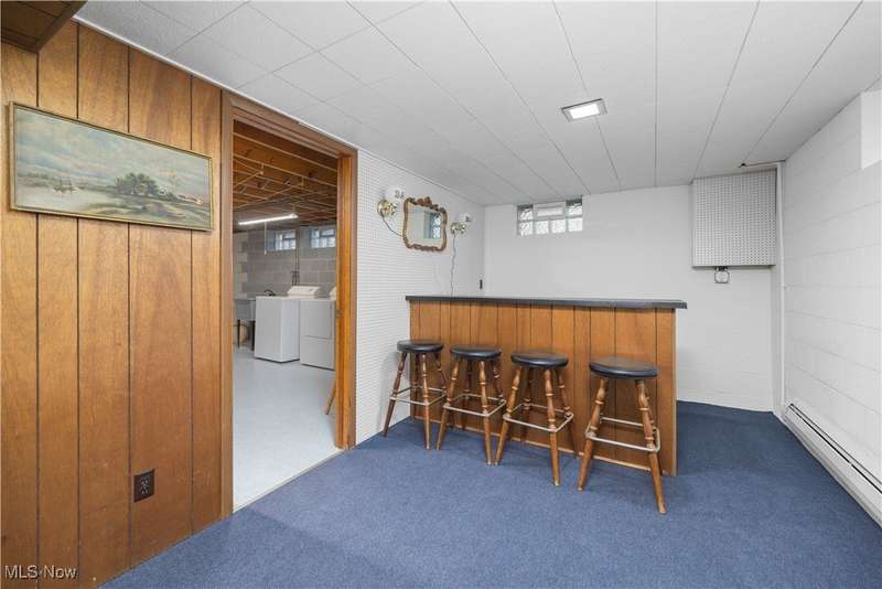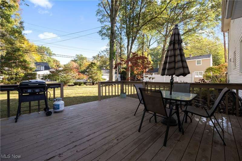 A lovely home. You'll enjoy the location nestled just around the corner from schools, parks/rec, walking trails and more! Welcoming exterior with pretty sandstone accents, and a covered front porch. Enter a spotless interior that gleams with long term pride of ownership! Foyer entry accented with a natural wood banister on the staircase and a unique front door with sidelite. Spacious living room and dining rooms! The kitchen is loaded with charm and practicality. It boasts a double wall oven, unique pantry with added storage and a center island with butcher block top! Enjoy cozying up in the family room complete with a beautiful stone fireplace and built in shelving! The wood paneling and beamed ceiling add rustic appeal and coziness. FOUR upstairs bedrooms upstairs and two full baths. The Primary bedroom has a private full bathroom. Vinyl siding and replacement windows. Beautiful backyard setting on a 70x140 homesite tucked under mature trees and a spacious deck for outdoor relaxation. There is a partially finished basement with carpeted bonus room and a retro bar/lounge area! Lots of built in storage in the laundry space. This is a home that radiates with positive energy and comfort!