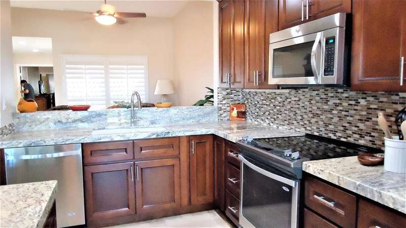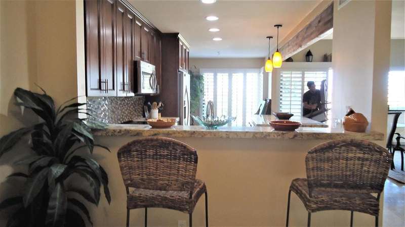 Updated! The kitchen has been opened to create one large great room. The baths and floors are beautifully tiled, new mirrors,, sinks, etc. Located in South Palm Desert, minutes above El Paseo, you will be soothed by the calm of the mountains or you may be hiking them! Great trails practically at your doorstep. This beautifully furnished two bedroom plus living room and additional media area/den will make you feel right at home yet...as though you are staying at a resort. The well equipped kitchen allows you to cook to your heart's content. Enjoy your feast at the breakfast bar, dining table or al fresco on the patio with a barbecue. Both the Master and Guest have king-size beds. There is an abundance of closet space and the Master is an en suite. Guests will enjoy their privacy as there is good bedroom separation. Patio views are incredible with mountain and valley views. Two pools and tennis courts are close by. Rental includes utilities, trash, HOA dues, cable and WiFi.