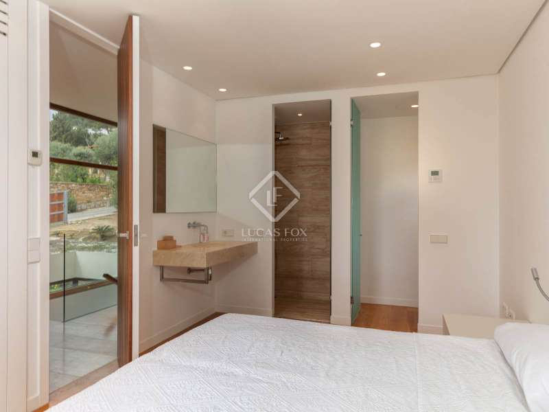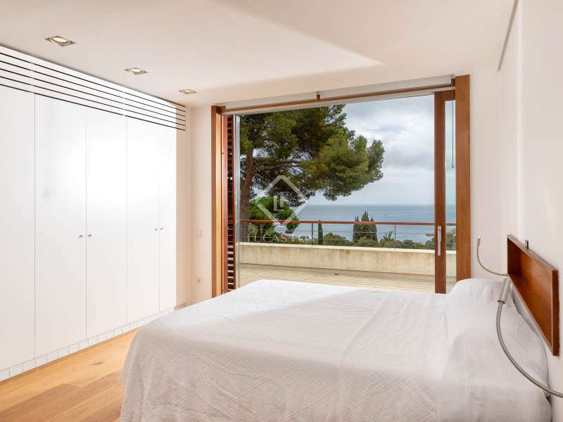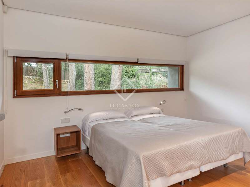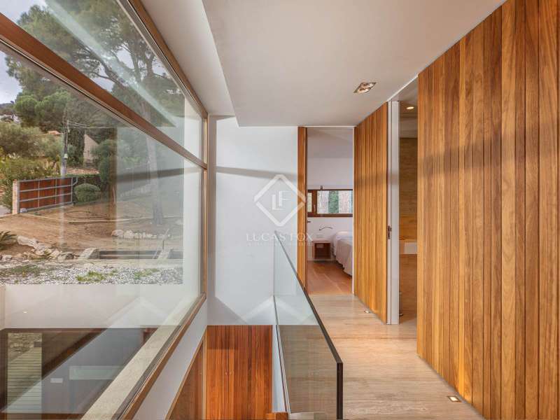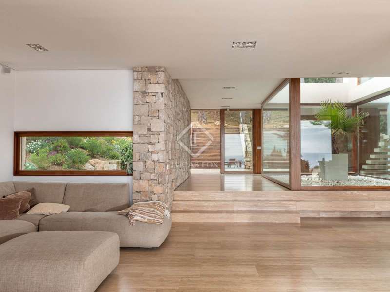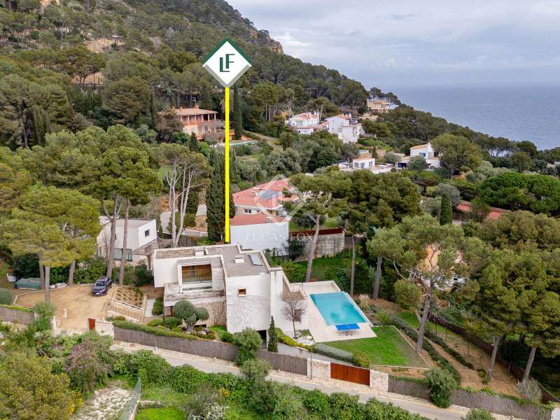 Fabulous house in the sought-after area of Aiguablava, one of the most attractive locations on the Costa Brava. This property was designed and built by a renowned local architect and has been featured in several national architecture publications. Located within walking distance of the beach, the Camino de Ronda, and various amenities, the house sits on a gently sloping plot, maximizing the use of space and adding a sense of openness and comfort. On a 1,945 m² plot, this spectacular home offers four bedrooms, with the option of a fifth for service quarters. From the very first moment, the house impresses with its majestic entrance, where opening the main door reveals a spectacular view of the sea and the surrounding pine forest. The ground floor is centered around an elegant glass-enclosed interior patio, which not only creates a striking aesthetic impact but also floods the house with natural light, enhancing the feeling of transparency and connection with the surroundings. On this level, we find a spacious living-dining area with a fireplace, seamlessly integrated with the outdoor area, featuring a cozy chill-out space with an outdoor fireplace and a magnificent pool. From the living room, we pass through the indoor dining area, which connects to a semi-open kitchen that also links to the outdoor dining space and barbecue area. Ascending an elegant staircase that wraps around the interior patio, we reach the sleeping quarters, consisting of four bedrooms. The master suite features a spacious bedroom with a walk-in closet, access to a terrace with breathtaking views of the Mediterranean, and a full bathroom with a bathtub. A second suite, slightly smaller, includes a full bathroom with a shower and direct access to the terrace. Two additional double bedrooms—one with direct access to the terrace and sea views, and the other overlooking the garden—share a full bathroom with a shower. The semi-basement level is designed for leisure and relaxation, featuring a billiard room, a bar, a wine cellar, and a spectacular spa with a sauna, hammam, and jacuzzi. This level also has direct access to the exterior, perfect for completing a spa session with a refreshing dip in the pool. Additionally, this floor includes a laundry area, a garage with space for two cars and a motorcycle, and an optional service bedroom. The garden, in perfect harmony with the house, is filled with native vegetation, fruit trees, and flowers, creating a serene and enchanting environment. This extraordinary residence was designed and executed by the prestigious architectural firm Cobo del Arco, ensuring exclusive design and top-quality construction.