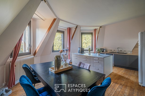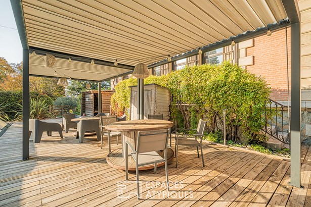 Outside, the terrace opens onto a vast landscaped park with protected tree species, a true haven of nature in the heart of the city, just steps from shops, schools, and the train station. An outdoor swimming pool completes the property, providing a perfect place to relax in all seasons. A small plot remains available for further development, allowing for the possibility of an additional project depending on your needs.
