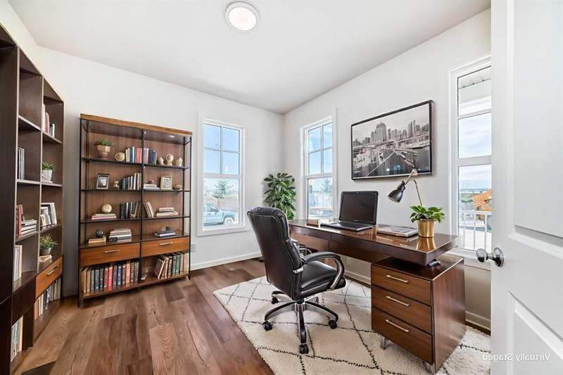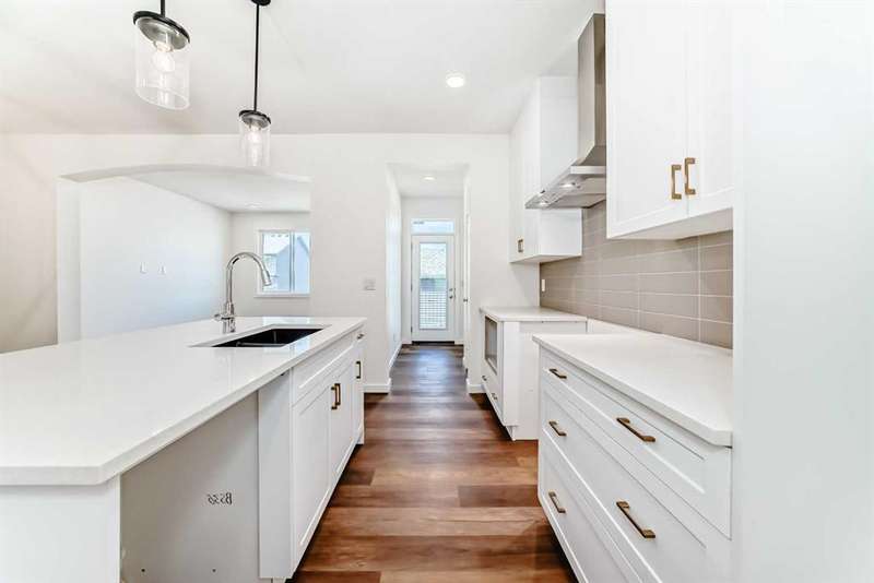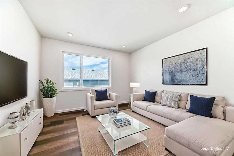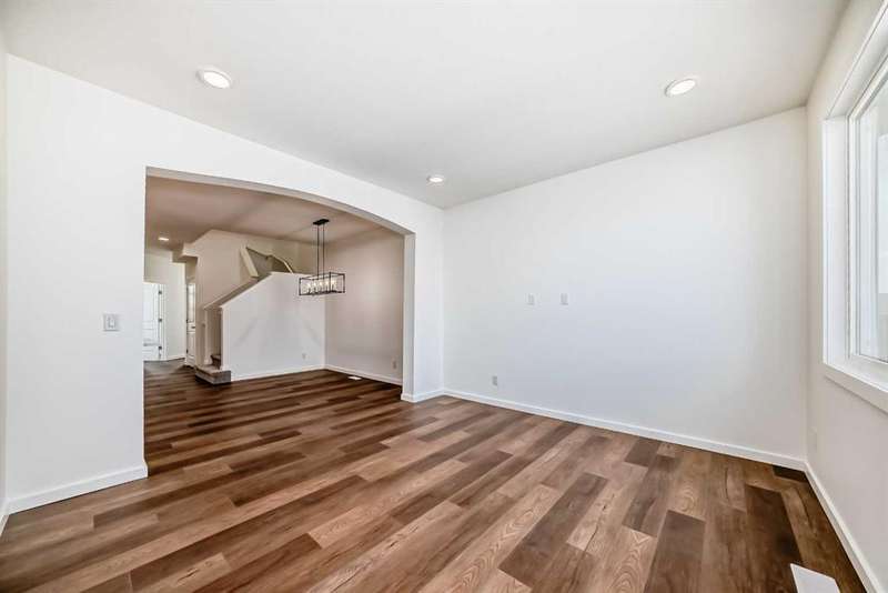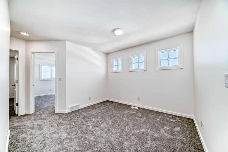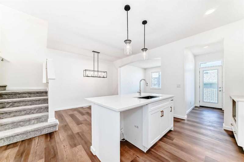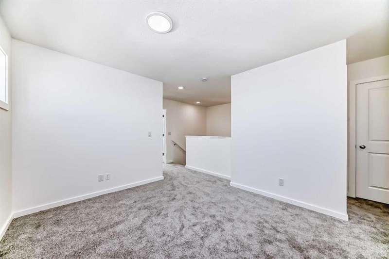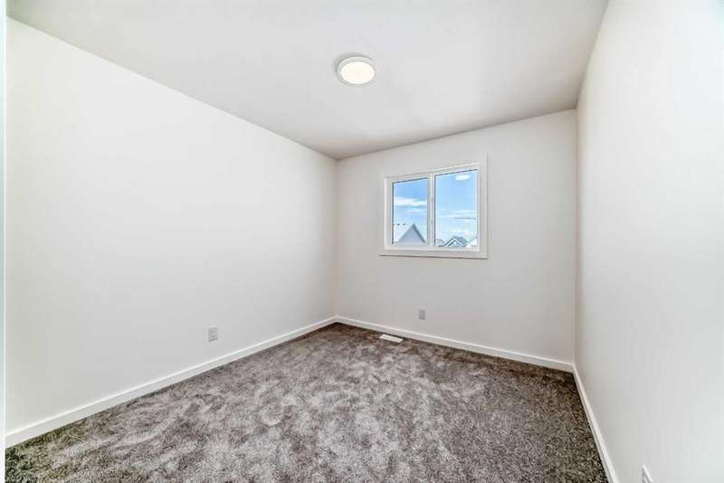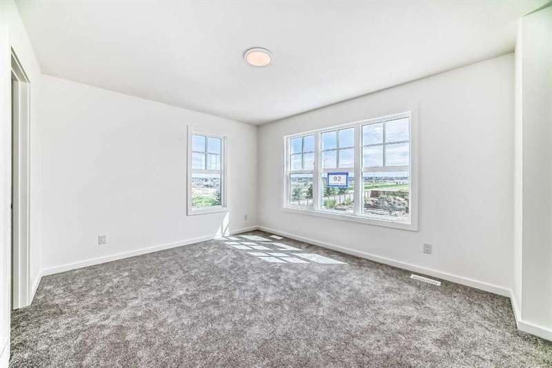 THIS HOME DOESN’T JUST MEET THE STREET—IT TAKES IT OVER, WITH WIDE, FANNED-OUT FRONTAGE THAT TURNS CURB APPEAL INTO A REAL PRESENCE. That unique lot shape gives the full-width porch more impact, distinguishes the home from its neighbours, and leaves you with a yard out front that FEELS GENEROUS instead of token. The geometry doesn’t just frame the house—it redefines how it lives. Inside, this Gregory model from Homes by Avi carries that sense of openness into the main floor. 9’ ceilings, luxury vinyl plank flooring, and a LARGE FRONT-FACING DEN give the entry sequence both polish and purpose. Sightlines run from the living room through to the kitchen and dining area, keeping each space connected without feeling crowded. The kitchen balances form and function with QUARTZ COUNTERS, 42" upper cabinets, a CHIMNEY HOOD FAN, Whirlpool appliances, and a gas line roughed-in for anyone who prefers cooking on flame. A SIDE ENTRY leads directly to the basement, future-ready with a 9’ foundation and plumbing rough-ins for easy development. Upstairs, a CENTRAL BONUS ROOM separates the secondary bedrooms from the master bedroom at the front of the home. And boy, was that bedroom built to retreat into: a FIVE-PIECE ENSUITE with DUAL SINK VANITY, a GLASS ENCLOSED SHOWER, and a SOAKING TUB that invites both ritual and relaxation. Quartz carries through every bathroom, and luxury vinyl tile makes weekend clean-up easy. Laundry is placed with intent on the upper level, streamlining daily routines and cutting out the back-and-forth. Back outside, the lot comes into play again. The broad front span offers a sense of scale and flexibility for landscaping or play, while the rear lane still provides convenience with a 20’ x 20’ gravel parking pad—ready for vehicles now and set for a future garage later. A gas line to the rear deck extends BBQ season, and sod in the front yard is also included. All of this is set in Starling, a northwest community designed with a nature-first mindset. PATHWAYS, PONDS, AND WIDE-OPEN SKIES define the plan, and the community emphasizes sustainable landscaping and glowing walkways. Add in QUICK ACCESS TO STONEY TRAIL, and you’ve got a setting that feels both tucked away and well within reach. Quick possession is available, so you don’t have to wait to CLAIM BOTH THE HOME AND THE UNIQUE LOT THAT SET IT APART. Book a showing and see for yourself what a front yard SHOULD be. • PLEASE NOTE: Photos are of a DIFFERENT Spec Home of the same model – fit and finish may differ. Interior selections and floorplans shown in photos.