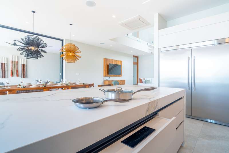 · A chef’s kitchen with Invisacook induction and double stainless refrigerators.