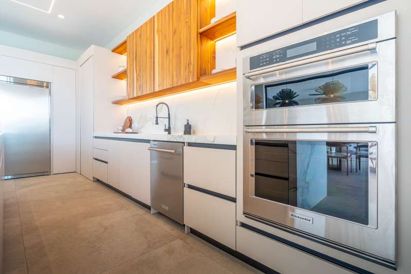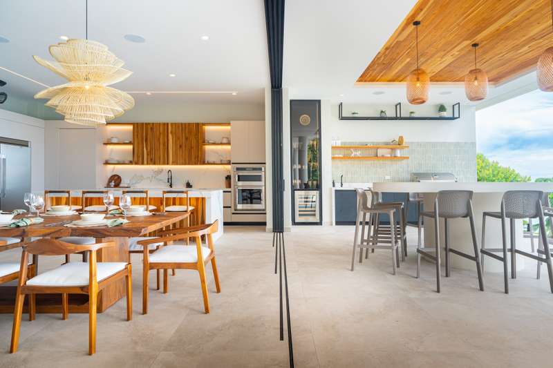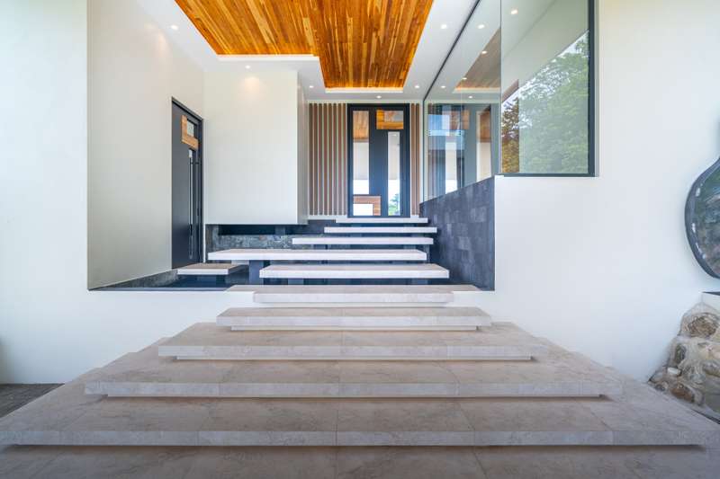 A custom pivoting steel door opens to a shimmering pond water feature, a tranquil prelude to the wonders within. The floating staircase, masterfully crafted elevates you into the expansive residence. From the moment you step inside, the villa reveals its artistry: entire walls of custom fabricated minimalist glass retract to erase boundaries, uniting the refined interiors with the sweeping deck, the infinity-edge saltwater pool, and the endless horizon of the Pacific Ocean.